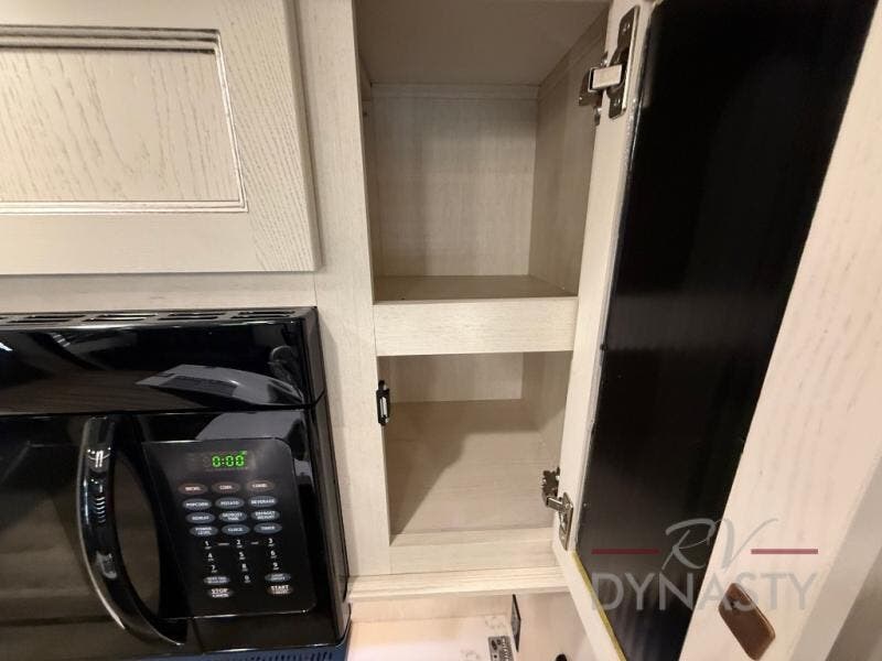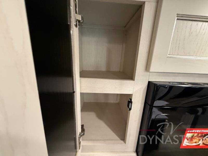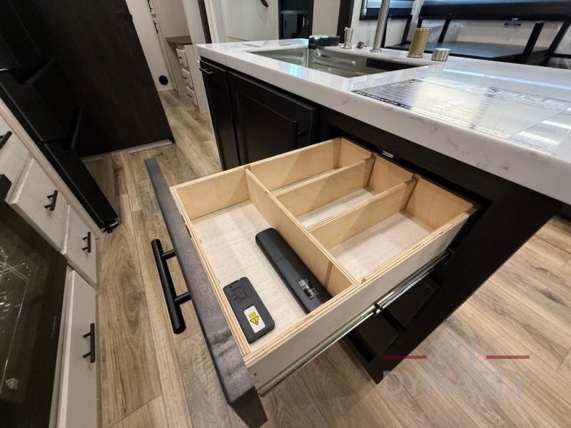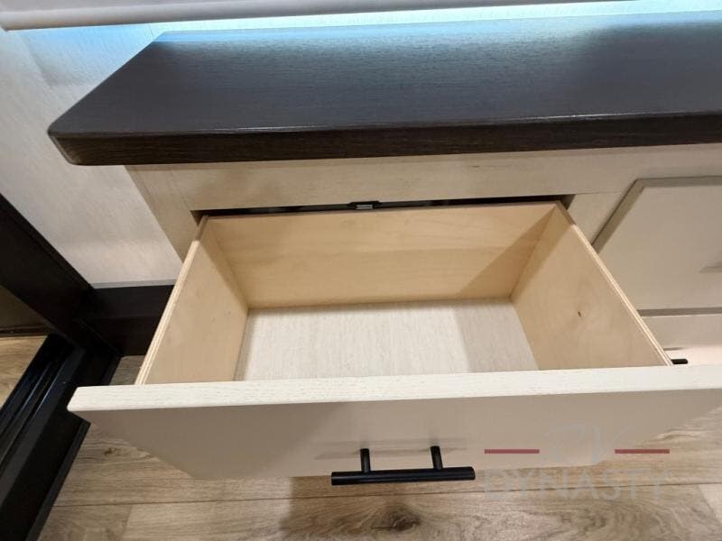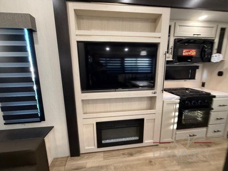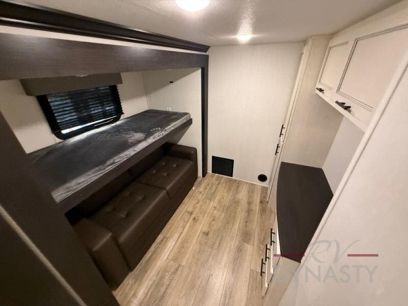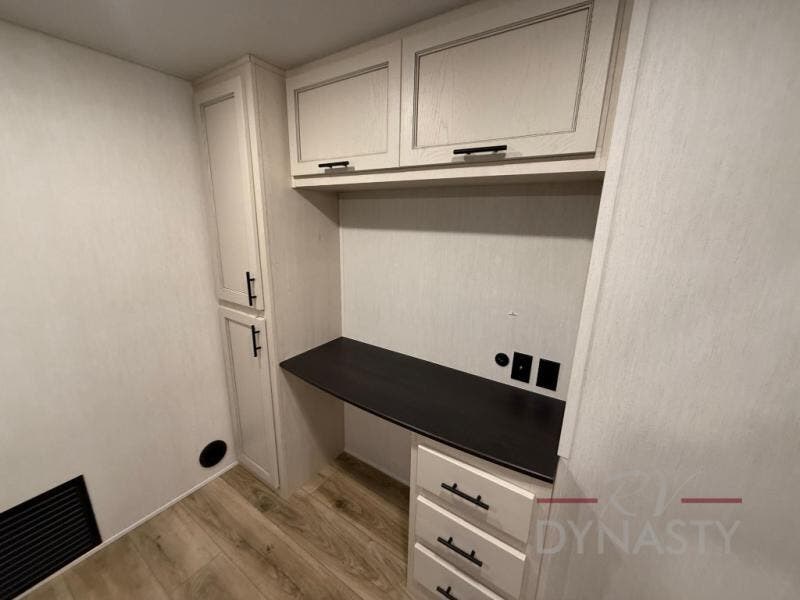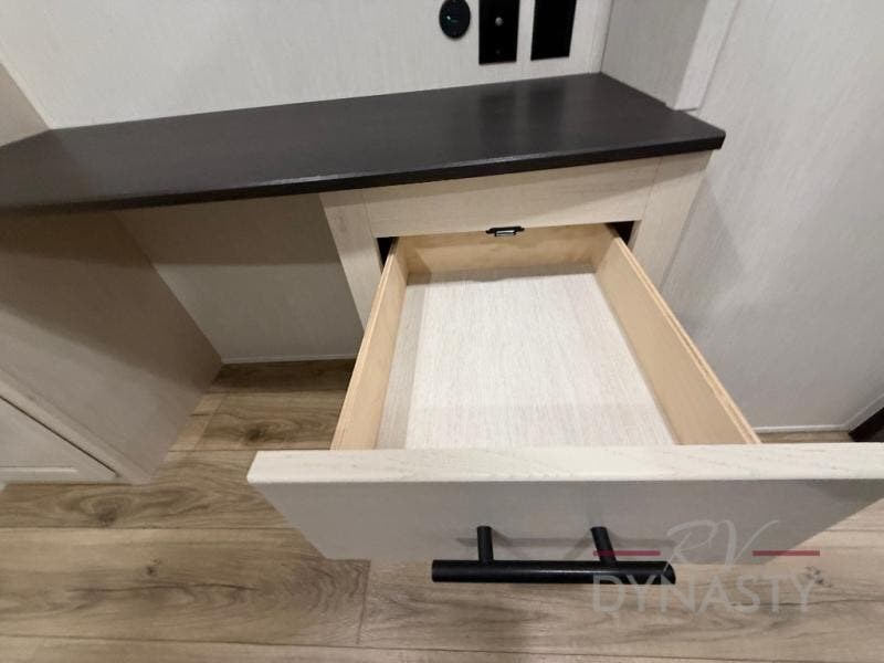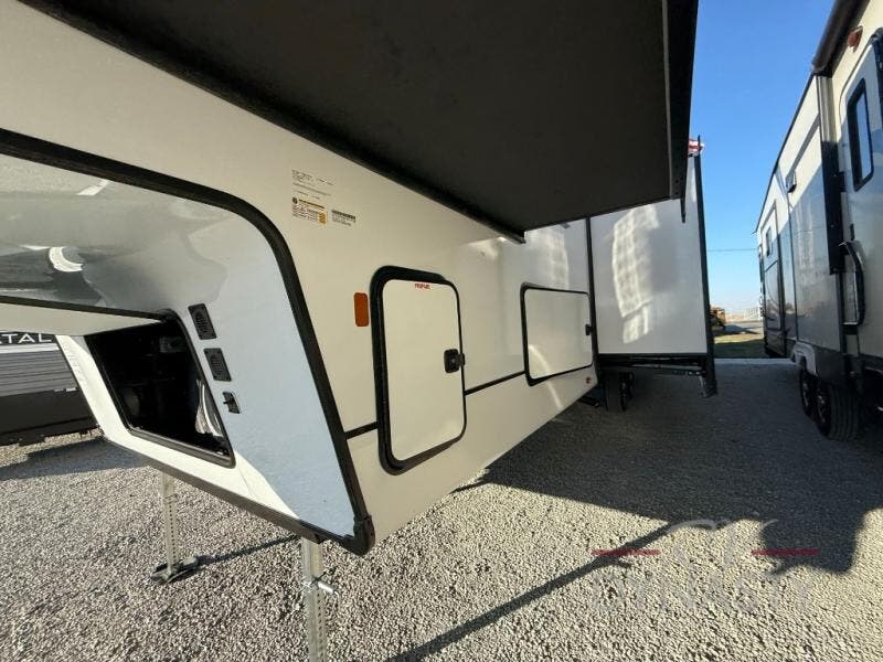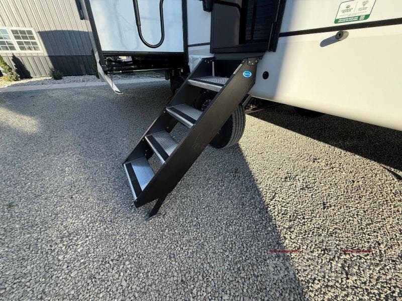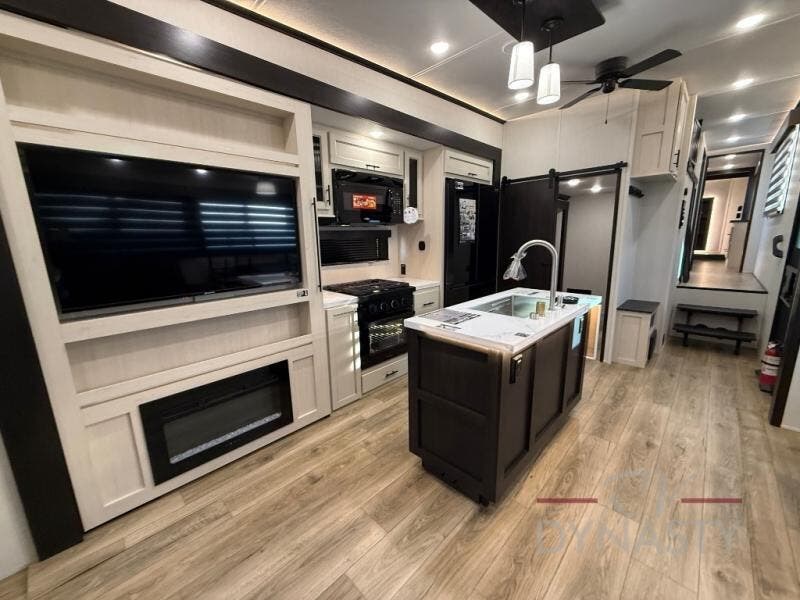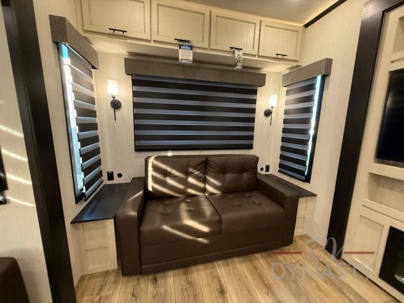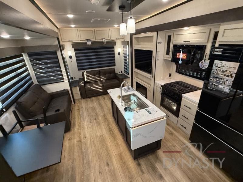 There is much to love in this fifth wheel! Starting with the second bedroom which has a slide that houses a flip-up bunk above a tri-fold sofa across from a desk with drawers, a drop zone, and a wardrobe, plus above all of that is a storage/bunk loft. The rear living area includes a tri-fold sofa, a TV with a hidden pantry behind, and theater seating for two making this space another area at night for guests. In the morning, you can prepare breakfast on the kitchen island, then dine together at the versatile dinette/desk. The full bath will allow you to stay clean throughout your trip, and you'll feel right at home in the front private bedroom with a camper king bed, a dresser, and front wardrobe. Outside, a kitchen and two power awnings create an inviting space!