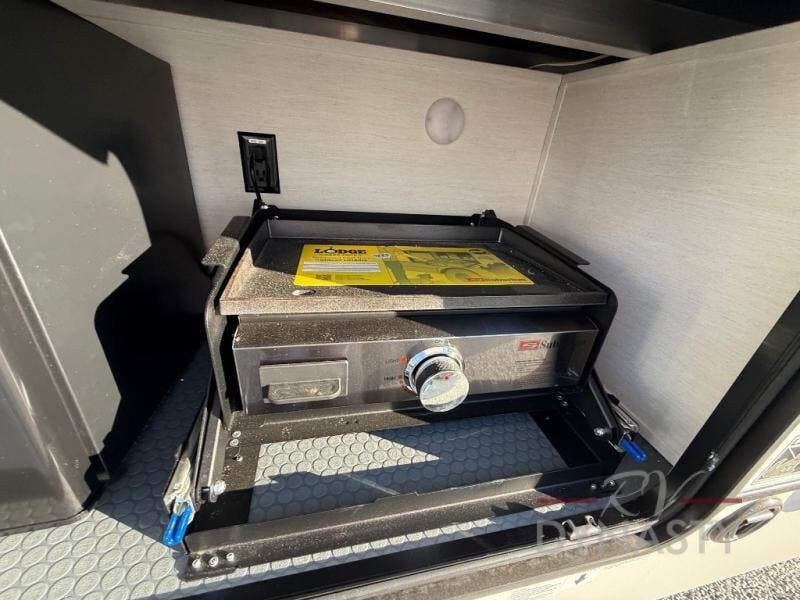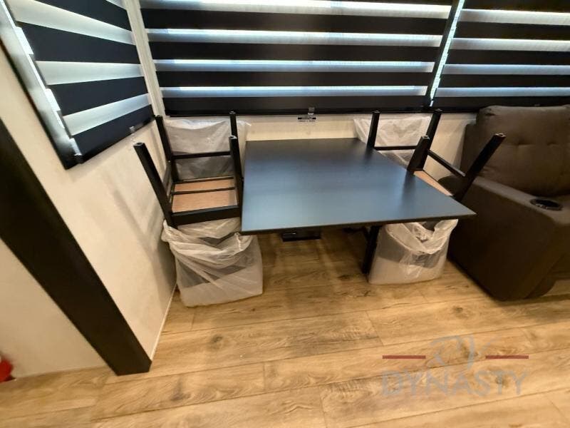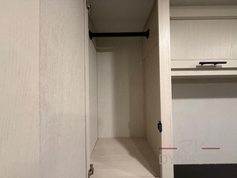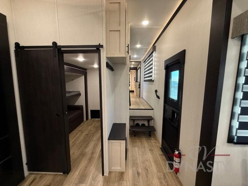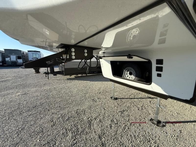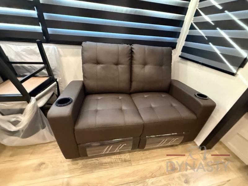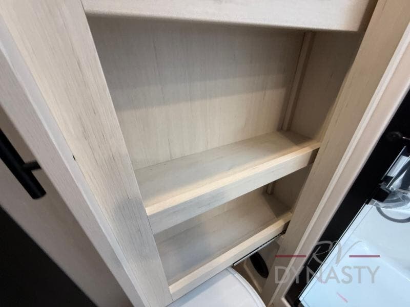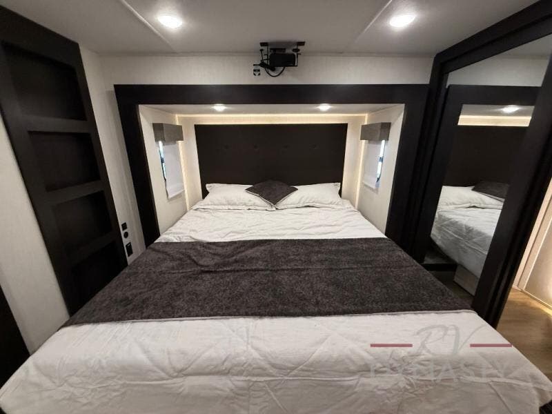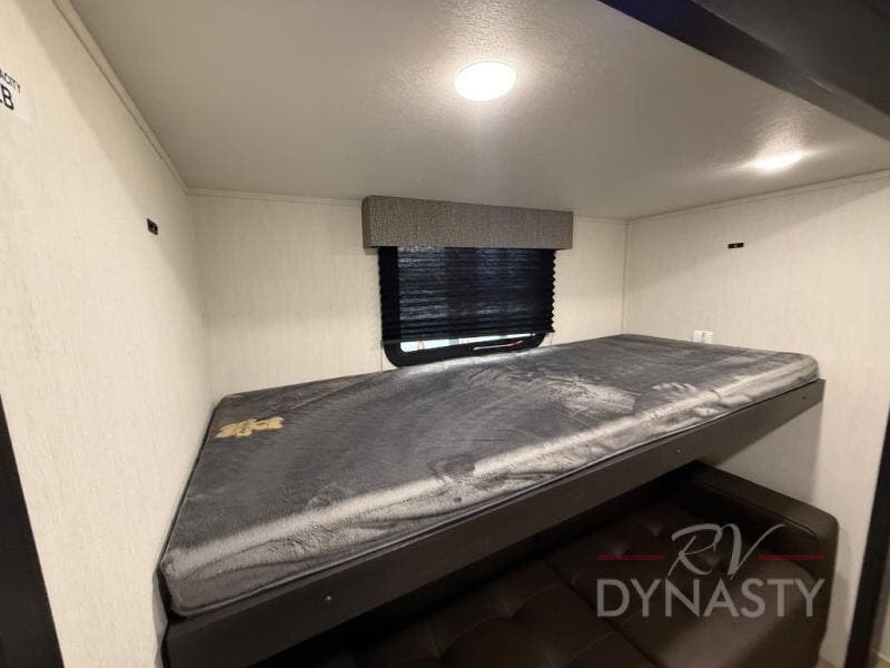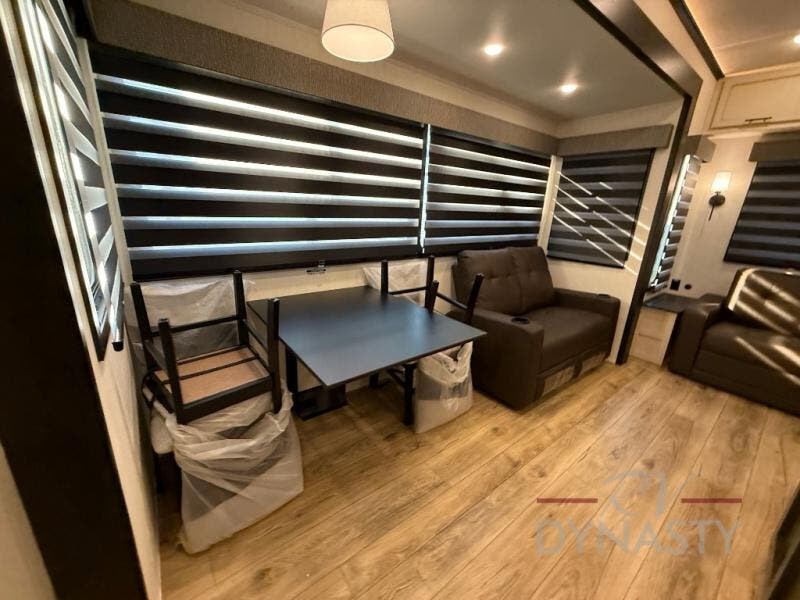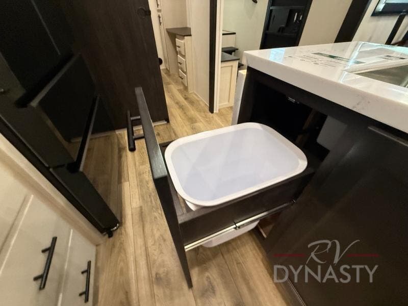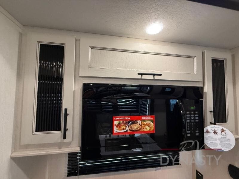There is much to love in this fifth wheel! Starting with the second bedroom which has a slide that houses a flip-up bunk above a tri-fold sofa across from a desk with drawers, a drop zone, and a wardrobe, plus above all of that is a storage/bunk loft. The rear living area includes a tri-fold sofa, a TV with a hidden pantry behind, and theater seating for two making this space another area at night for guests. In the morning, you can prepare breakfast on the kitchen island, then dine together at the versatile dinette/desk. The full bath will allow you to stay clean throughout your trip, and you'll feel right at home in the front private bedroom with a camper king bed, a dresser, and front wardrobe. Outside, a kitchen and two power awnings create an inviting space!