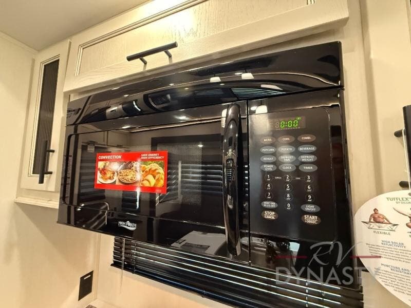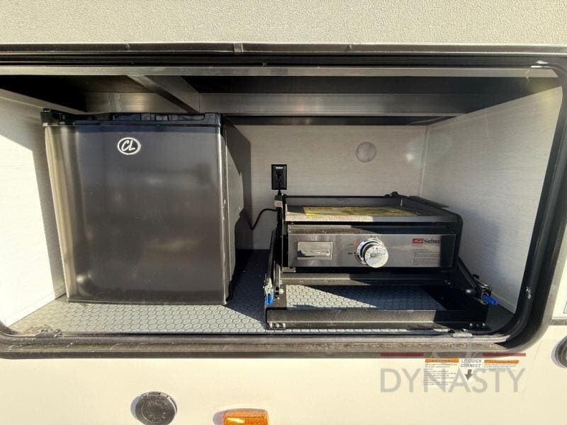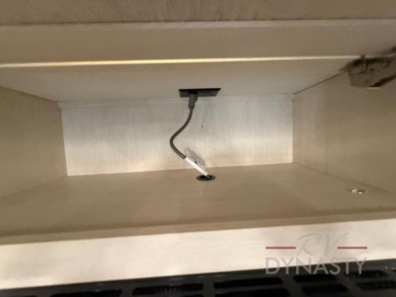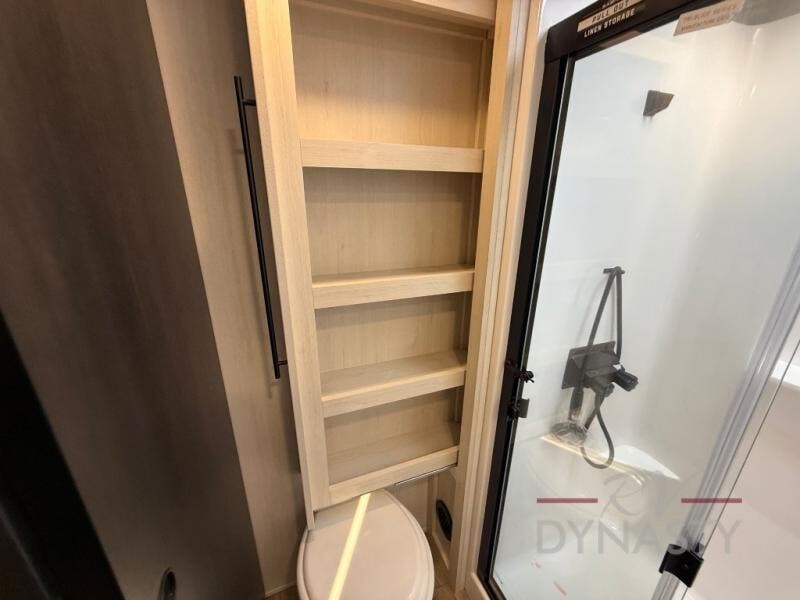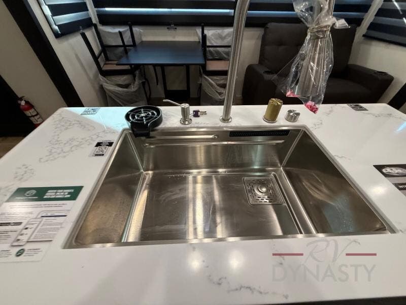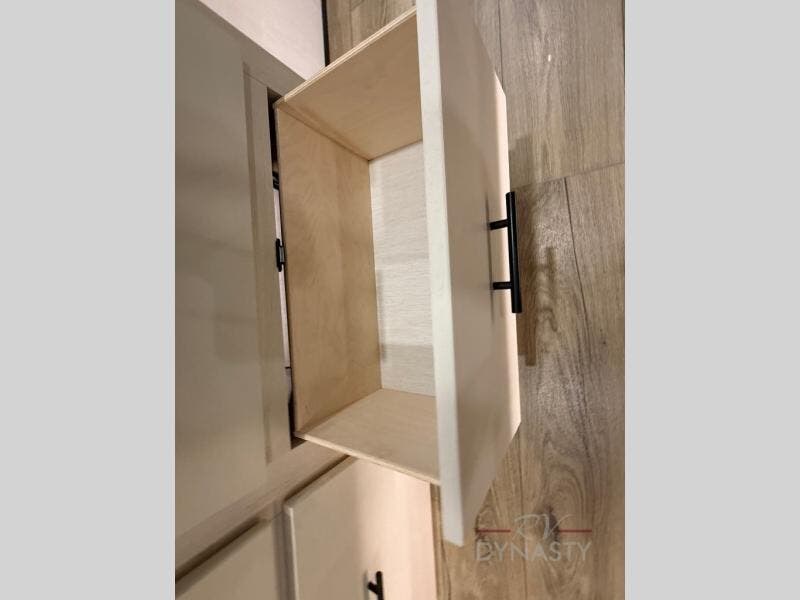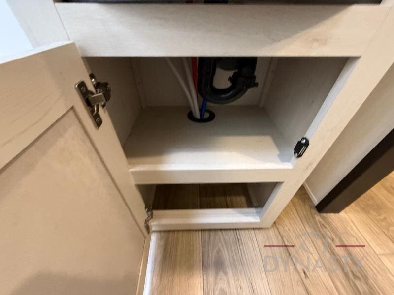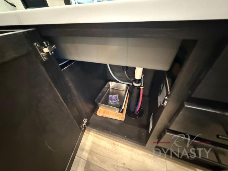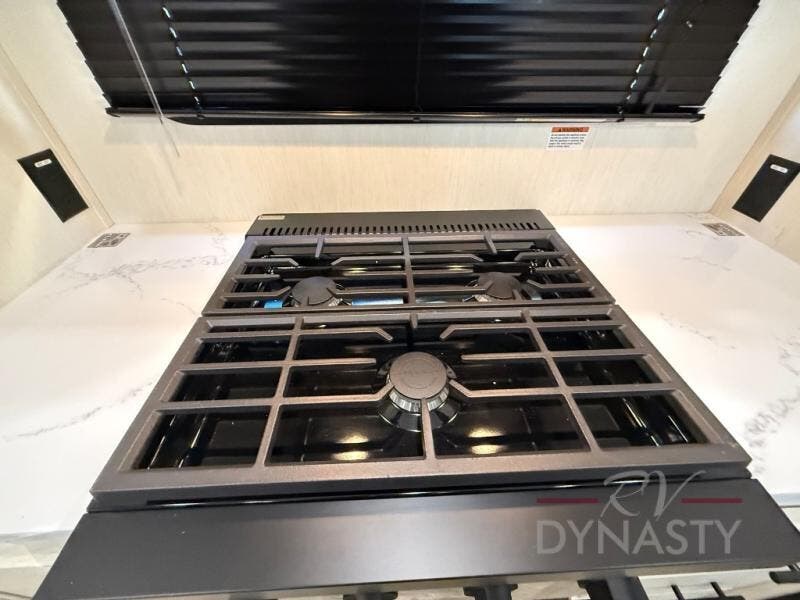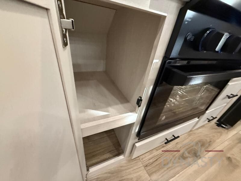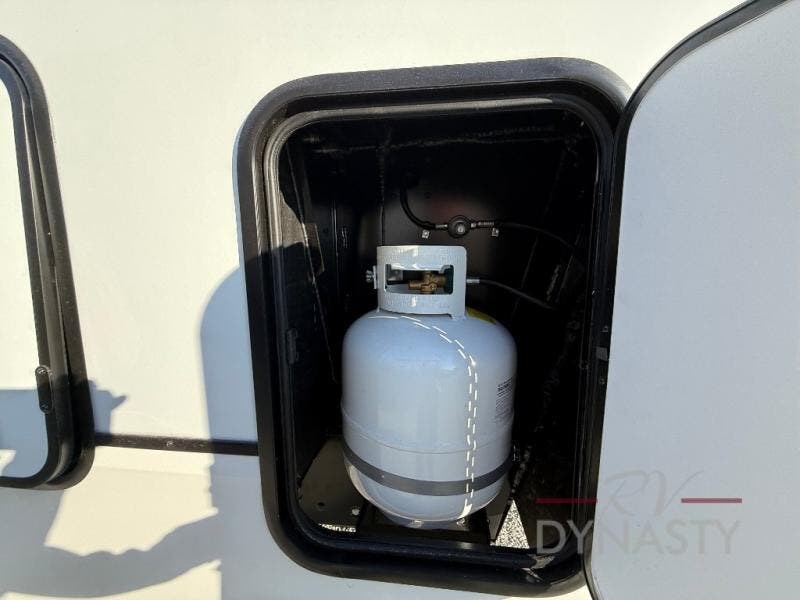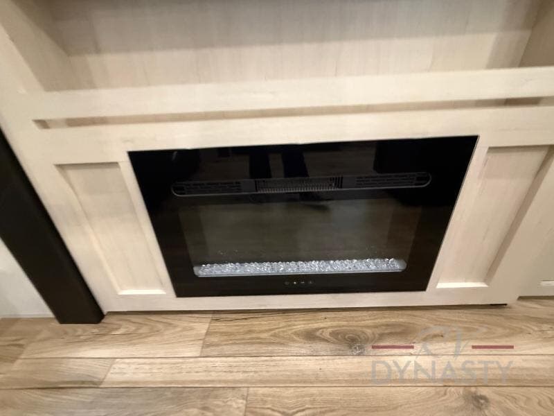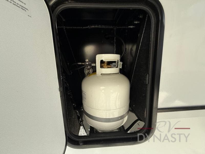 There is much to love in this fifth wheel! Starting with the second bedroom which has a slide that houses a flip-up bunk above a tri-fold sofa across from a desk with drawers, a drop zone, and a wardrobe, plus above all of that is a storage/bunk loft. The rear living area includes a tri-fold sofa, a TV with a hidden pantry behind, and theater seating for two making this space another area at night for guests. In the morning, you can prepare breakfast on the kitchen island, then dine together at the versatile dinette/desk. The full bath will allow you to stay clean throughout your trip, and you'll feel right at home in the front private bedroom with a camper king bed, a dresser, and front wardrobe. Outside, a kitchen and two power awnings create an inviting space!