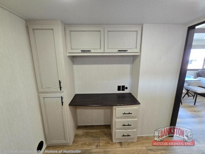 There is much to love in this fifth wheel! Starting with the second bedroom which has a slide that houses a flip-up bunk above a tri-fold sofa across from a desk with drawers, a drop zone, and a wardrobe, plus above all of that is a storage/bunk loft. The rear living area includes a tri-fold sofa, a TV with a hidden pantry behind, and theater seating for two making this space another area at night for guests. In the morning, you can prepare breakfast on the kitchen island, then dine together at the versatile dinette/desk. The full bath will allow you to stay clean throughout your trip, and you'll feel right at home in the front private bedroom with a camper king bed, a dresser, and front wardrobe. Outside, a kitchen and two power awnings create an inviting space!