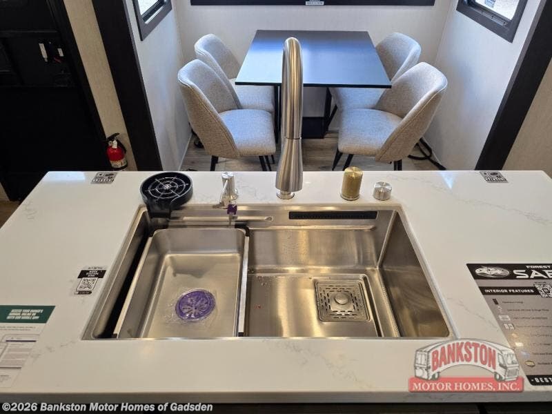This Sabre fifth wheel with a full and half bath is sure to be a crowd pleaser! The front living area is the perfect place for everyone to visit each other comfortably on the two tri-fold sofas that can be transformed into extra sleeping spaces, or at the theater seating for complete relaxation. You will also find an entertainment center with a fireplace and a TV. This Sabre has a kitchen filled with convenient features, such as a residential size refrigerator, a kitchen island, and a kitchen pantry. The rear master suite has access to its very own full bathroom with a double-sink vanity for two to get ready at once, and a wardrobe with washer and dryer prep for convenience!