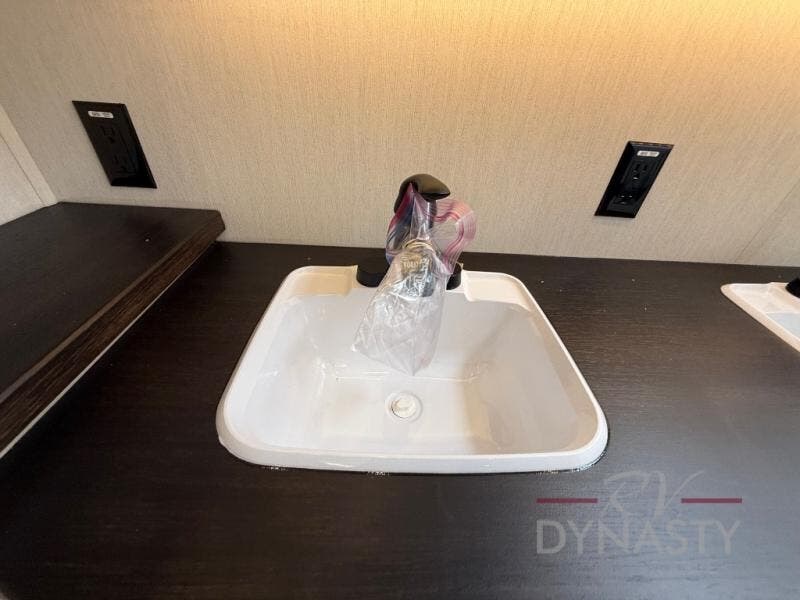 This Sabre fifth wheel with a full and half bath is sure to be a crowd pleaser! The front living area is the perfect place for everyone to visit each other comfortably on the two tri-fold sofas that can be transformed into extra sleeping spaces, or at the theater seating for complete relaxation. You will also find an entertainment center with a fireplace and a TV. This Sabre has a kitchen filled with convenient features, such as a residential size refrigerator, a kitchen island, and a kitchen pantry. The rear master suite has access to its very own full bathroom with a double-sink vanity for two to get ready at once, and a wardrobe with washer and dryer prep for convenience!