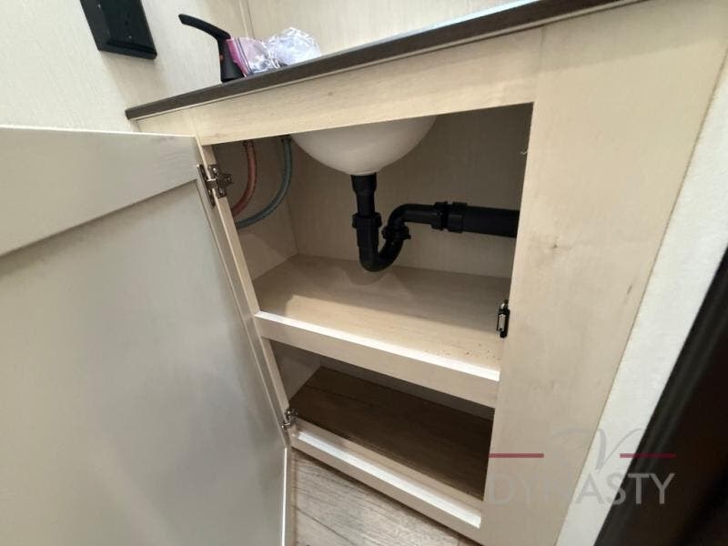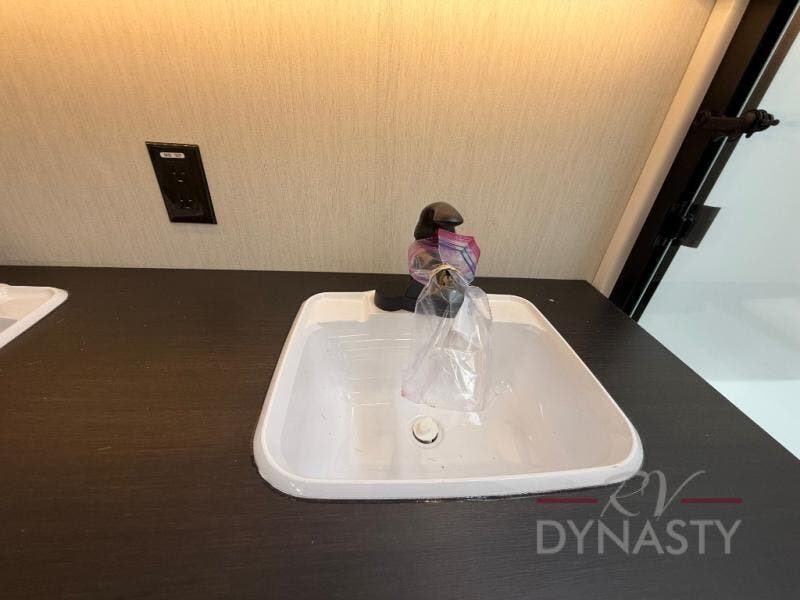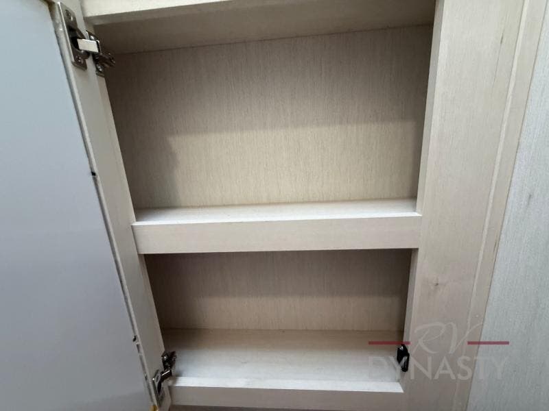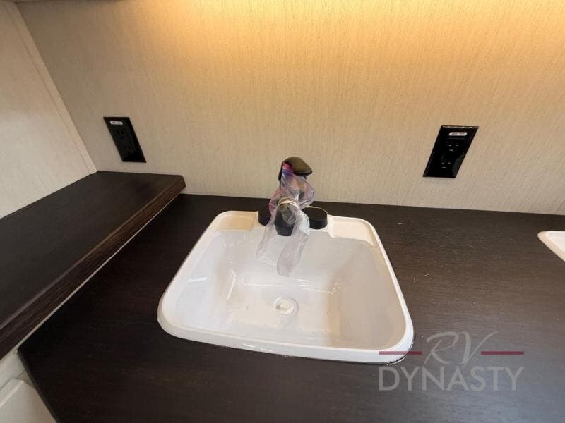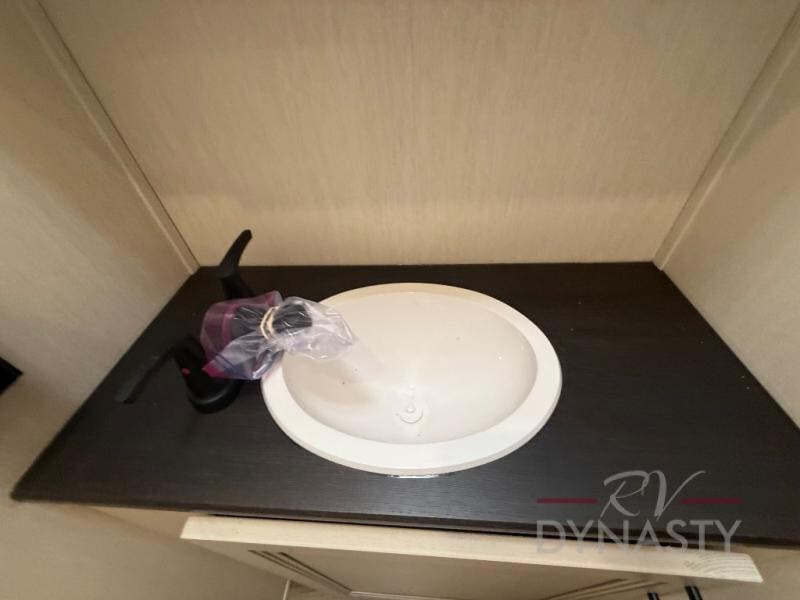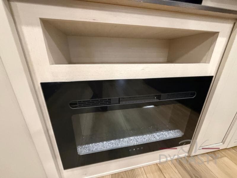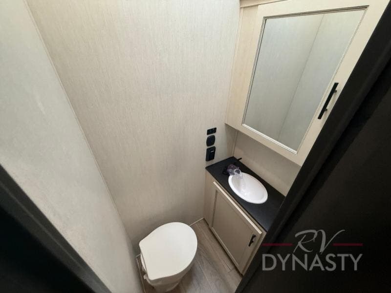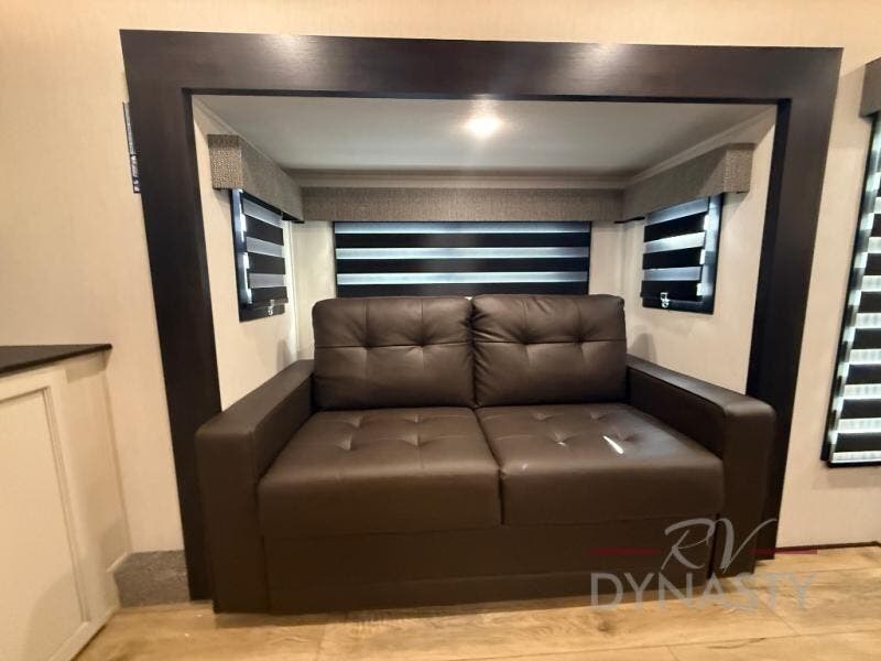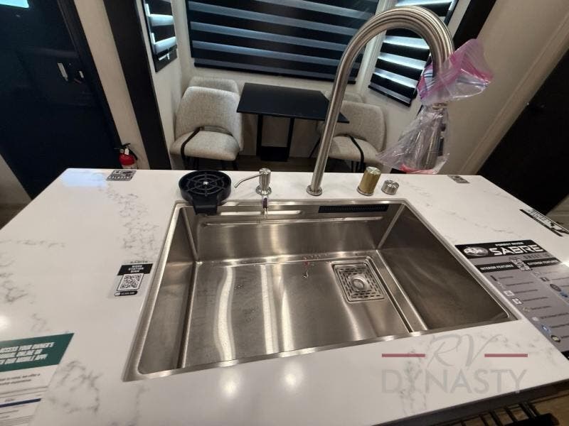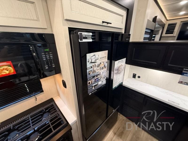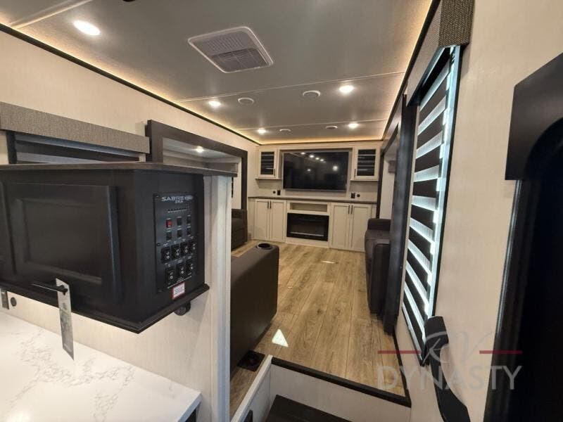 This Sabre fifth wheel with a full and half bath is sure to be a crowd pleaser! The front living area is the perfect place for everyone to visit each other comfortably on the two tri-fold sofas that can be transformed into extra sleeping spaces, or at the theater seating for complete relaxation. You will also find an entertainment center with a fireplace and a TV. This Sabre has a kitchen filled with convenient features, such as a residential size refrigerator, a kitchen island, and a kitchen pantry. The rear master suite has access to its very own full bathroom with a double-sink vanity for two to get ready at once, and a wardrobe with washer and dryer prep for convenience!
