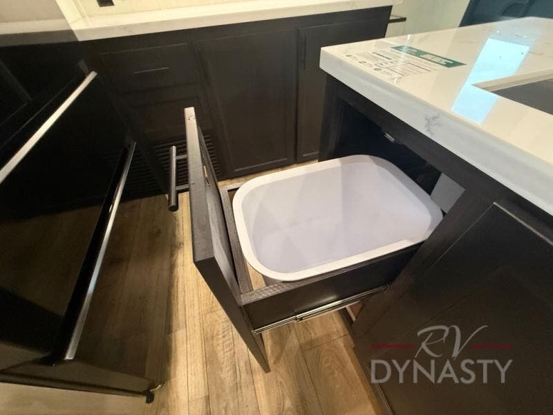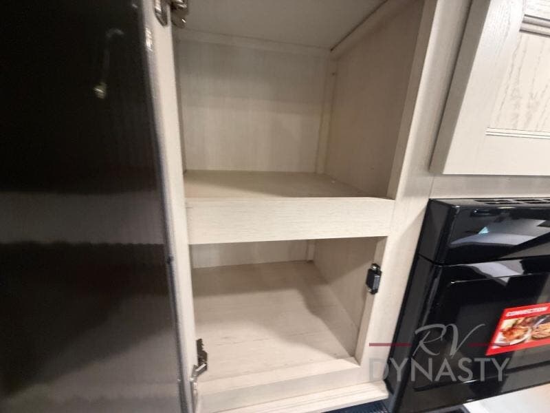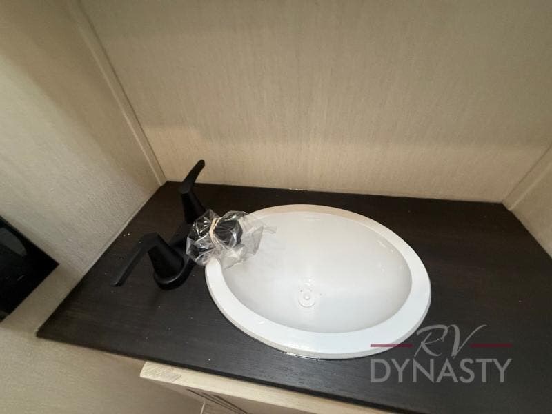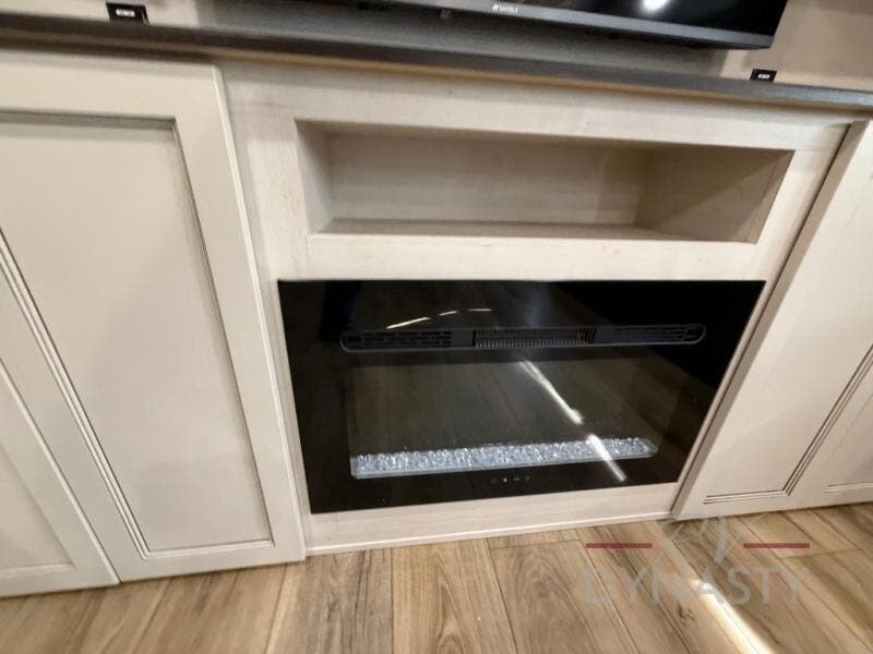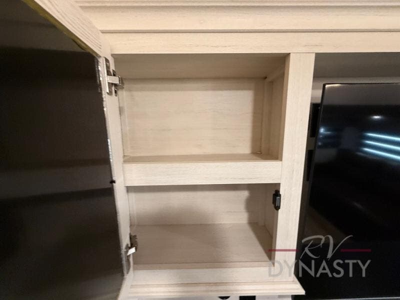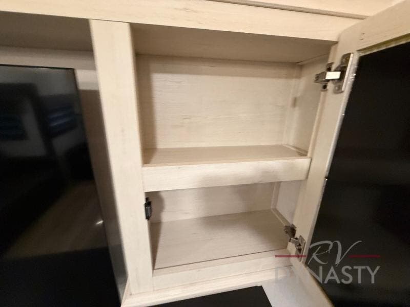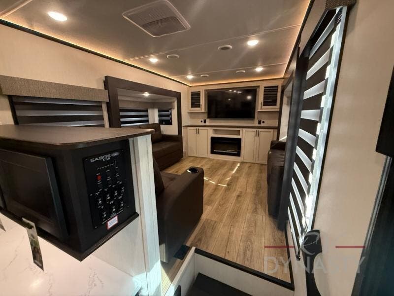 This Sabre fifth wheel with a full and half bath is sure to be a crowd pleaser! The front living area is the perfect place for everyone to visit each other comfortably on the two tri-fold sofas that can be transformed into extra sleeping spaces, or at the theater seating for complete relaxation. You will also find an entertainment center with a fireplace and a TV. This Sabre has a kitchen filled with convenient features, such as a residential size refrigerator, a kitchen island, and a kitchen pantry. The rear master suite has access to its very own full bathroom with a double-sink vanity for two to get ready at once, and a wardrobe with washer and dryer prep for convenience!