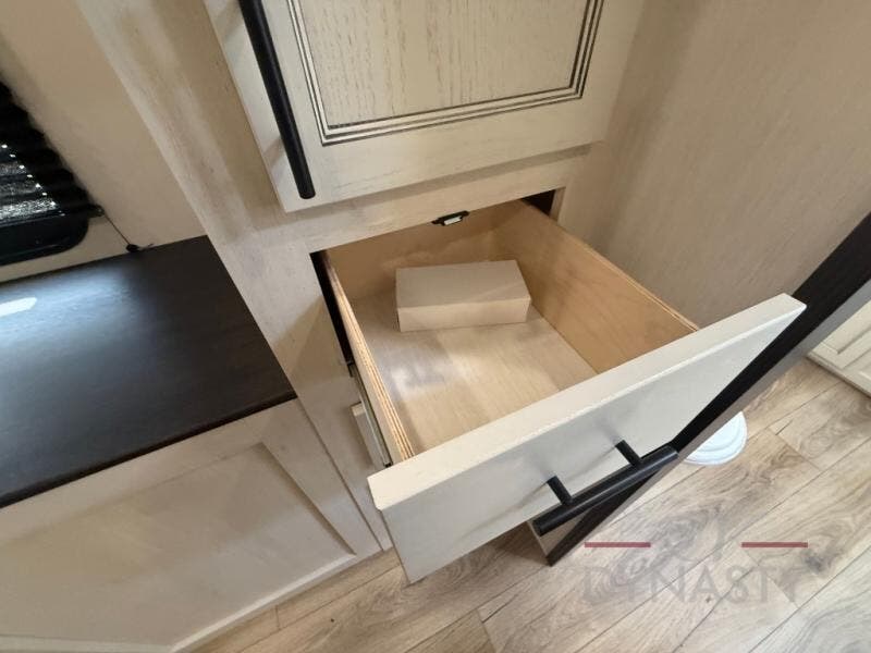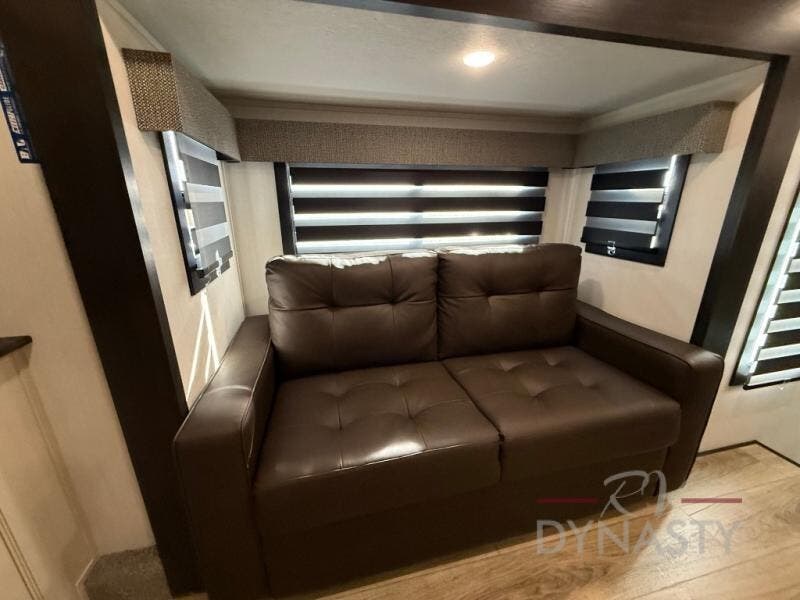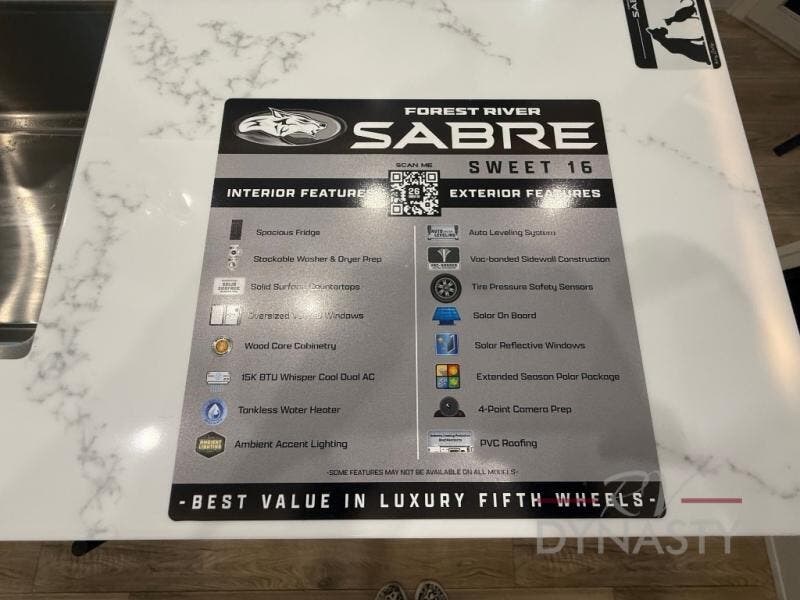 You will experience luxurious camping trips at an affordable price with any one of these Forest River Cherokee Sabre fifth wheels! These models are durable and ready to travel anytime of the year thanks to features like the high-gloss gel-coat front cap with LED lighting, the PVC roof membrane, and the forced air underbelly with enclosed gate valves. The electric auto-leveling system makes setting up easy and safe, and the adjustable power awning with LED lighting will create an inviting outdoor living space. Each model includes a universal docking station which includes a black tank flush and an outside shower, and adjustable stable steps for you to enter and exit the unit safely. Inside, you will love the design of the ambient accent lighting in the living area, the real wood lumbercore cabinetry, and the linoleum flooring!