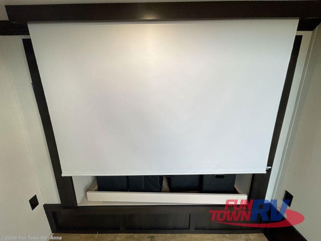 This is the perfect fifth wheel if you enjoy camping with friends and family! You'll have the front private bedroom with a camper king bed slide all to yourselves, while your guests take the rear den. There is a tri-fold sofa here, along with a wardrobe with a desk, additional shelves plus a loft above this room for even more sleeping or storage space! The main living room features an L-shaped sectional sofa, a fireplace and an entertainment center. And the patio deck with a 12' awning is right off of this room so you can visit with friends indoors or outdoors! There is generous counter space in the full kitchen, along with a pull-out storage drawer and a versatile dinette/desk. There are many more stand-out features found in this fifth wheel, including washer and dryer prep in the front bedroom, a 70" projector screen in the rear den, a second power awning, and the list goes on!