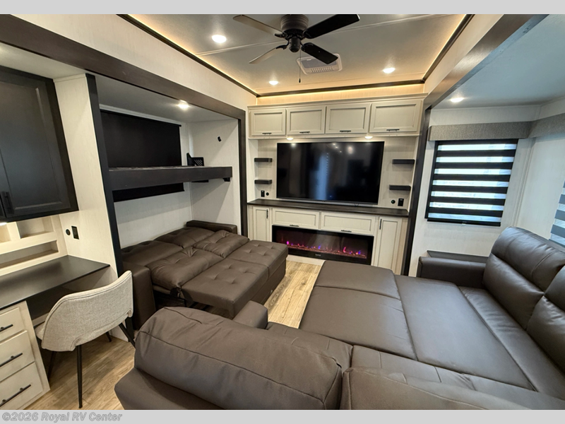 This fifth wheel's got it all! You've got a cozy rear living area with a fireplace, entertainment center, tri fold sofa, and sectional sofa - perfect for relaxing with family and friends. The kitchen is equipped with a TV, fridge, microwave, and a kitchen island with chairs for casual dining. There's a full bath, plus a half bath up front for added convenience. The front bedroom is a retreat, featuring a camp king bed, dresser, and wardrobes. And don't forget the bunk bed - it's gonna be a hit with the kids!