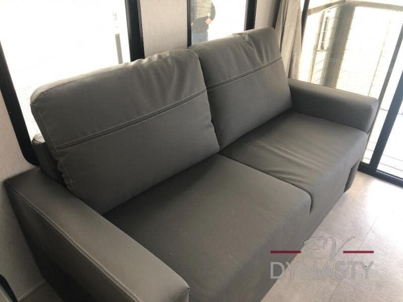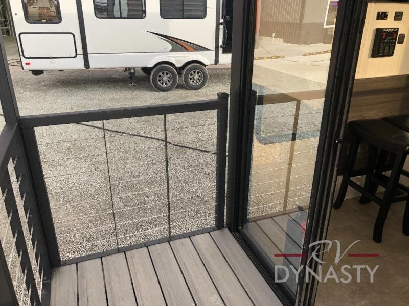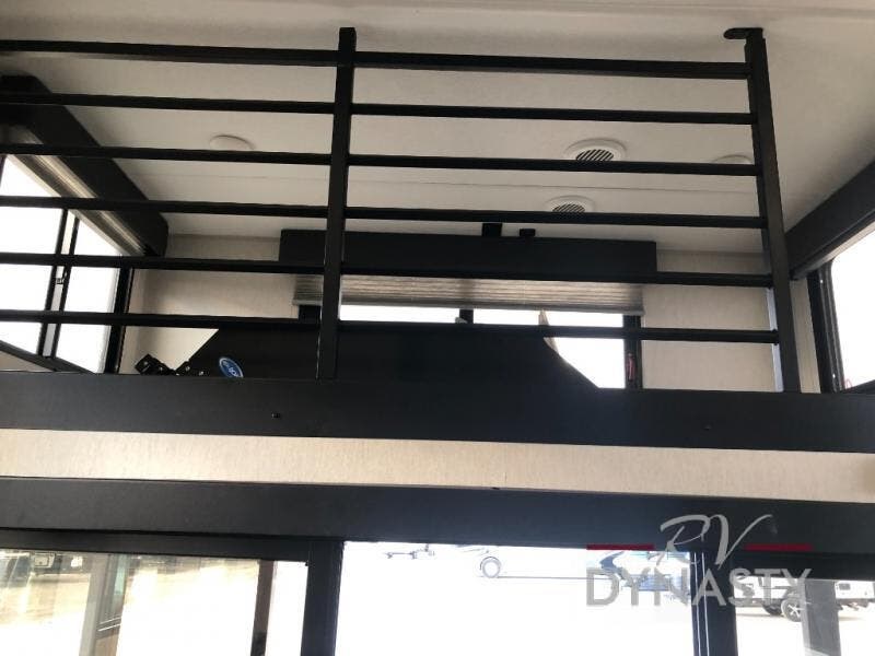 You will fall in love with this mini-loft destination trailer that will feel more like a tiny home. There are steps leading up to the loft with a queen bed, cabinets, and even a fireplace! The kitchen includes a cooktop and a microwave oven to prepare meals, plus a refrigerator to keep perishables fresh. You'll enjoy relaxing on the hide-a-bed sofa, dining at the high top table, or reading a book on the lounge chair. There is also a rear deck with patio doors where you can spend your evenings together, and there is even a second loft above the deck for added sleeping or storage space!