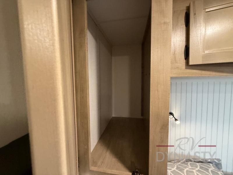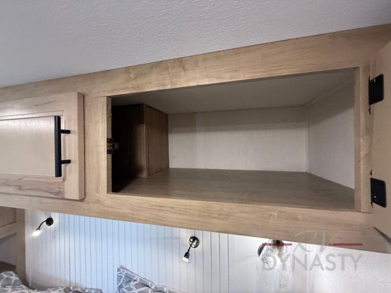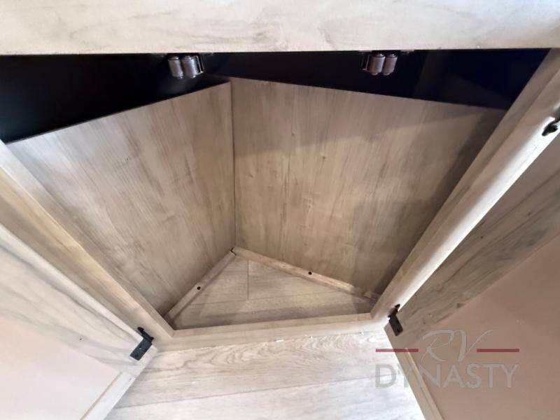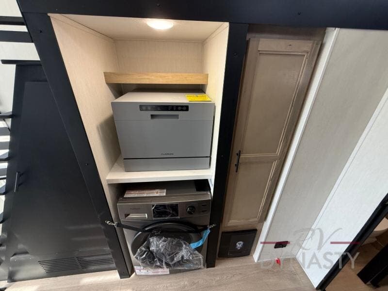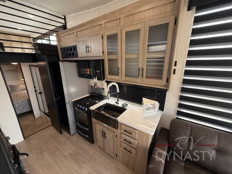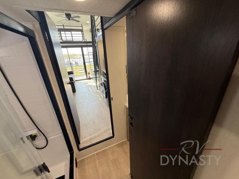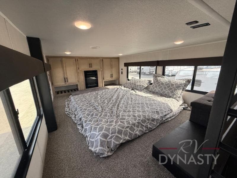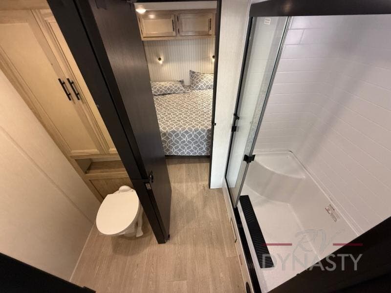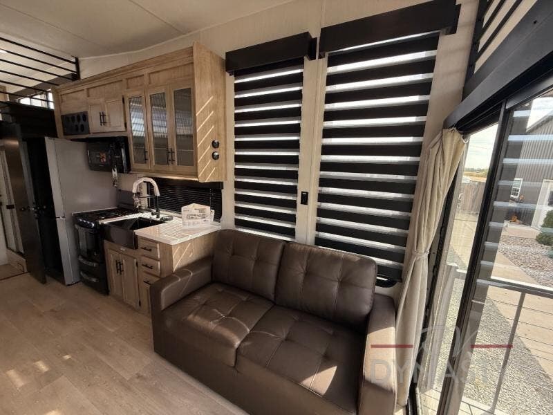 This model is similar to 16ML but larger! A bigger bathroom, king bed in the lower master, and a queen bed plus a twin bunk mat in the front loft. There is an 18 cu. ft. refrigerator so you can stock up for a week long vacation, a hide-a-bed sofa that can transform into added sleeping for guests, and a high top table with two stools to dine at. A ladder allows access into the upper front loft that is over the covered patio. The bathroom below is split with a shower on one side, and a private toilet area and sink opposite. And the view is amazing from just about anywhere inside.