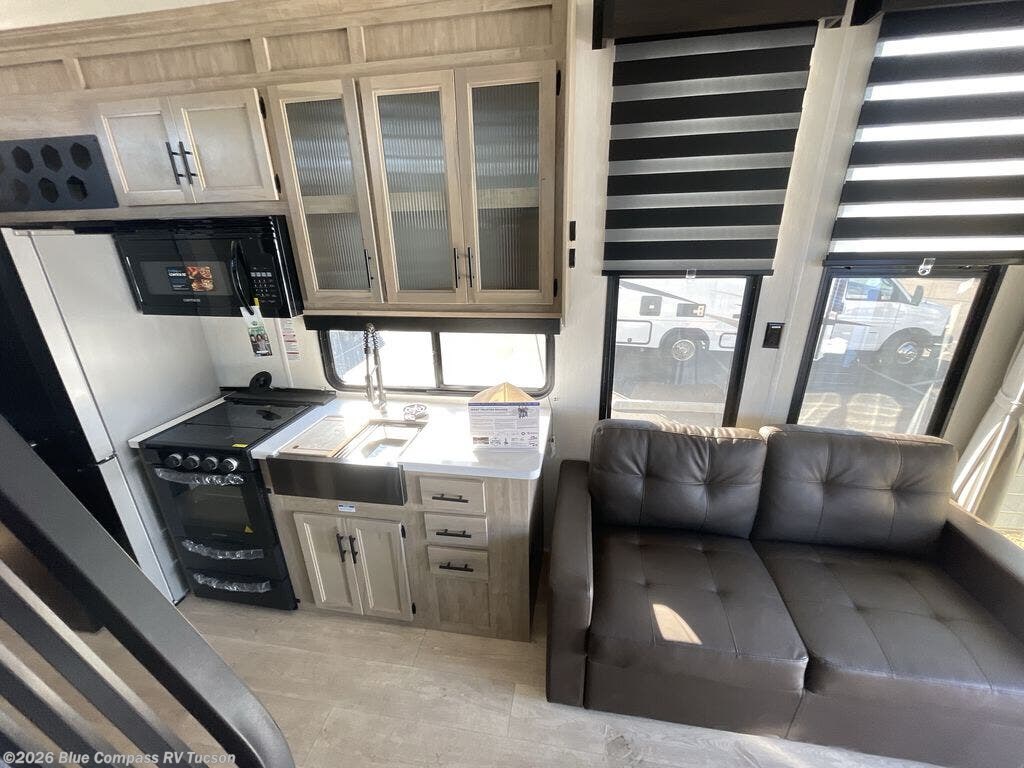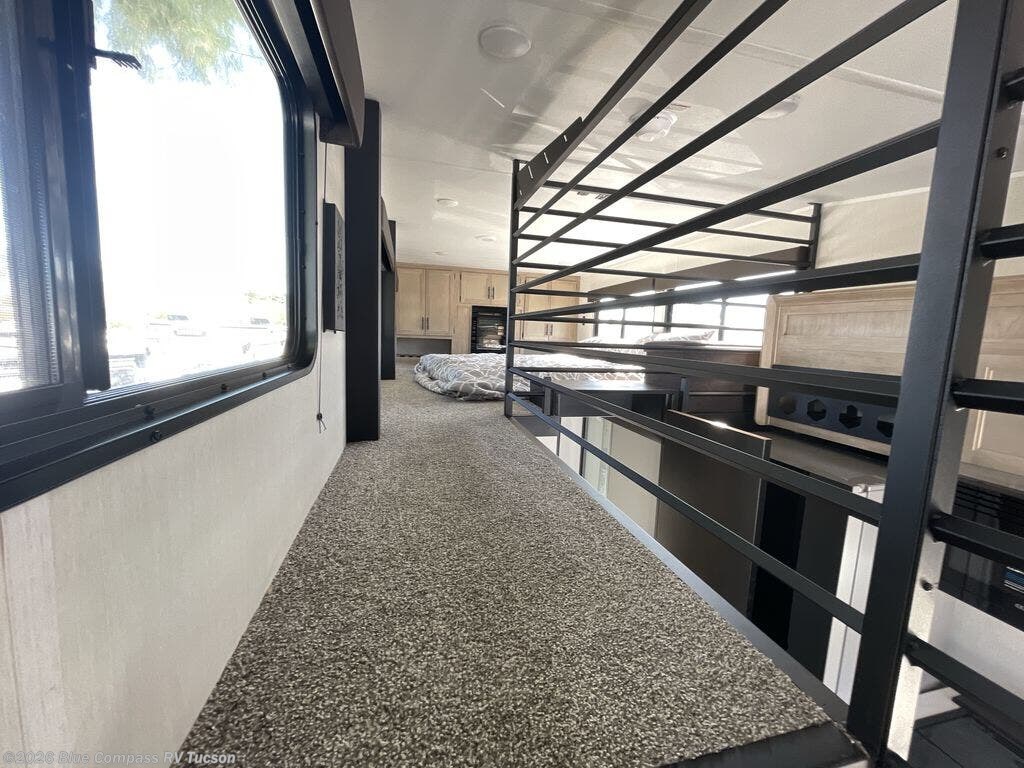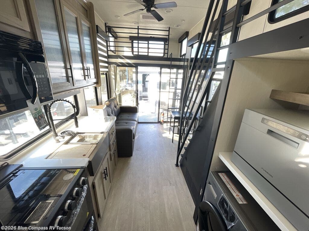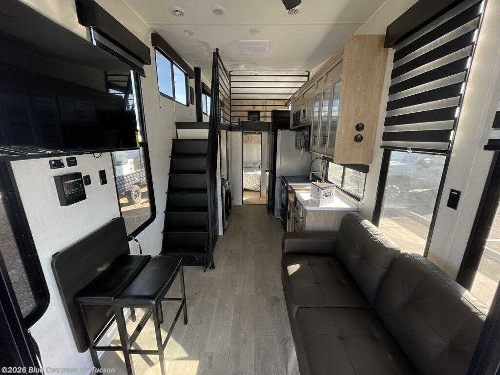 This model is similar to 16ML but larger! A bigger bathroom, RV king bed in the lower master, and a queen bed plus a twin bunk mat in the front loft. And the second loft can be utilized as extra sleeping space or storage space! There is an 18 cu. ft. refrigerator so you can stock up for a week long vacation, a hide-a-bed sofa that can transform into added sleeping for guests, and a high top table with two stools to dine at. The bathroom below is split with a shower on one side, and a private toilet area and sink opposite. And the view is amazing from just about anywhere inside.