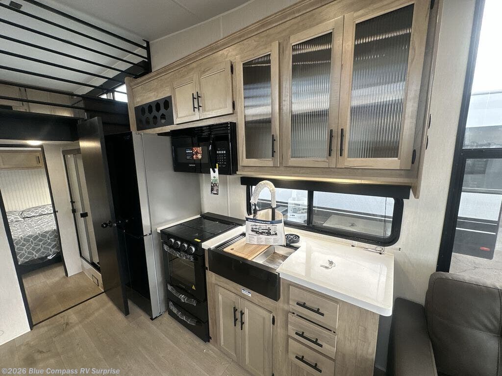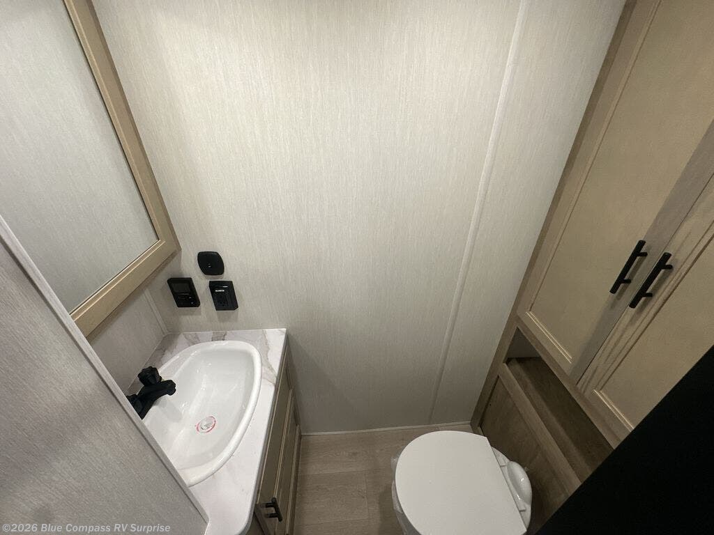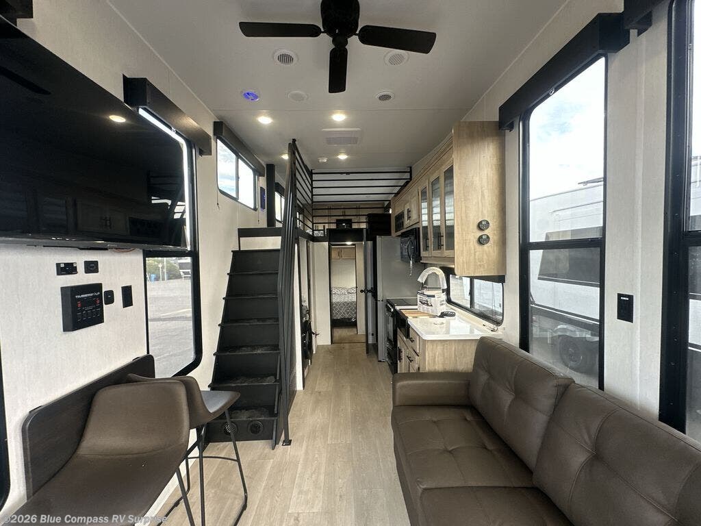 This model is similar to 16ML but larger! A bigger bathroom, RV king bed in the lower master, and a queen bed plus a twin bunk mat in the front loft. And the second loft can be utilized as extra sleeping space or storage space! There is an 18 cu. ft. refrigerator so you can stock up for a week long vacation, a hide-a-bed sofa that can transform into added sleeping for guests, and a high top table with two stools to dine at. The bathroom below is split with a shower on one side, and a private toilet area and sink opposite. And the view is amazing from just about anywhere inside.