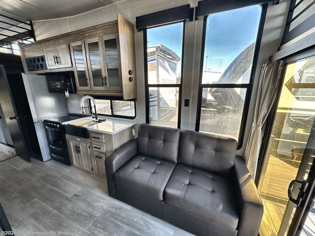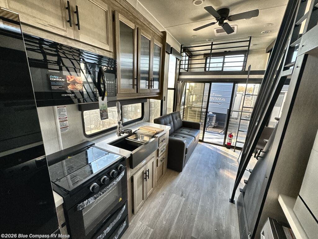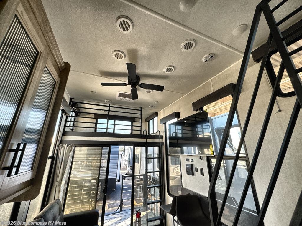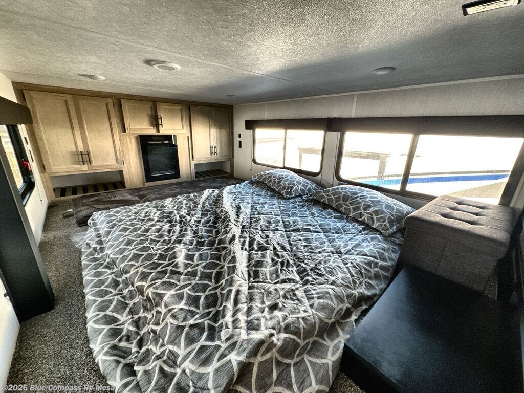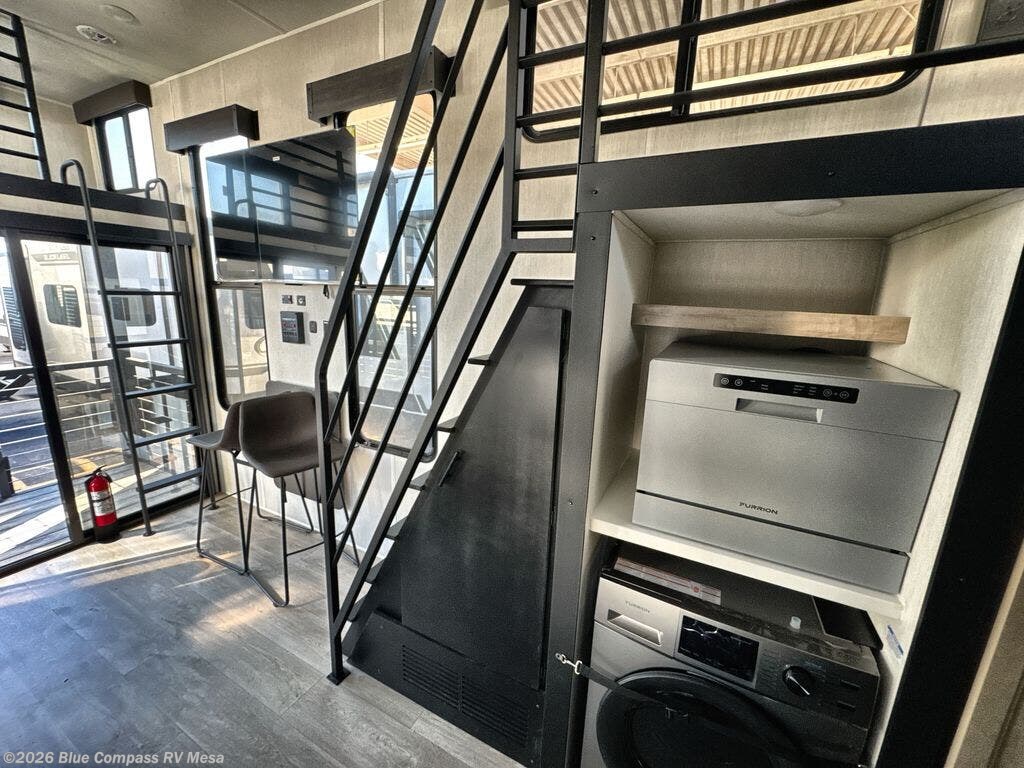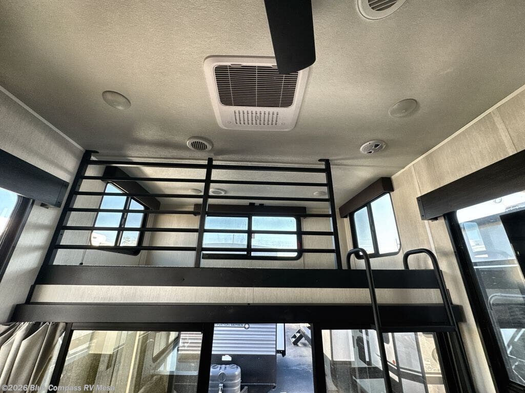 This model is similar to 16ML but larger! A bigger bathroom, RV king bed in the lower master, and a queen bed plus a twin bunk mat in the front loft. And the second loft can be utilized as extra sleeping space or storage space! There is an 18 cu. ft. refrigerator so you can stock up for a week long vacation, a hide-a-bed sofa that can transform into added sleeping for guests, and a high top table with two stools to dine at. The bathroom below is split with a shower on one side, and a private toilet area and sink opposite. And the view is amazing from just about anywhere inside.