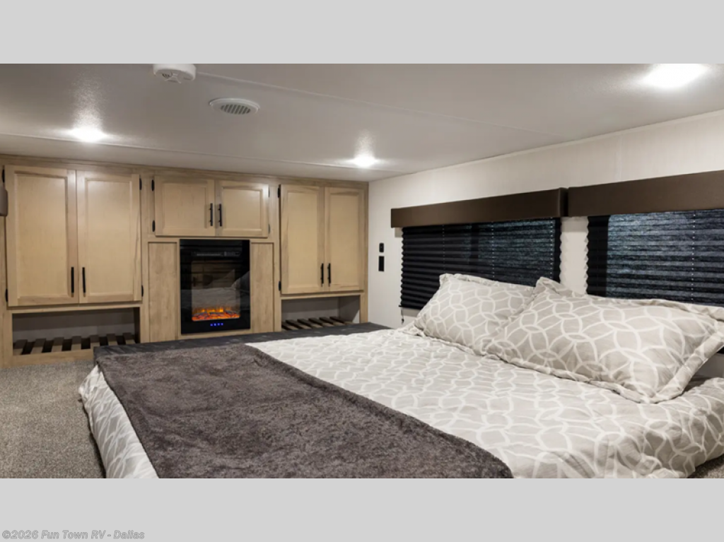 This model is similar to 16ML but larger! A bigger bathroom, RV king bed in the lower master, and a queen bed plus a twin bunk mat in the front loft. And the second loft can be utilized as extra sleeping space or storage space! There is an 18 cu. ft. refrigerator so you can stock up for a week long vacation, a hide-a-bed sofa that can transform into added sleeping for guests, and a high top table with two stools to dine at. The bathroom below is split with a shower on one side, and a private toilet area and sink opposite. And the view is amazing from just about anywhere inside.