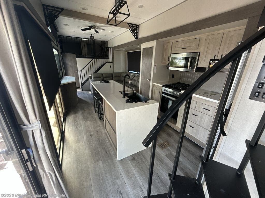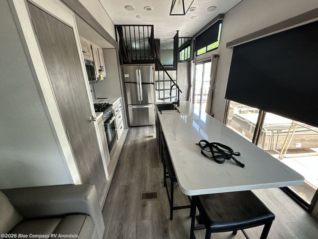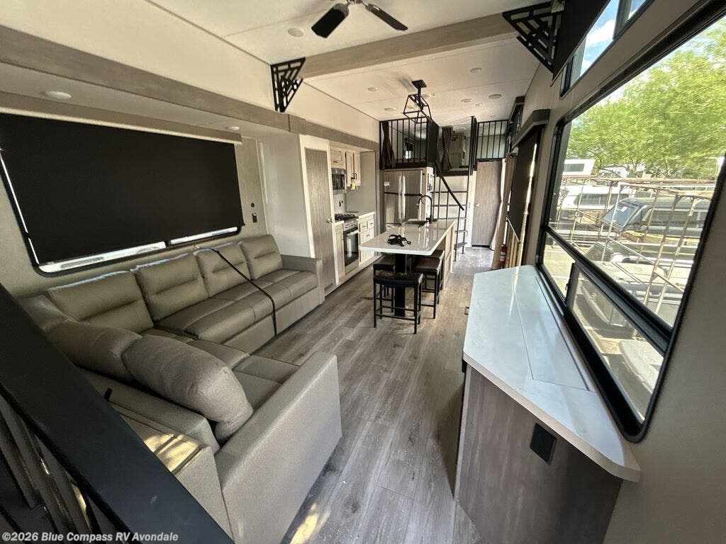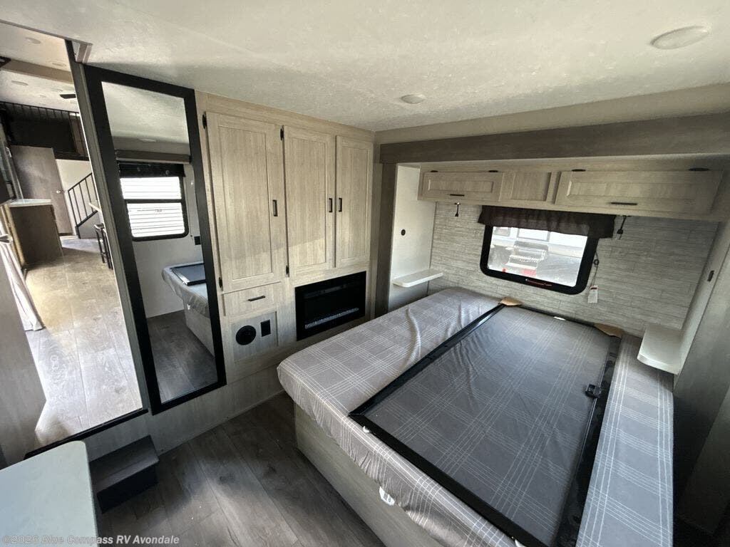This model is similar to 16ML but larger! A bigger bathroom, RV king bed in the lower master, and a queen bed plus a twin bunk mat in the front loft. And the second loft can be utilized as extra sleeping space or storage space! There is an 18 cu. ft. refrigerator so you can stock up for a week long vacation, a hide-a-bed sofa that can transform into added sleeping for guests, and a high top table with two stools to dine at. The bathroom below is split with a shower on one side, and a private toilet area and sink opposite. And the view is amazing from just about anywhere inside.