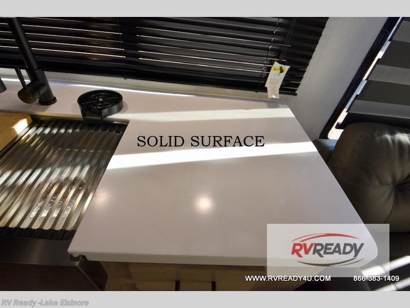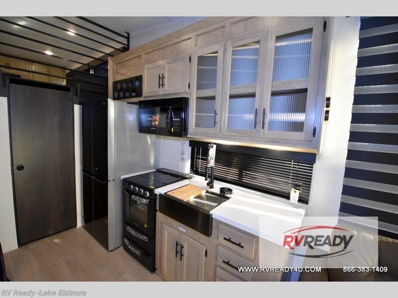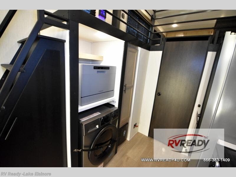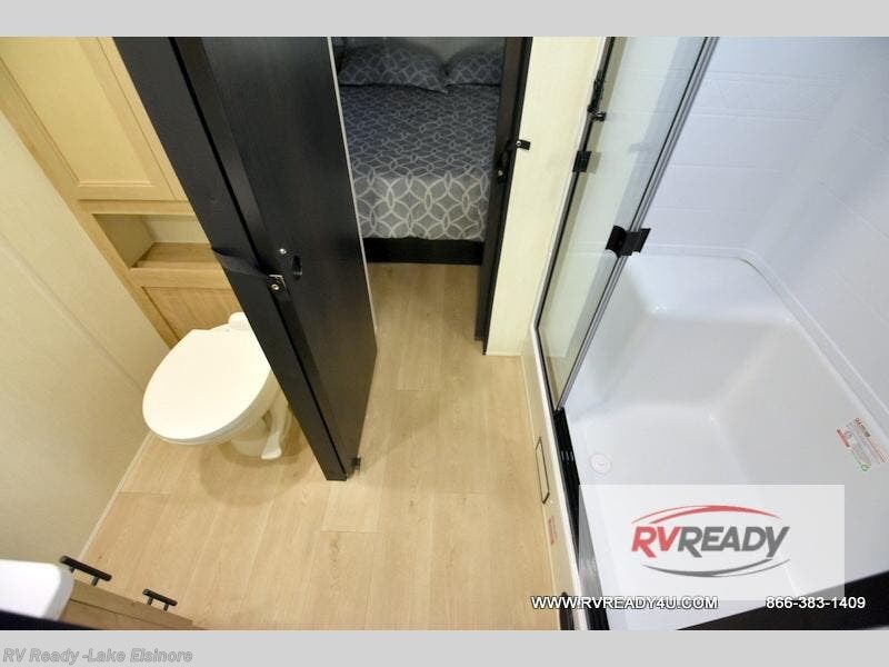 This model is similar to 16ML but larger! A bigger bathroom, RV king bed in the lower master, and a queen bed plus a twin bunk mat in the front loft. And the second loft can be utilized as extra sleeping space or storage space! There is an 18 cu. ft. refrigerator so you can stock up for a week long vacation, a hide-a-bed sofa that can transform into added sleeping for guests, and a high top table with two stools to dine at. The bathroom below is split with a shower on one side, and a private toilet area and sink opposite. And the view is amazing from just about anywhere inside.