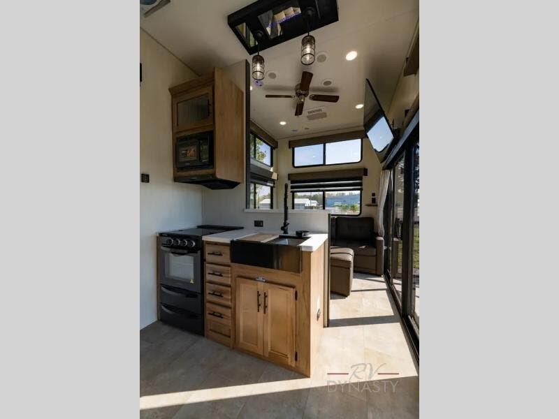 You'll feel right at home in this feature-packed destination trailer! The rear private bedroom features one of the dual entry doors, an RV king bed, and a side patio for great outdoor views! There is also a wardrobe with washer/dryer prep if you want the option to add these appliances. Above the bedroom, you'll find a loft with a queen bed, a fireplace and a storage cabinet to keep the space tidy. The chef of your group can whip up their best meals in the middle kitchen, and there is a spacious pantry to keep snacks stocked. Your crew can relax on the L-shaped sofa in the front living room, enjoy the fireplace and TV, or just take in the outdoor views provided by the huge side patio!