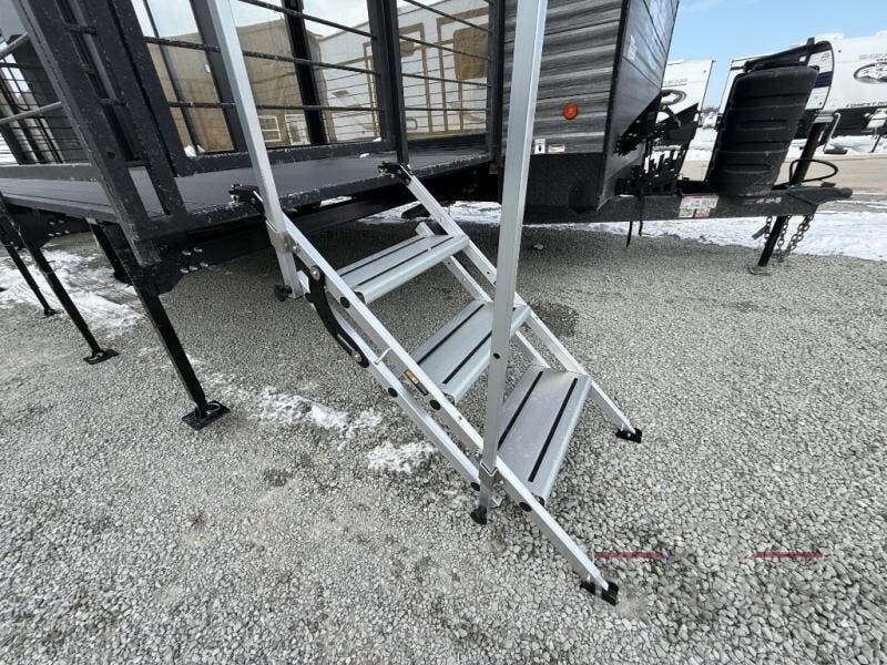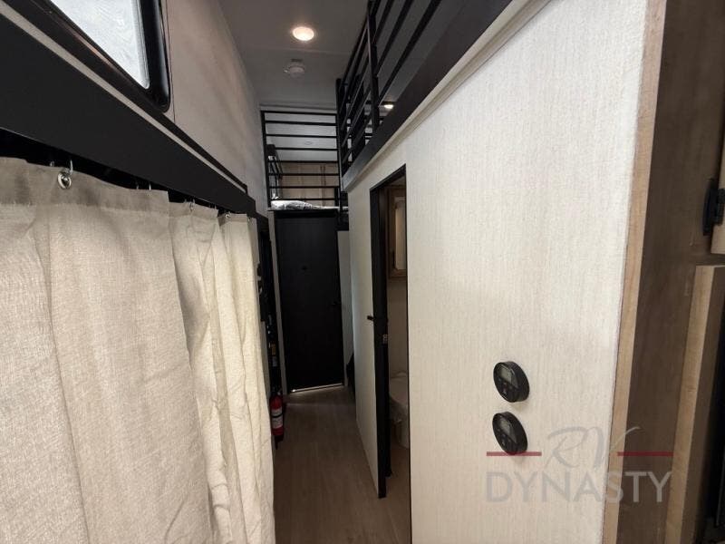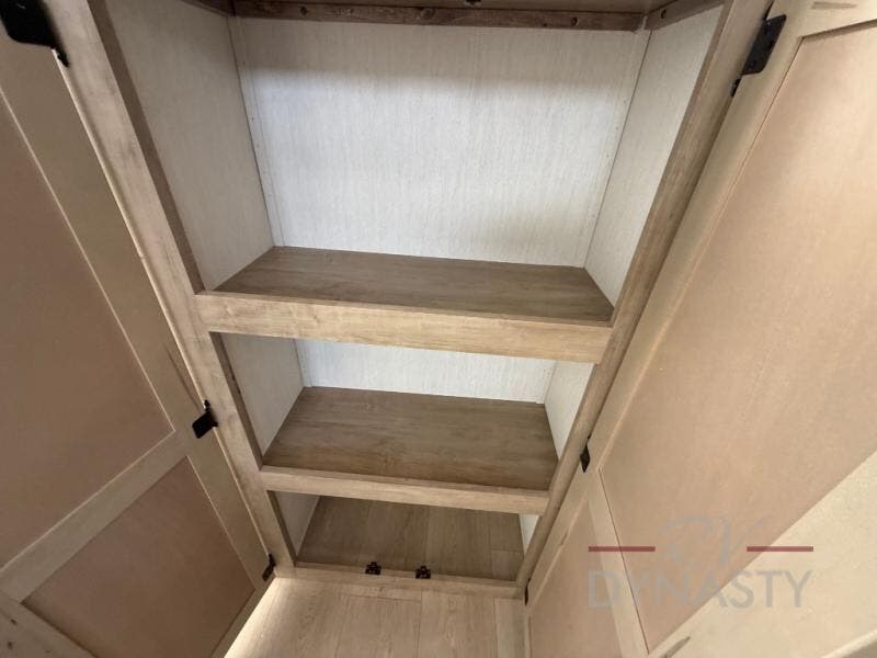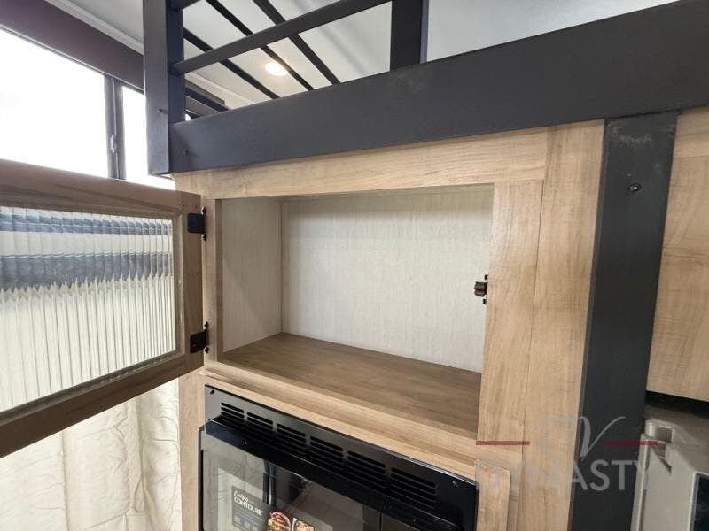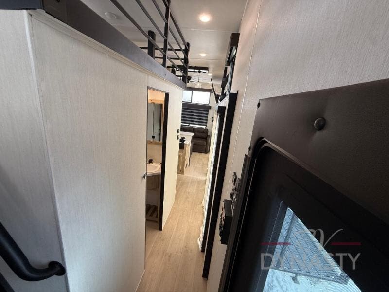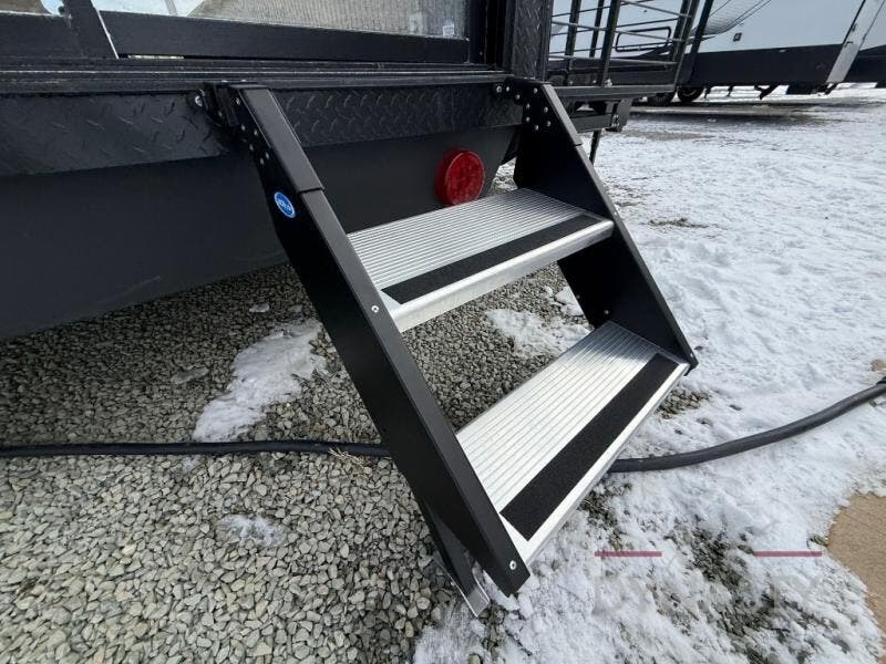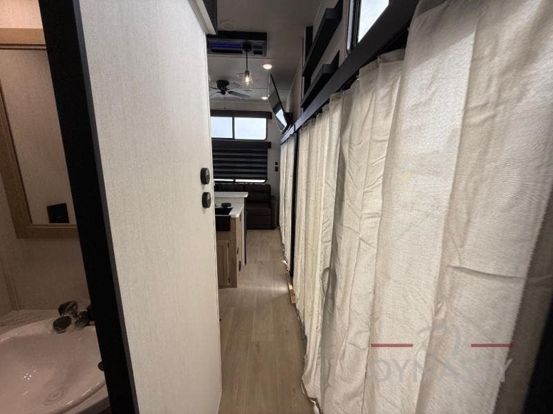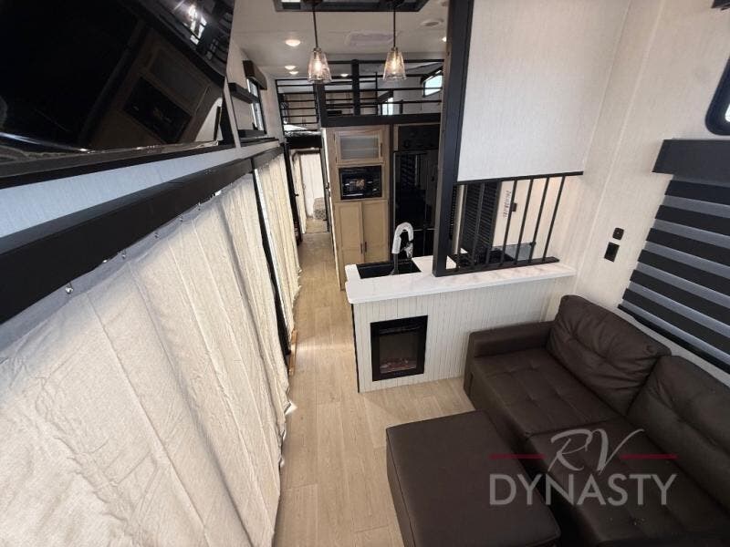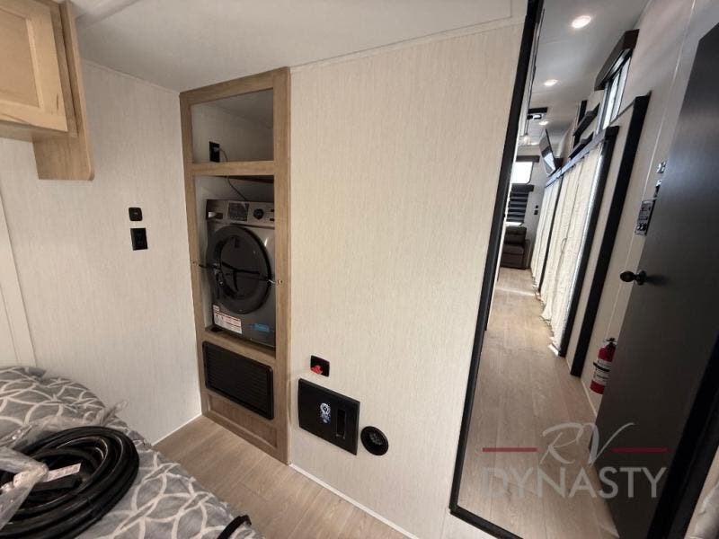 You'll feel right at home in this feature-packed destination trailer! The rear private bedroom features one of the dual entry doors, an RV king bed, and a side patio for great outdoor views! There is also a wardrobe with washer/dryer prep if you want the option to add these appliances. Above the bedroom, you'll find a loft with a queen bed, a fireplace and a storage cabinet to keep the space tidy. The chef of your group can whip up their best meals in the middle kitchen, and there is a spacious pantry to keep snacks stocked. Your crew can relax on the L-shaped sofa in the front living room, enjoy the fireplace and TV, or just take in the outdoor views provided by the huge side patio!