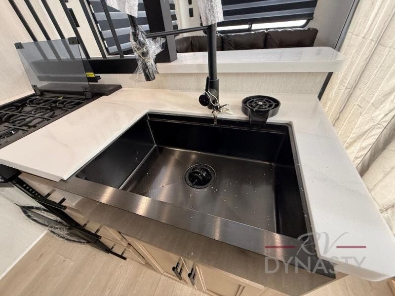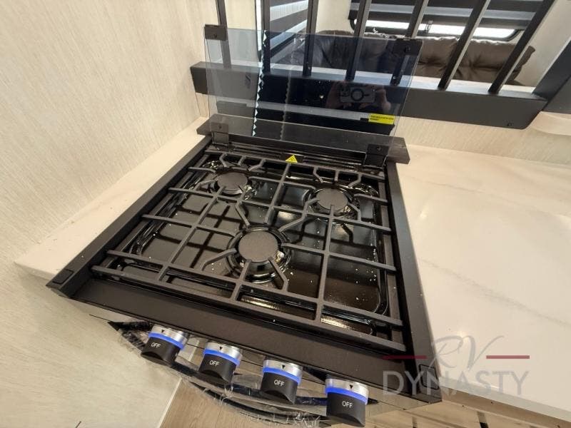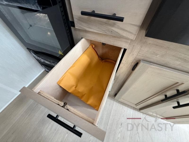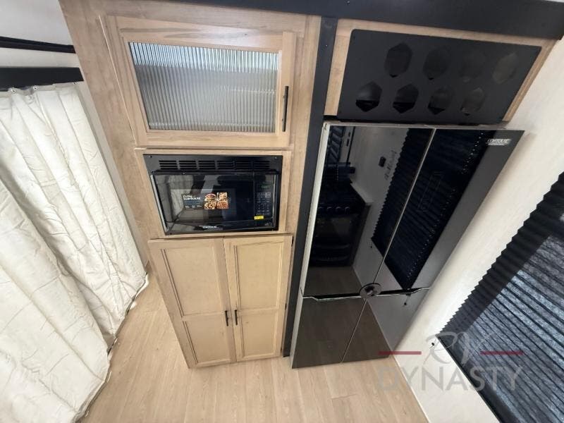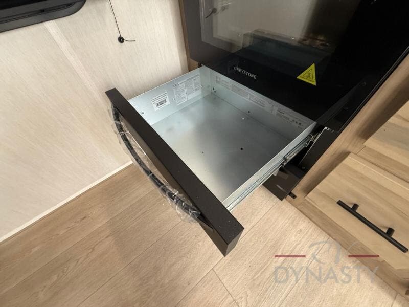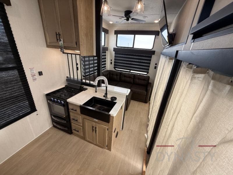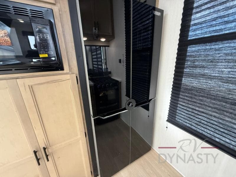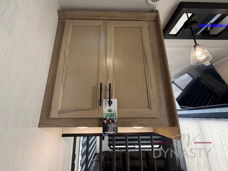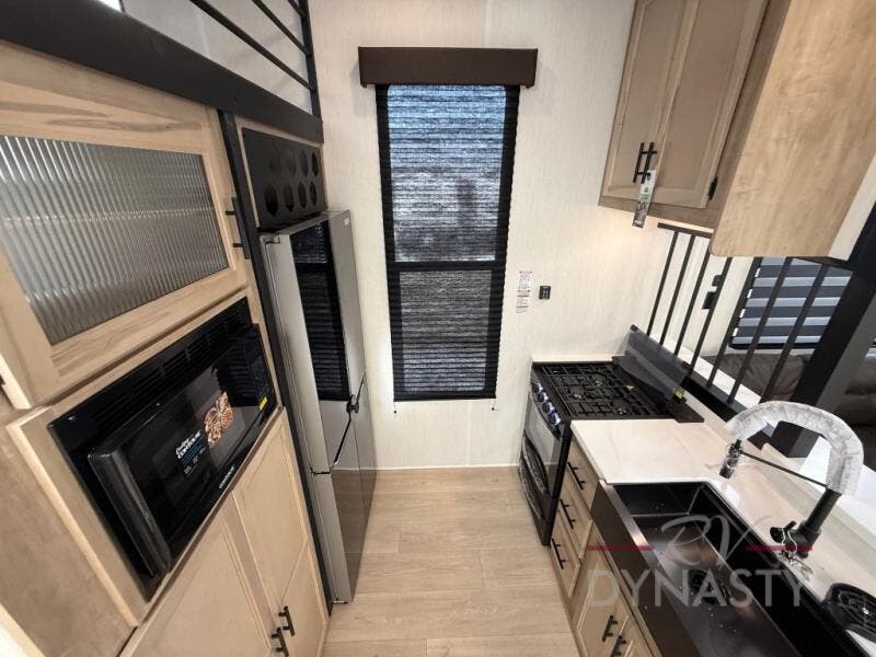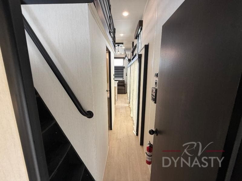 You'll feel right at home in this feature-packed destination trailer! The rear private bedroom features one of the dual entry doors, an RV king bed, and a side patio for great outdoor views! There is also a wardrobe with washer/dryer prep if you want the option to add these appliances. Above the bedroom, you'll find a loft with a queen bed, a fireplace and a storage cabinet to keep the space tidy. The chef of your group can whip up their best meals in the middle kitchen, and there is a spacious pantry to keep snacks stocked. Your crew can relax on the L-shaped sofa in the front living room, enjoy the fireplace and TV, or just take in the outdoor views provided by the huge side patio!