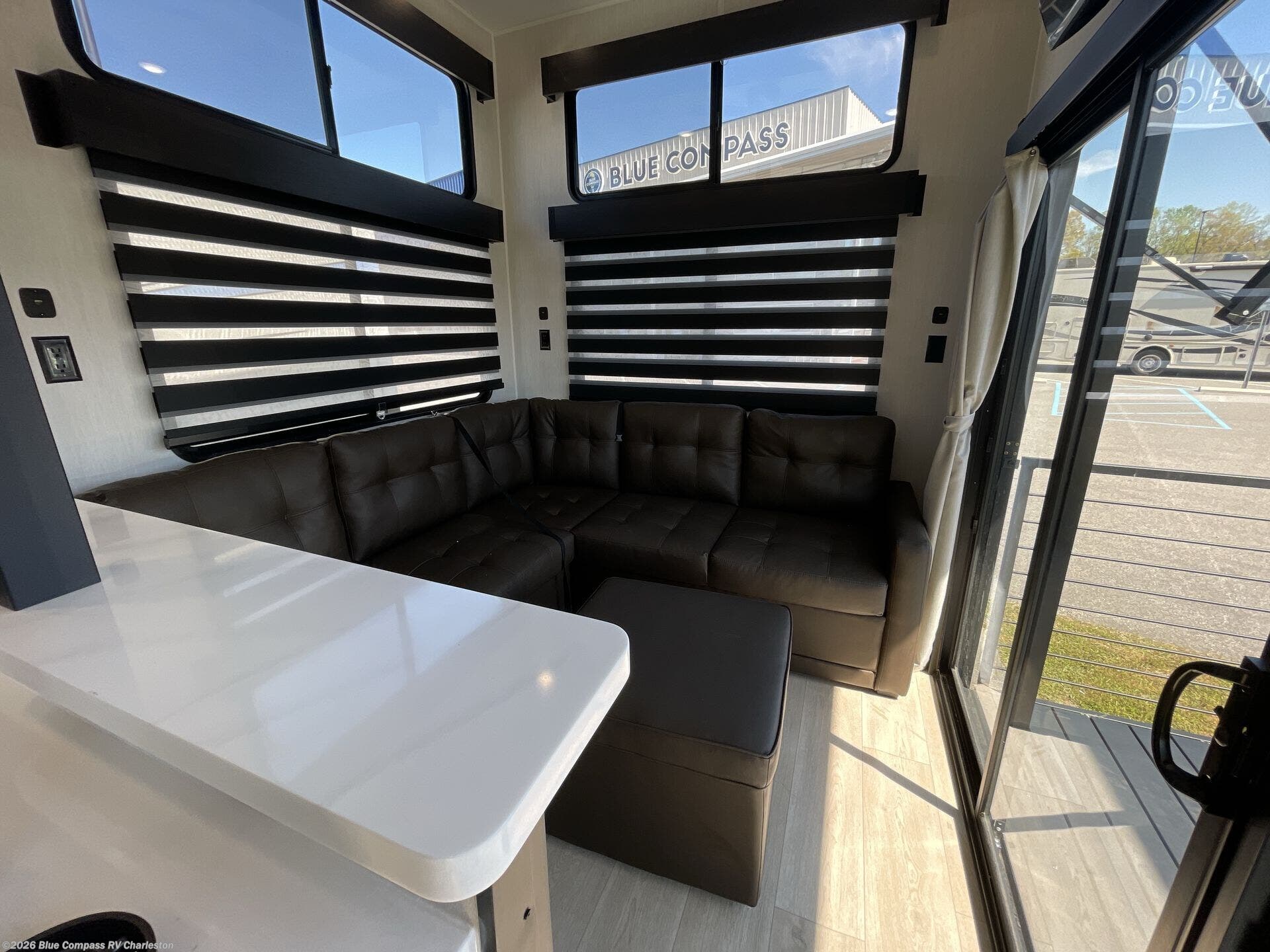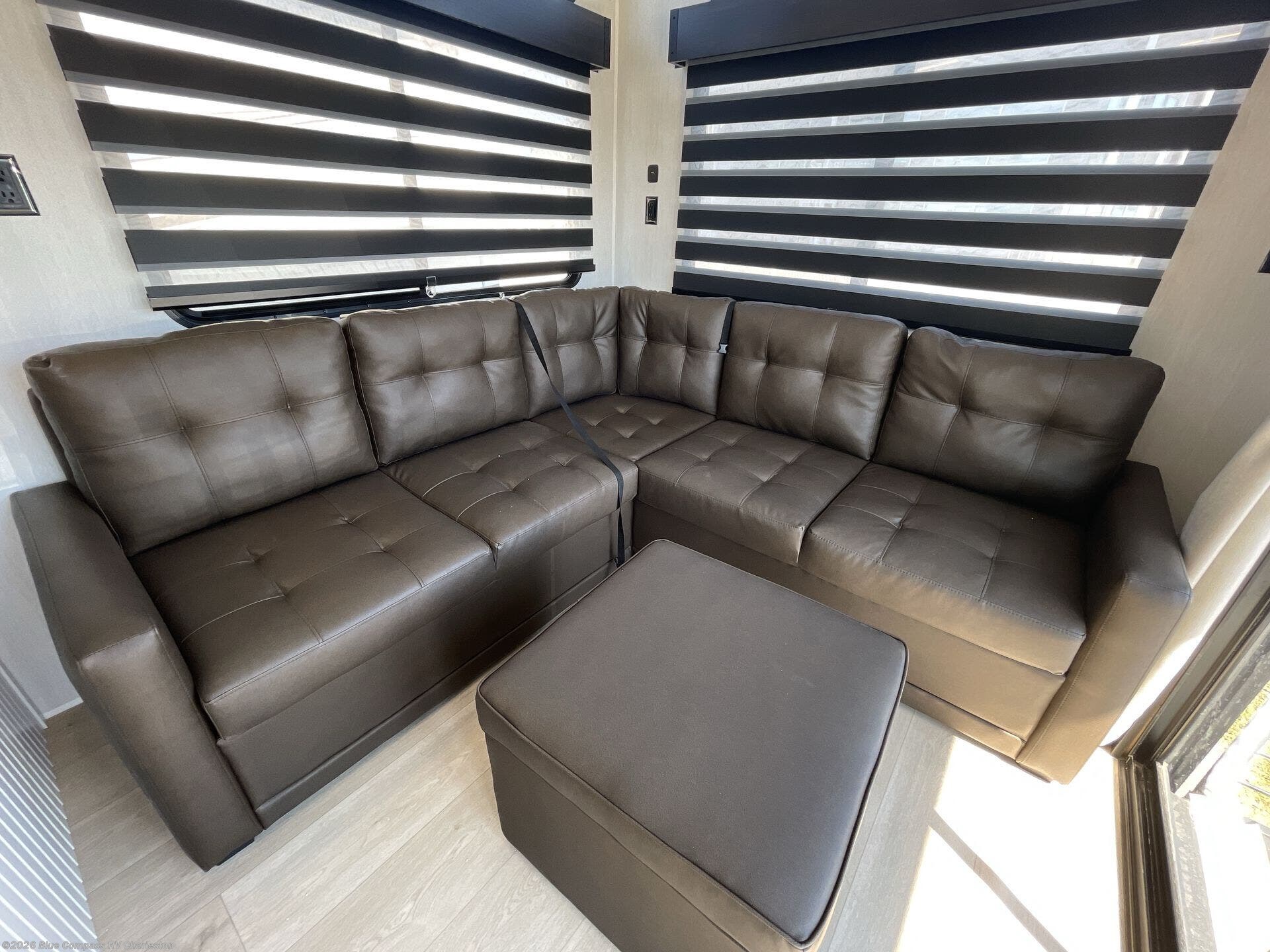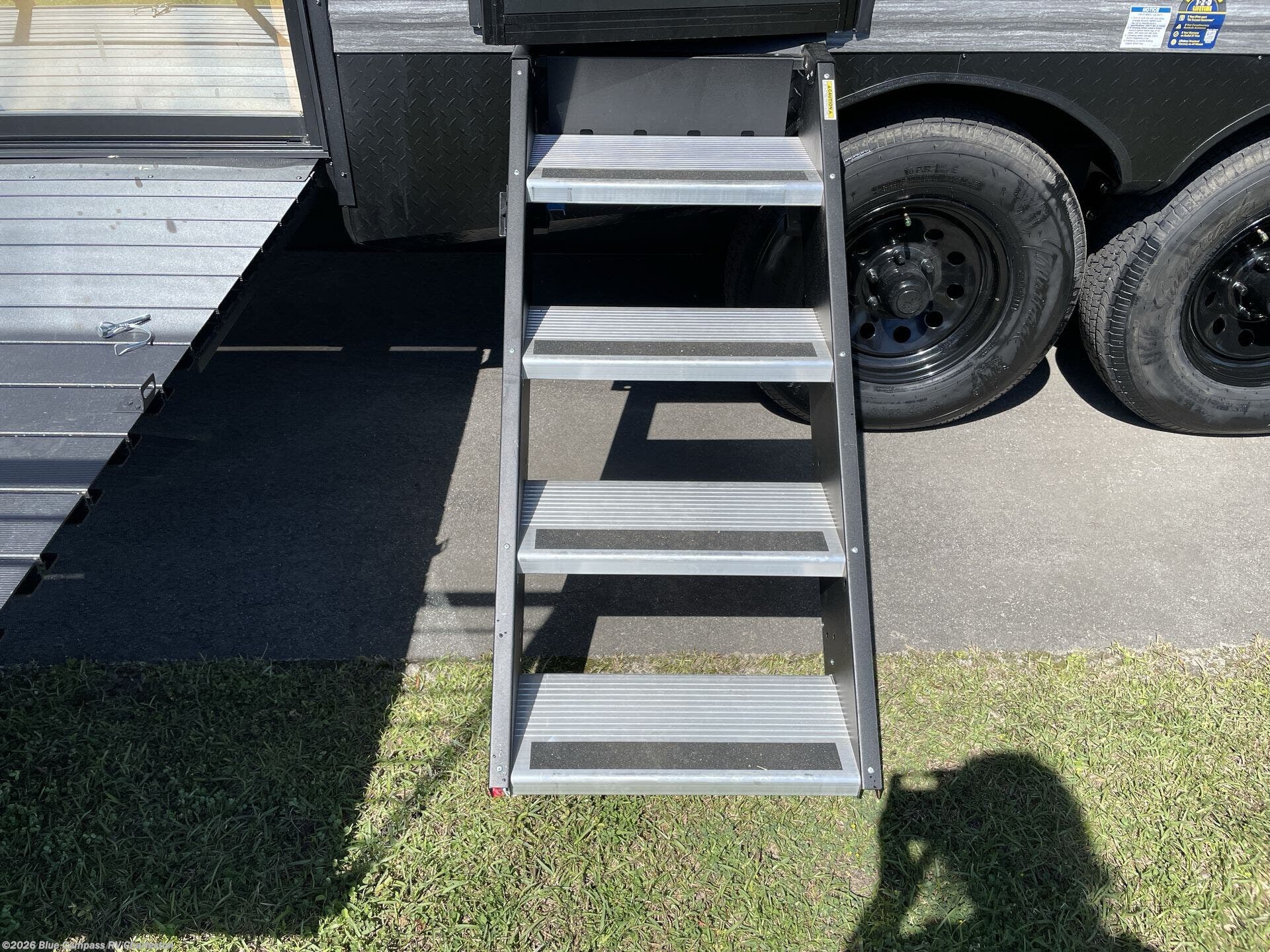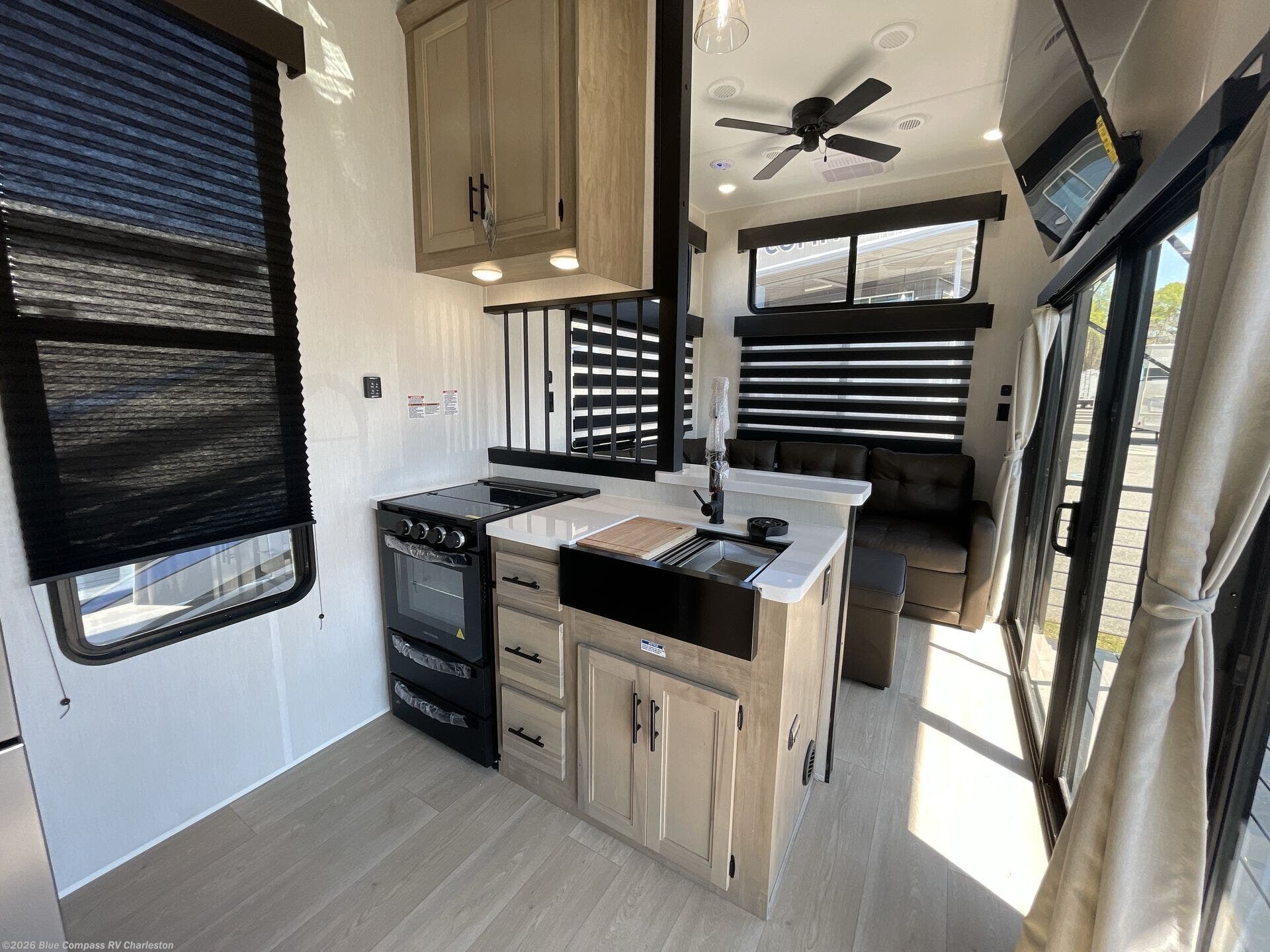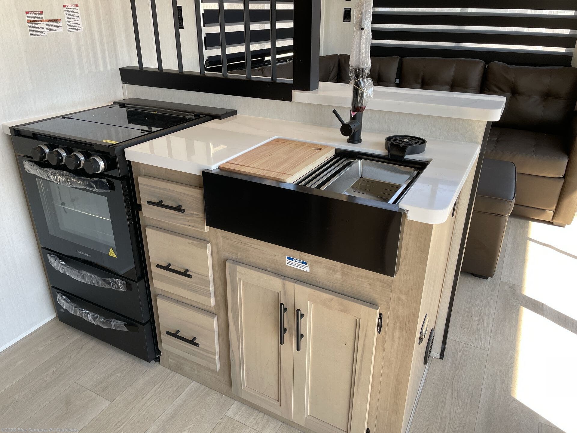You'll feel right at home in this feature-packed destination trailer! The rear private bedroom features one of the dual entry doors, an RV king bed, and a side patio for great outdoor views! There is also a wardrobe with washer/dryer prep if you want the option to add these appliances. Above the bedroom, you'll find a loft with a queen bed, a fireplace and a storage cabinet to keep the space tidy. The chef of your group can whip up their best meals in the middle kitchen, and there is a spacious pantry to keep snacks stocked. Your crew can relax on the L-shaped sofa in the front living room, enjoy the fireplace and TV, or just take in the outdoor views provided by the huge side patio!