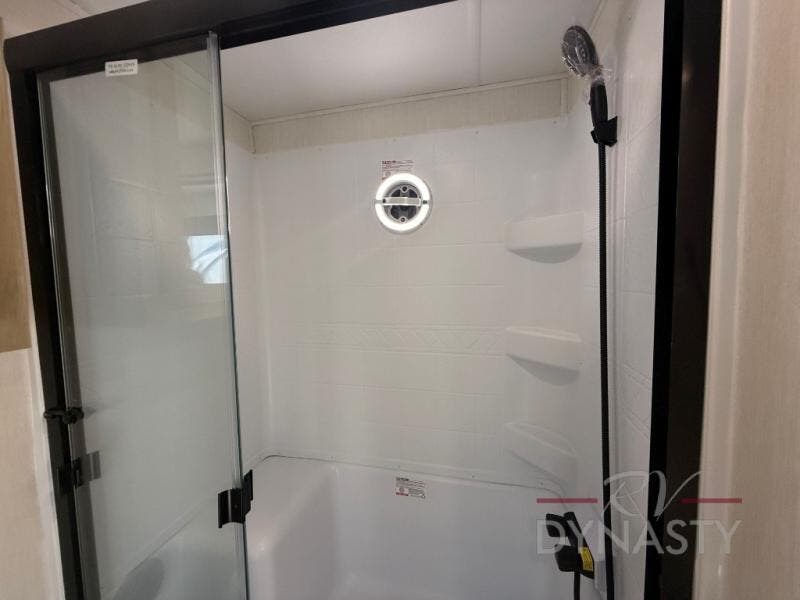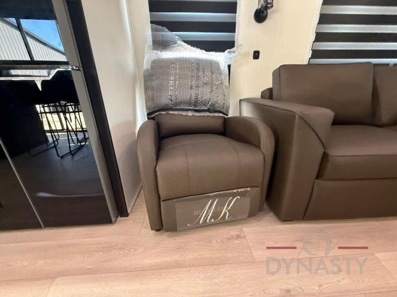 Time spent in this destination trailer will be time well spent! You will appreciate dual entry doors for maximum convenience, plus a spacious full bath that is close by the front private bedroom! Your crew can relax in the middle living area on the L-shaped sofa, and there are two lounge chairs for even more seating spaces. The rear kitchen will be any chef's dream with its island with six stools and all the appliances to create meals each day. This model also features triple slides so you can enjoy more space to relax!