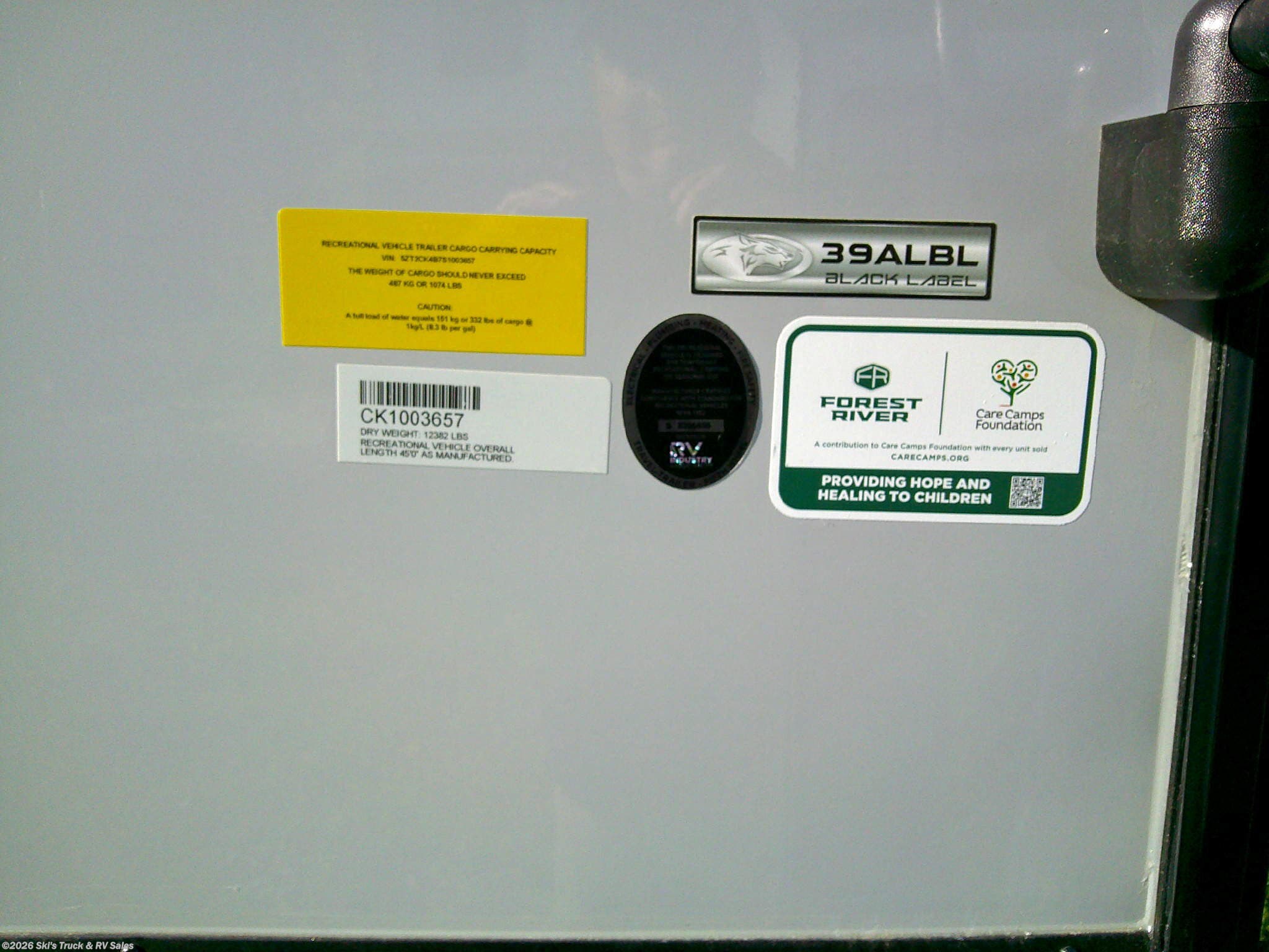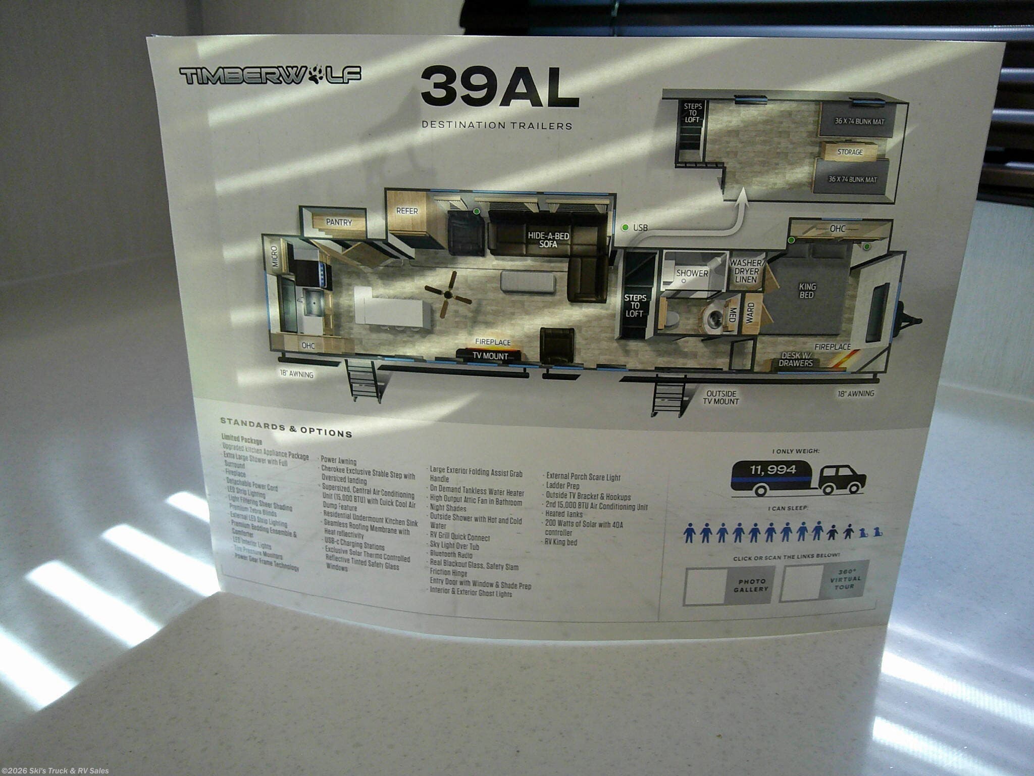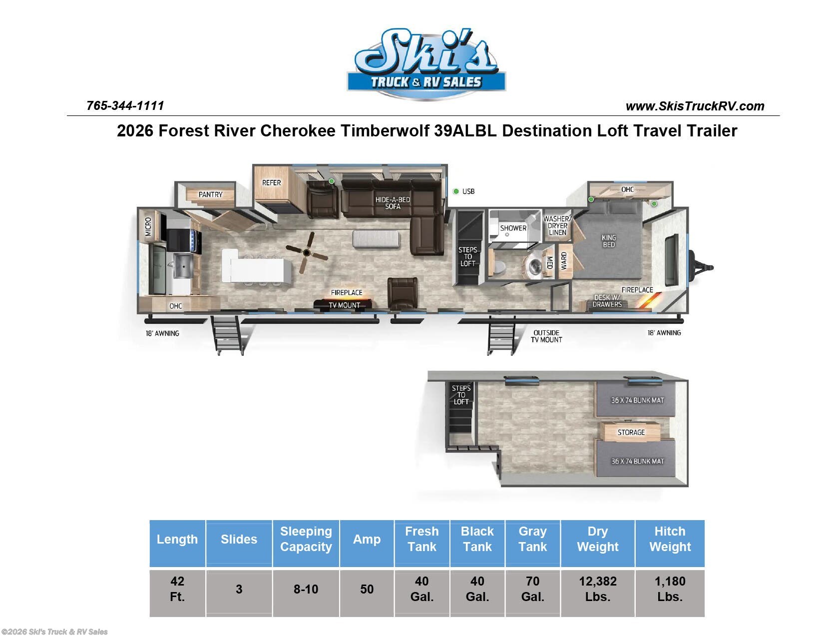 2026 Forest River Cherokee Timberwolf 39ALBL Destination Loft Travel Trailer; *COMING SOON: THIS UNIT ON ORDER* Black Label Edition; 42 Foot; 3 Slides with Toppers; Sleeps 8-10; Hitch Weight: 1,180 Lbs.; Dry Weight: 12,382 Lbs.; 50 Amp; Manual Tongue and Stabilizer Jacks; 40 Gal. Fresh Water Cap.; 40 Gal. Black Water Cap.; 70 Gal. Gray Water Cap.; Two 30 Lbs. Propane Tanks; Two ACs: 15,000 / 15,000 BTUs; 30,000 BTU Furnace; 18 C.F. (110V) Refrigerator; On Demand Water Heater; Microwave; 3-Burner Stove/Oven; Three TV Jacks; 50 In. TV; Speakers; Two Fireplaces; Kitchen Island with Barstools; Pantry; Stainless Steel Farm Sink; Solid Surface Countertops; Ceiling Fan; Sectional Sofa; Two Recliners; King Bed; Single Bunks in Loft; One Bathroom with Shower/Sitting Area; Washer/Dryer Prep.; Lots of Windows and Power Shades in Living Room; Two Patio Doors; Two Power Awnings with LED Lights: 18 Ft. / 18 Ft.; Solar Prep.; Outside Shower; Exterior Storage; Grab Handle; Battery Disconnect; Black Tank Flush; Heated Tanks; Frameless Tinted Windows; One Year Limited Warranty; Financing Available; Great Destination Loft Travel Trailer for the Price: $59,995. Call Skis Truck & RV Sales at 765-344-1111 or visit us at for more information.