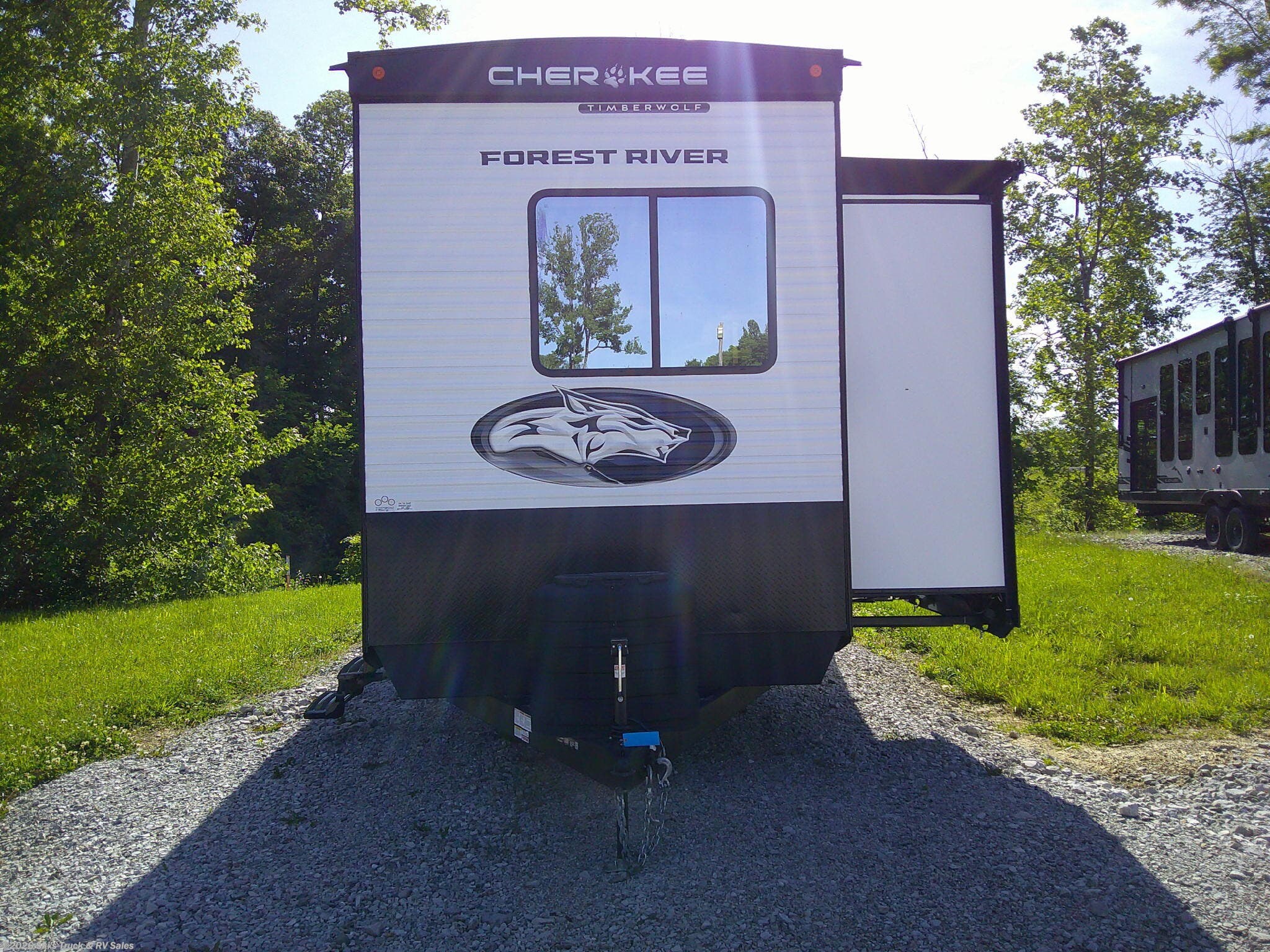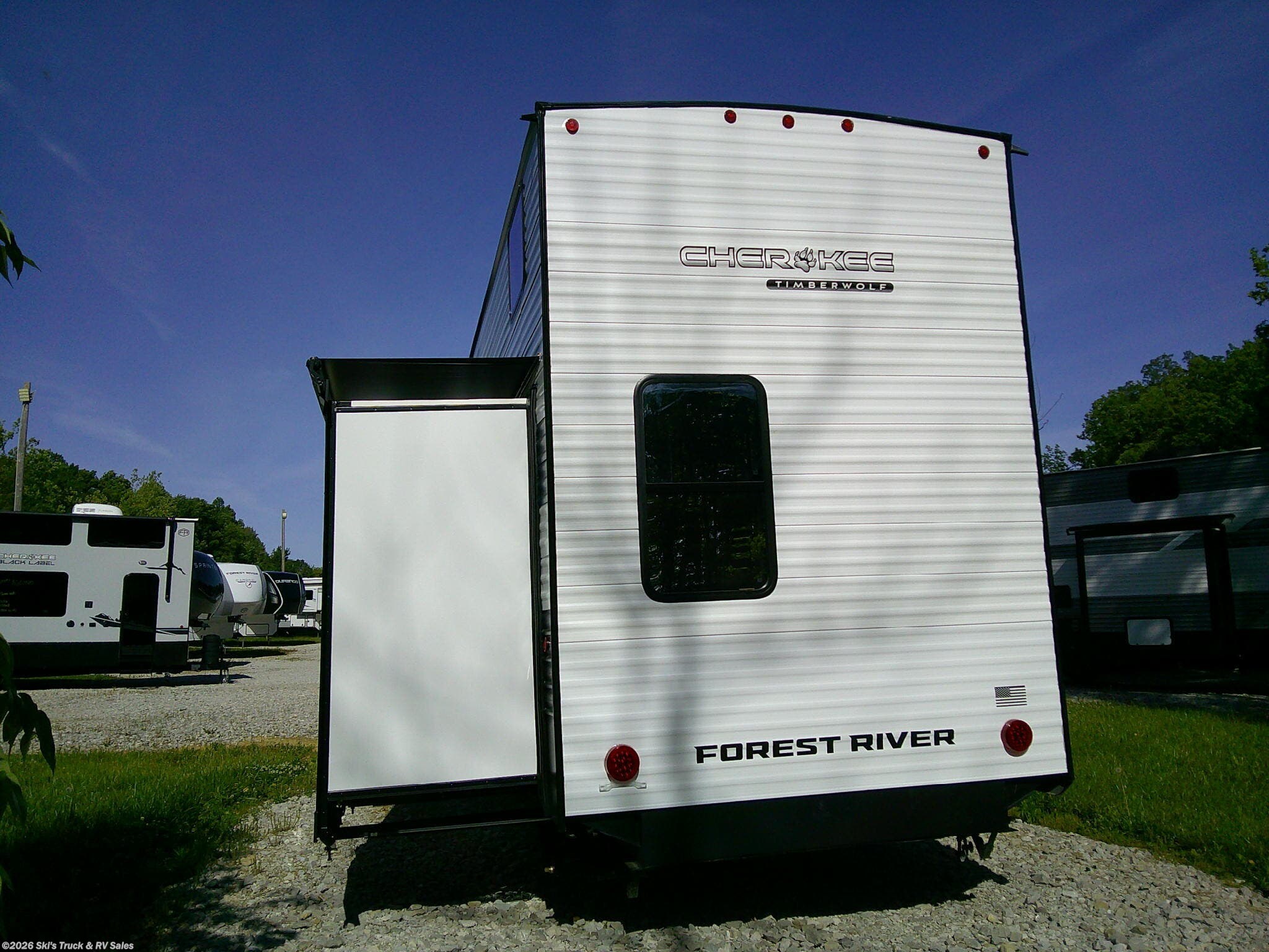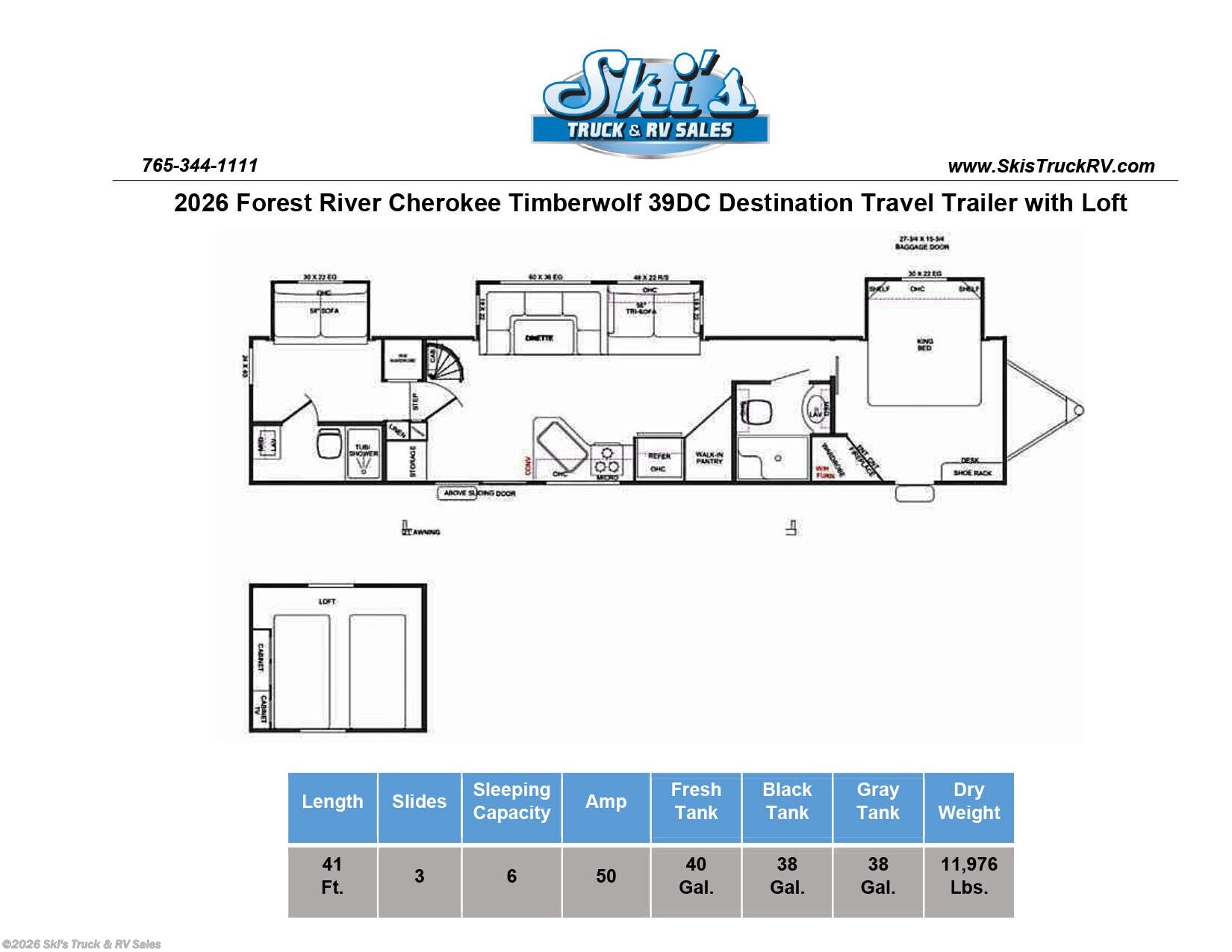 2026 Forest River Cherokee Timberwolf 39DC Destination Trailer; *THIS UNIT AVAILABLE TO ORDER* 41 Foot; 3 Slides with Toppers; Sleeps 6; Dry Weight: 11,969 Lbs.; 50 Amp; Manual Tongue and Stabilizer Jacks; 40 Gal. Fresh Water Cap.; 38 Gal. Black Water Cap.; 38 Gal. Gray Water Cap.; Two 30 Lbs. Propane Tanks with Outside Port; Two ACs: 15,000 / 15,000 BTUs; 30,000 BTU Furnace; 15 C.F. (110V) Refrigerator; On Demand Water Heater; Microwave; 3-Burner Stove/Oven; Three TV Jacks; Three 50 In. TVs; Speakers; Two Fireplaces; Ceiling Fan; Pantry; Stainless Steel Farm Sink; U Shaped Dinette; Trifold Sofa; Jack-knife Sofa in Bunk Room; King Bed; Two Full Baths: One with Shower; One with Tub/Shower; Loft; Sliding Door; Patio; 21 Foot Power Awning with LED Lights; Outside Grill; Outside Shower; Exterior Storage; Grab Handle; Roof Ladder Prep.; Magnetic Door Holders; Battery Disconnect; Black Tank Flush; Tank Heaters; Tinted Windows; Zebra Shades; One Year Limited Warranty; Financing Available; Great Destination Travel Trailer with LOFT for the Price: $47,995. Call Skis Truck & RV Sales at 765-344-1111 or visit us at for more information.