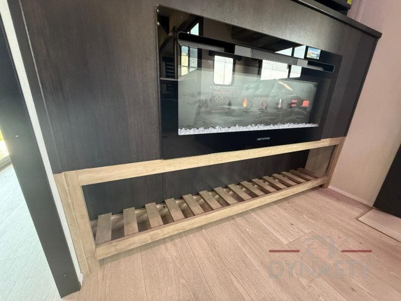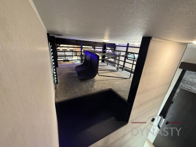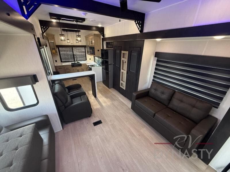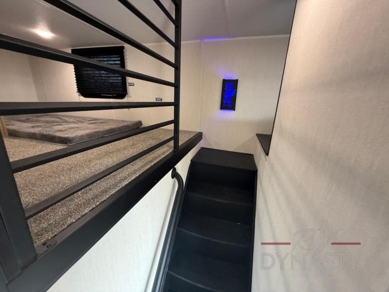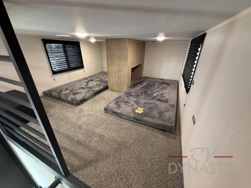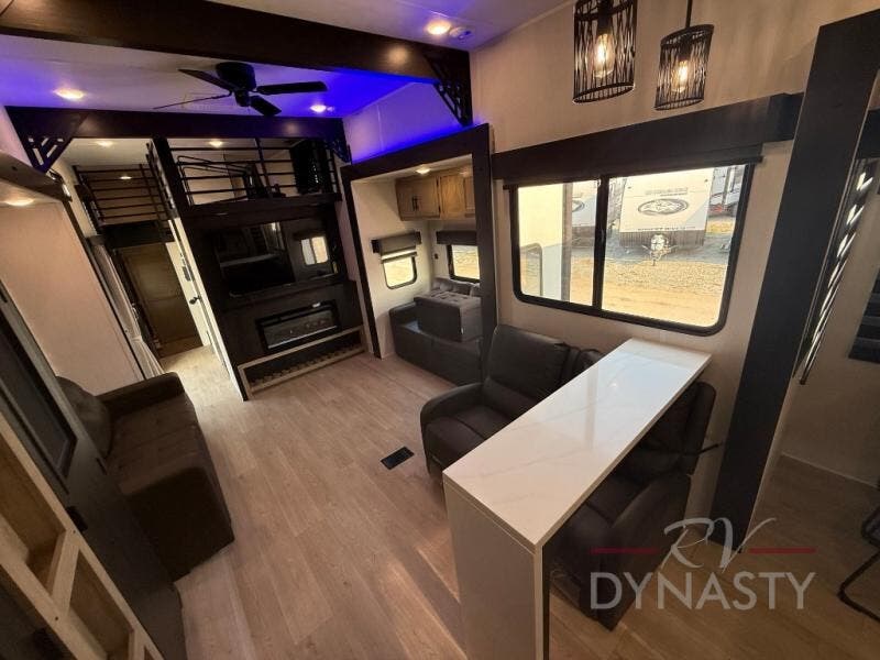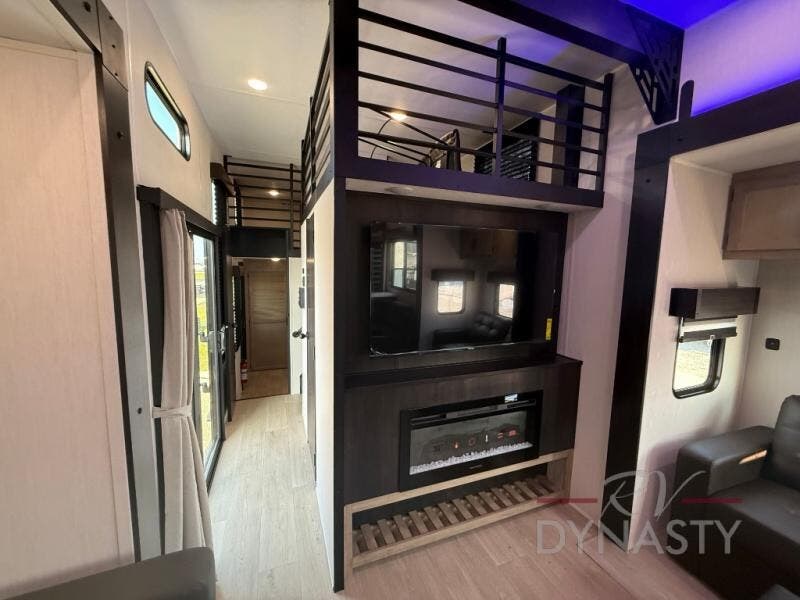 It won't be hard to find comfort in this front kitchen destination trailer! There is ample counter space to prep meals, a free-standing dinette with a slide out, plus a large pantry and 18 cu. ft. refrigerator for food storage. The bar top with stools overlooks the middle living area, where you'll also find dual hide-a-bed sofas and an entertainment center with a fireplace. The full bath includes a shower with a seat for more comfort, and one of the dual entry doors is right across from the bath so you can quickly get back outside. Head up the steps to the dual loft areas with two bunk mats and cabinets on one side, and an open area on the other, perfect for a play room or extra storage! And under the loft you'll find the rear private bedroom with a king bed slide, a wardrobe and an entertainment center, plus washer and dryer prep if you want to add these appliances!