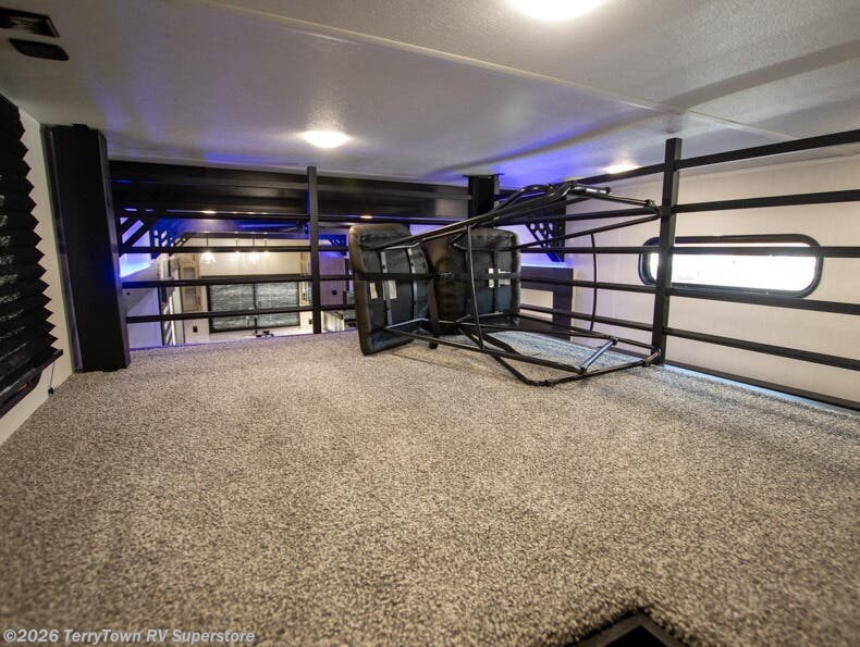 It won't be hard to find comfort in this front kitchen destination trailer! There is ample counter space to prep meals, a free-standing dinette with a slide out, plus a large pantry and 18 cu. ft. refrigerator for food storage. The bar top with stools overlooks the middle living area, where you'll also find dual hide-a-bed sofas and an entertainment center with a fireplace. The full bath includes a shower with a seat for more comfort, and one of the dual entry doors is right across from the bath so you can quickly get back outside. Head up the steps to the dual loft areas with two bunk mats and cabinets on one side, and an open area on the other, perfect for a play room or extra storage! And under the loft you'll find the rear private bedroom with a king bed slide, a wardrobe and an entertainment center, plus washer and dryer prep if you want to add these appliances!