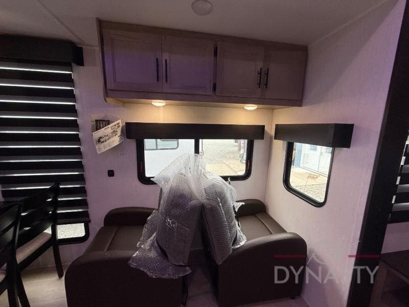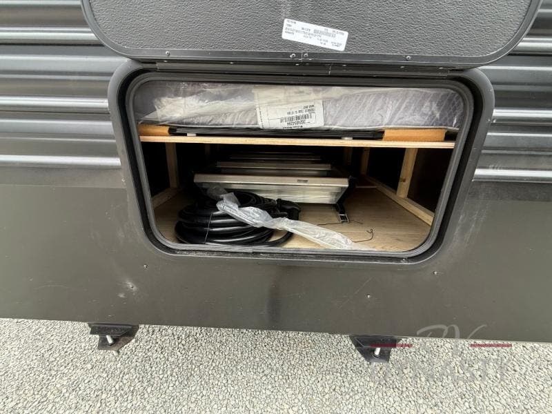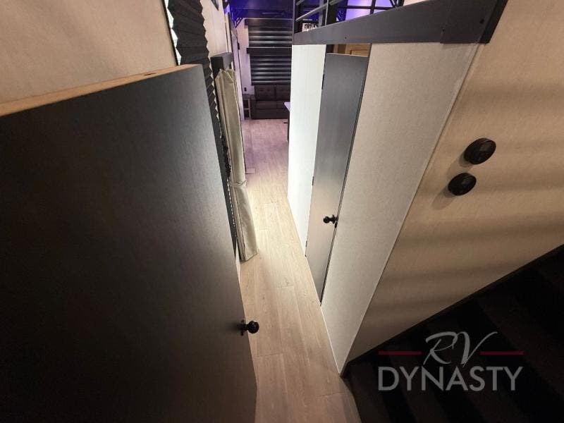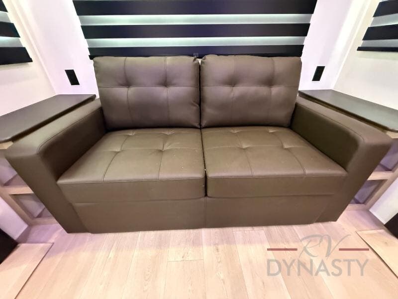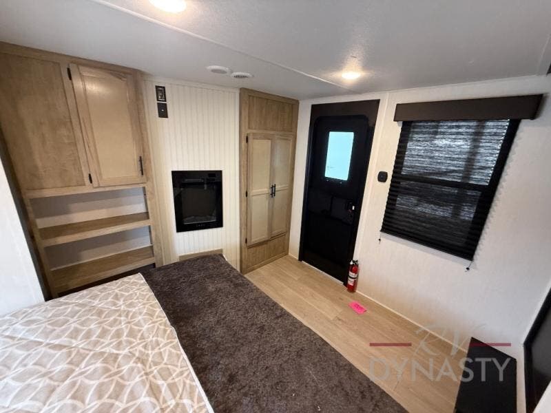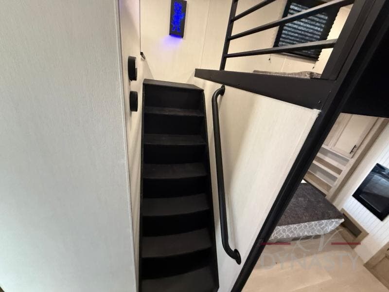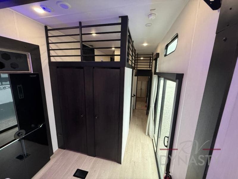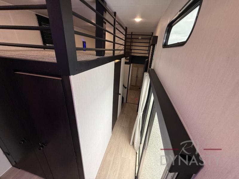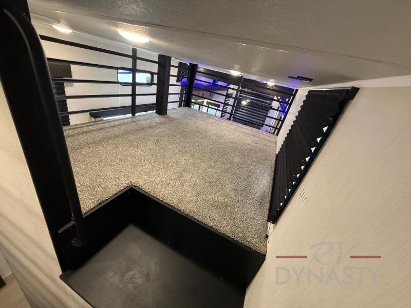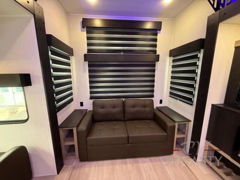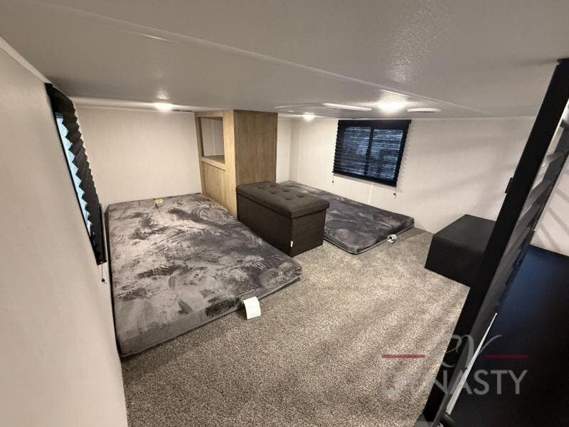 This destination trailer is an excellent and accommodating trailer that will make you feel right at home as soon as you enter through one of the two entry doors. The front private bedroom has a king bed slide and lots of storage with a wardrobe and a linen closet. There is also an entertainment center where you can add your own TV and the bedroom even has a second exterior entry door so that you can come and go as you please. Above the bedroom is where the huge loft is located. When you take the stairs up to the loft, you'll find two 36" x 74" bunk mats, cabinets, and a large open area with a railing. The main living area has a free-standing dinette with chairs, theater seats, and a hide-a-bed sofa, so you will have plenty of seating as you watch the main entertainment center.