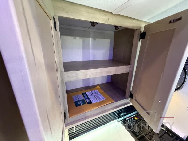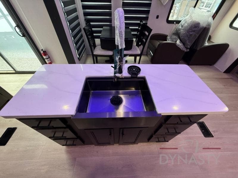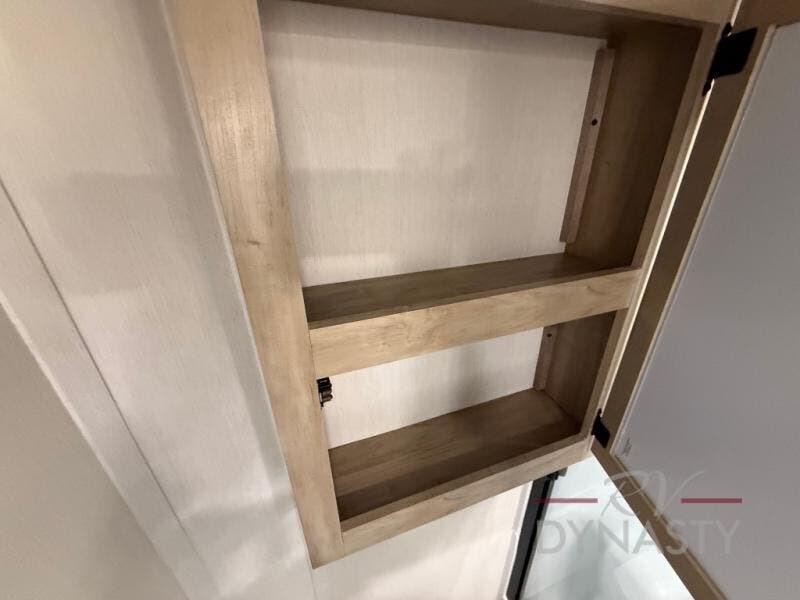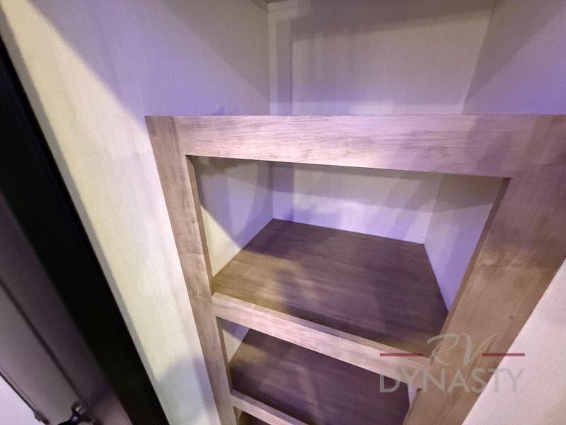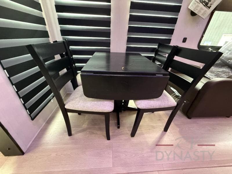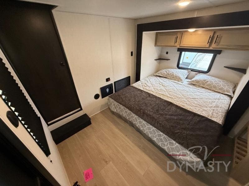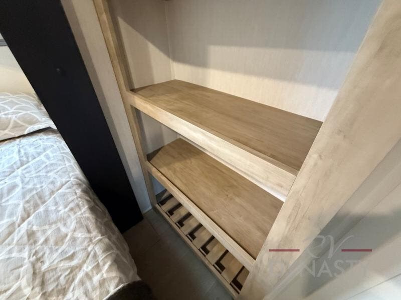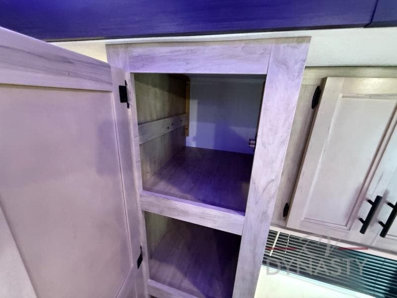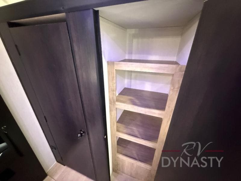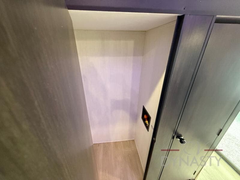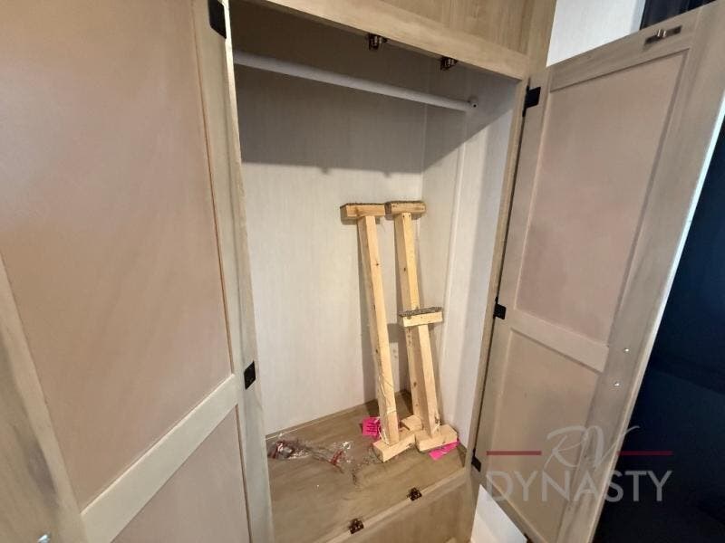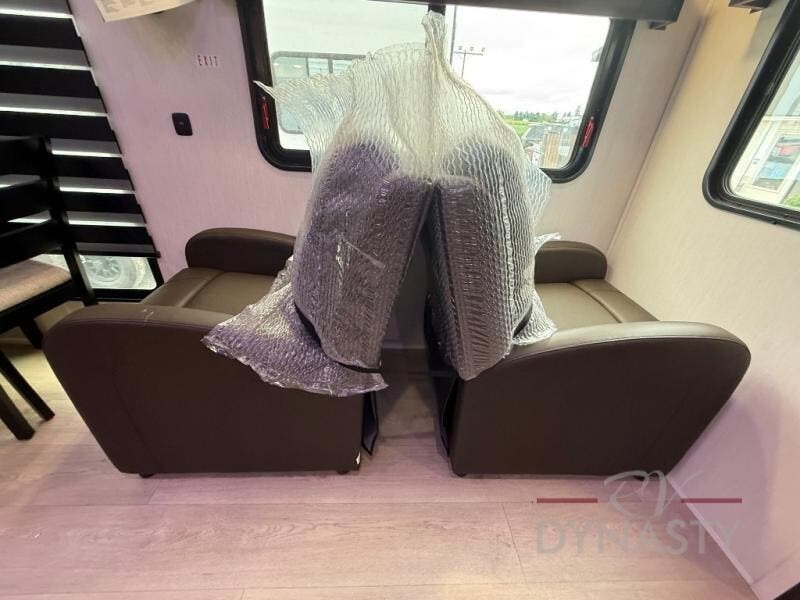 This destination trailer is an excellent and accommodating trailer that will make you feel right at home as soon as you enter through one of the two entry doors. The front private bedroom has a king bed slide and lots of storage with a wardrobe and a linen closet. There is also an entertainment center where you can add your own TV and the bedroom even has a second exterior entry door so that you can come and go as you please. Above the bedroom is where the huge loft is located. When you take the stairs up to the loft, you'll find two 36" x 74" bunk mats, cabinets, and a large open area with a railing. The main living area has a free-standing dinette with chairs, theater seats, and a hide-a-bed sofa, so you will have plenty of seating as you watch the main entertainment center.