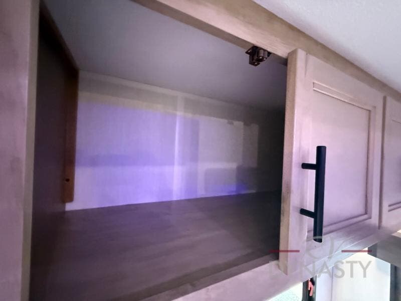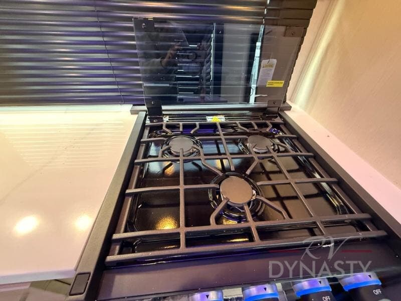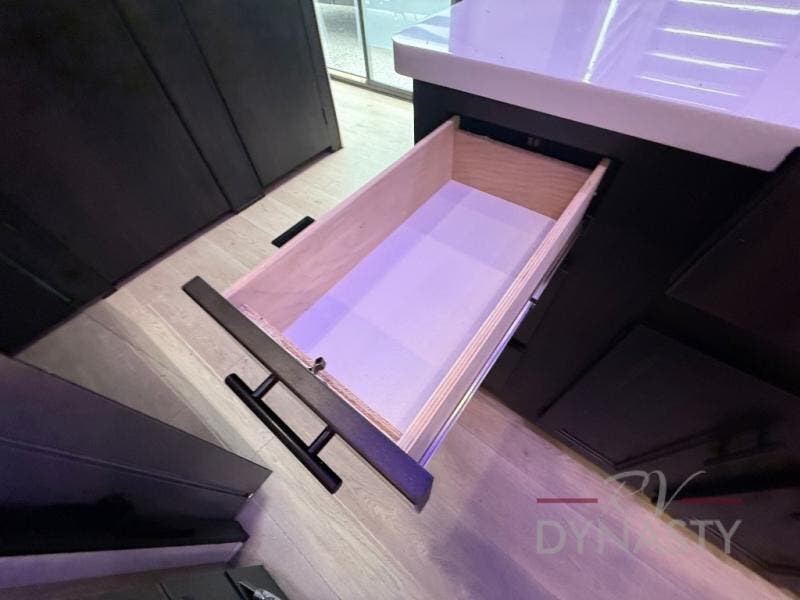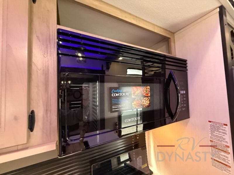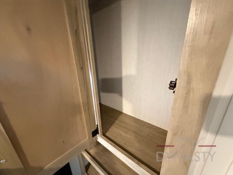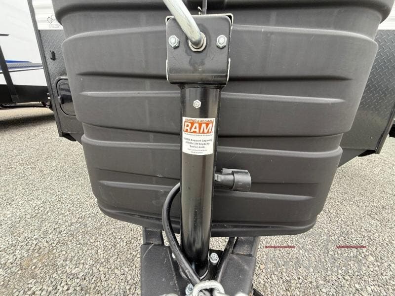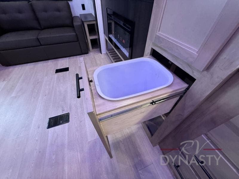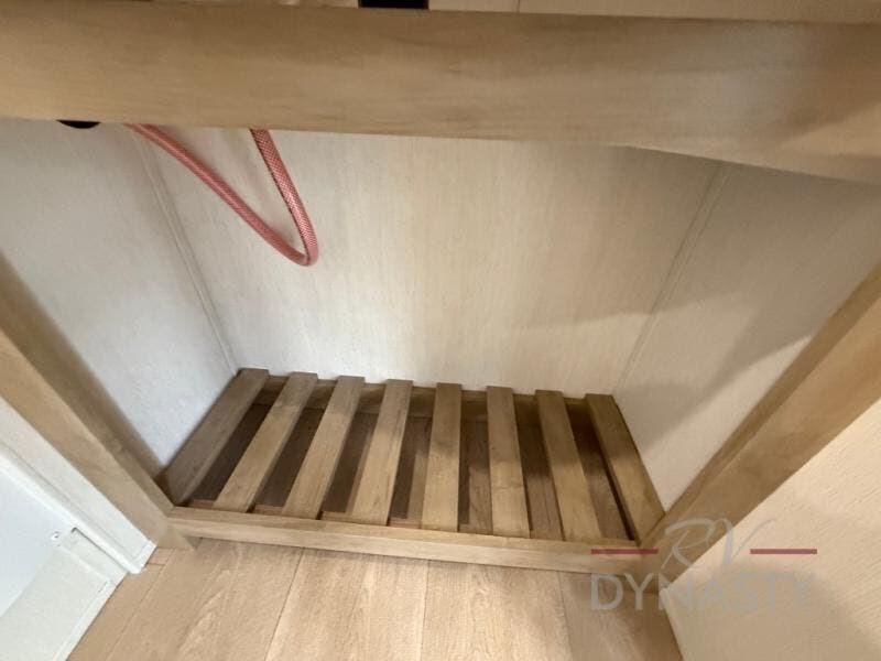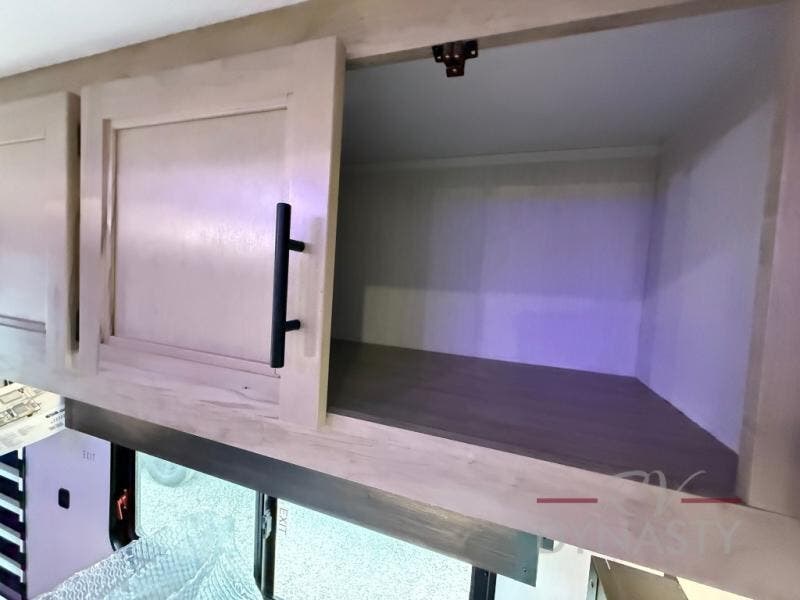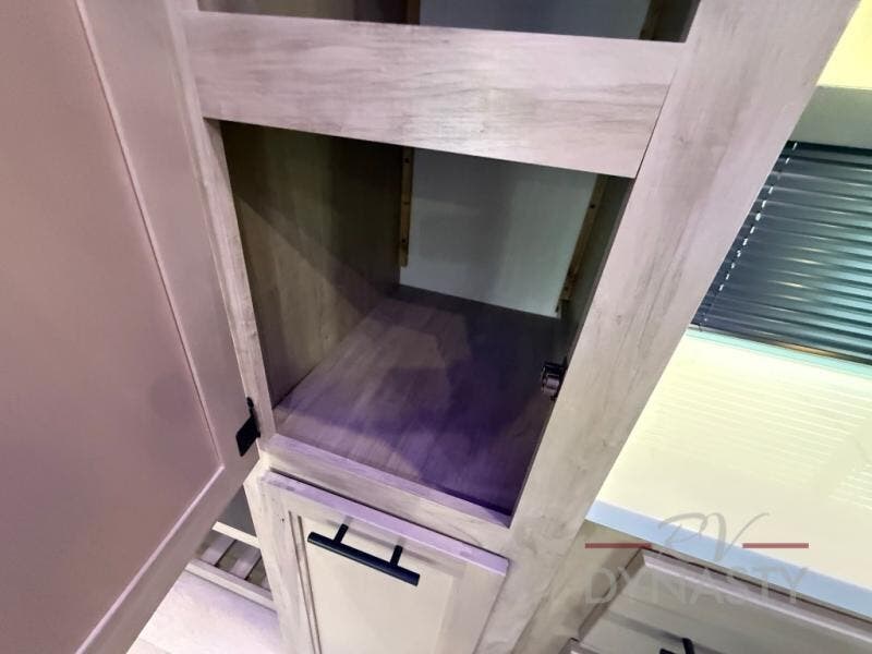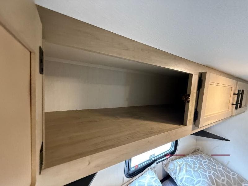This destination trailer is an excellent and accommodating trailer that will make you feel right at home as soon as you enter through one of the two entry doors. The front private bedroom has a king bed slide and lots of storage with a wardrobe and a linen closet. There is also an entertainment center where you can add your own TV and the bedroom even has a second exterior entry door so that you can come and go as you please. Above the bedroom is where the huge loft is located. When you take the stairs up to the loft, you'll find two 36" x 74" bunk mats, cabinets, and a large open area with a railing. The main living area has a free-standing dinette with chairs, theater seats, and a hide-a-bed sofa, so you will have plenty of seating as you watch the main entertainment center.