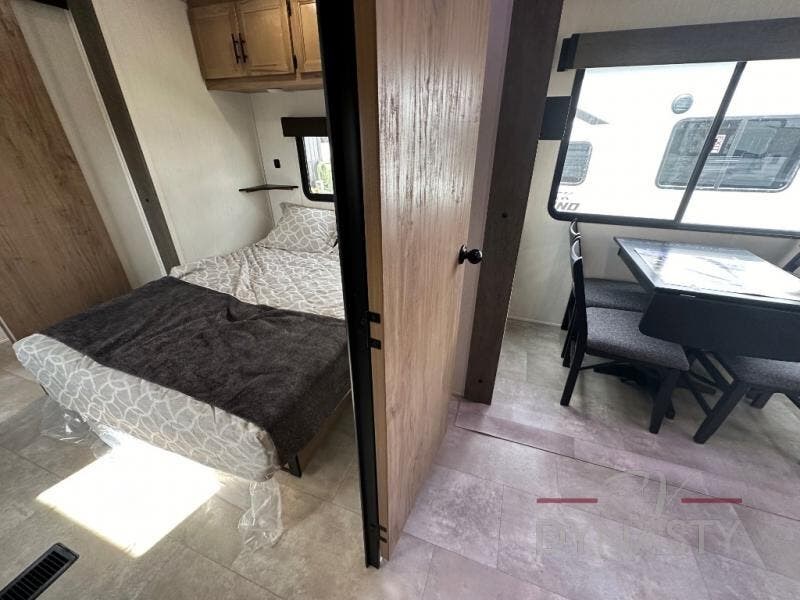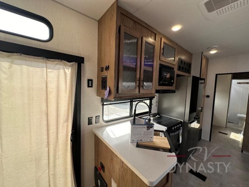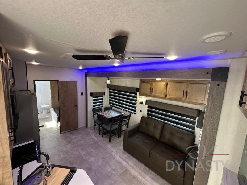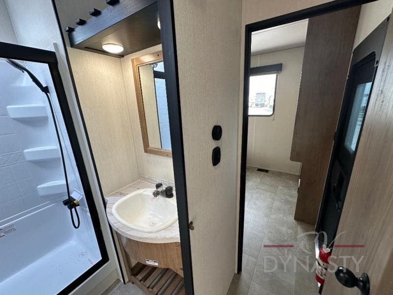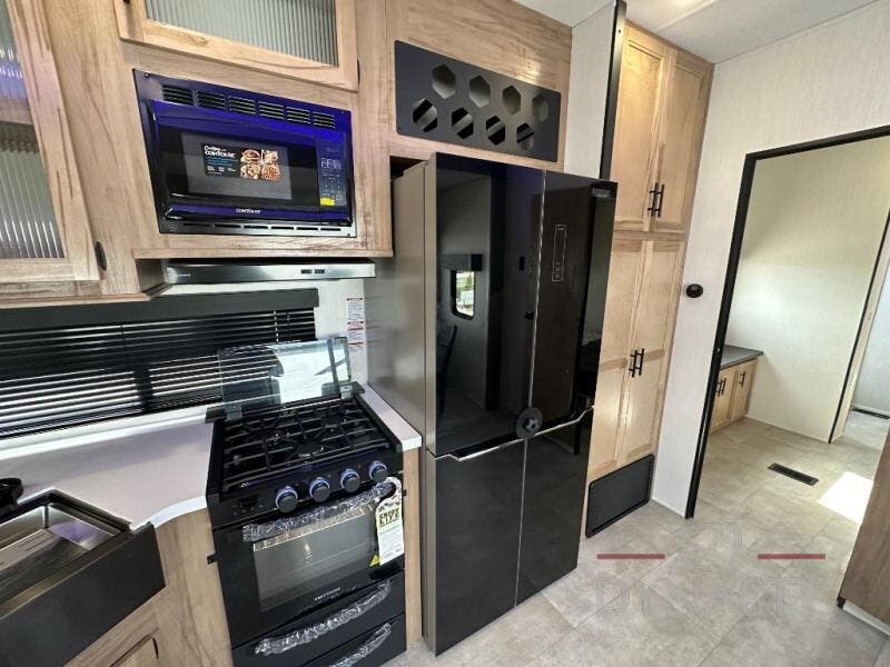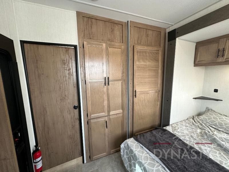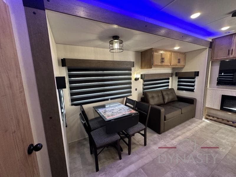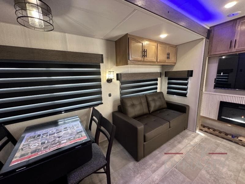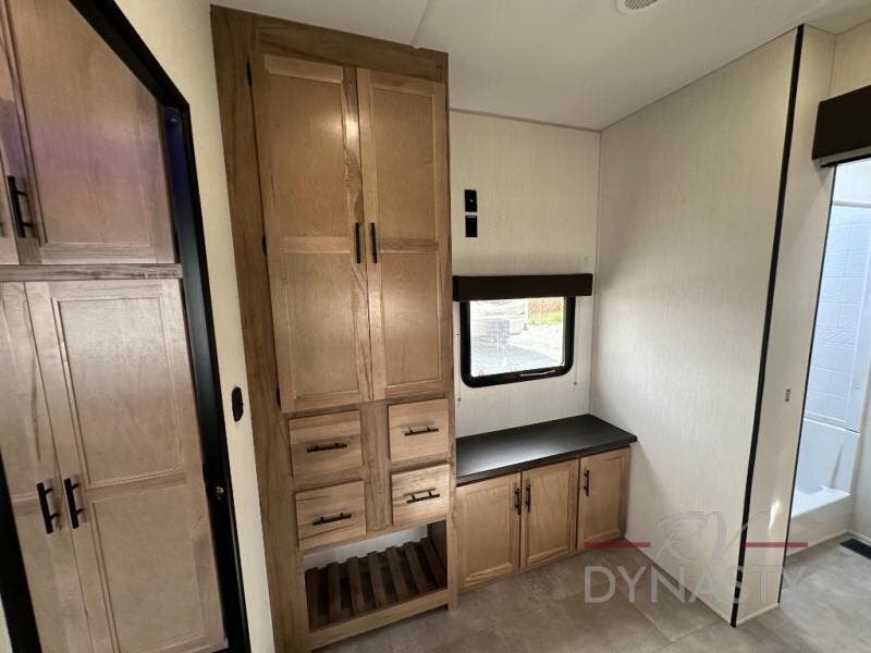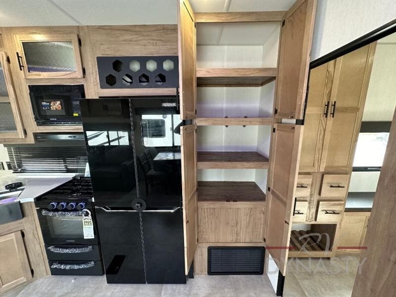 Spacious and comfortable is how you will describe this destination travel trailer featuring triple slides, two full baths, and a spacious combined kitchen and living area thanks to the large slide here featuring a free standing dinette and sofa. The kitchen includes everything you need to comfortably cook while you are away, and allows you to make meals for your family just like at home. There is a large pantry where you can keep plenty of snacks and dry goods for your trip. In the rear of the coach, there is a private bedroom featuring a queen bed slide for added space, comfortable sleeping, as well as ample storage between a dresser and wardrobe for your clothing. In the very back, a master suite bath featuring a vanity with sink, a shower with a seat, and linen storage for your towels and toiletries. This front bedroom also features a king bed slide!