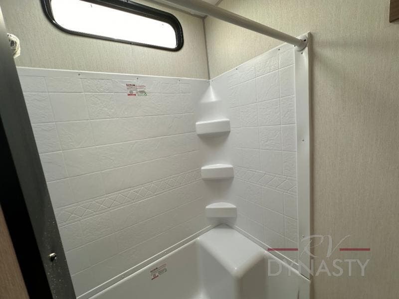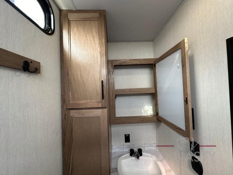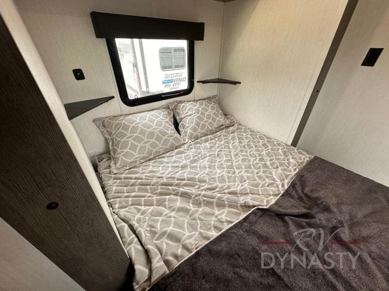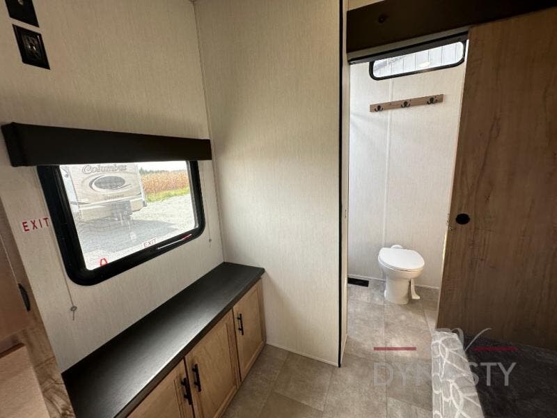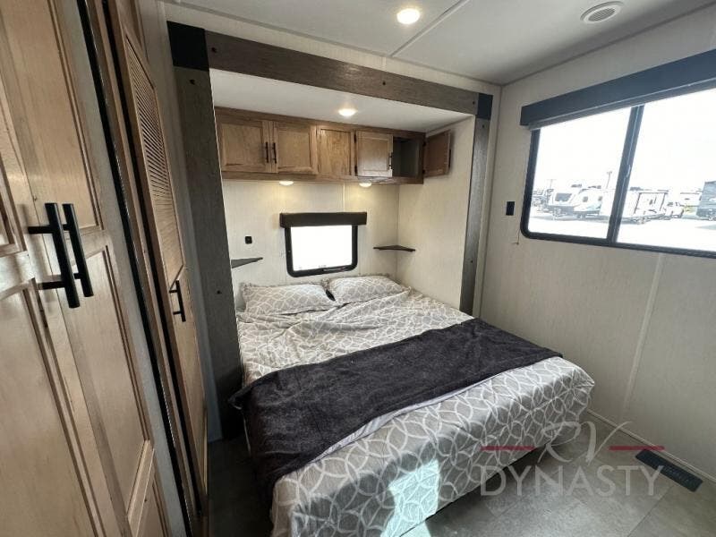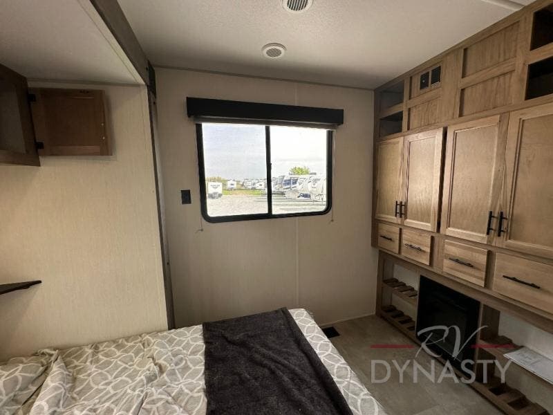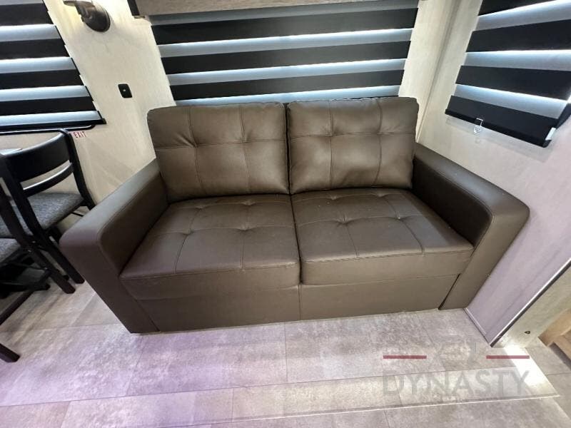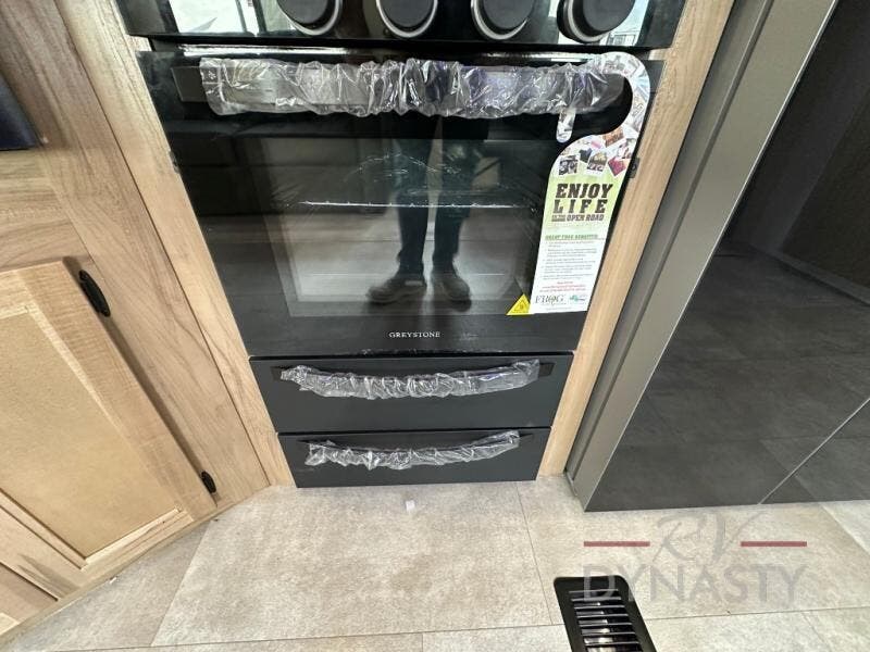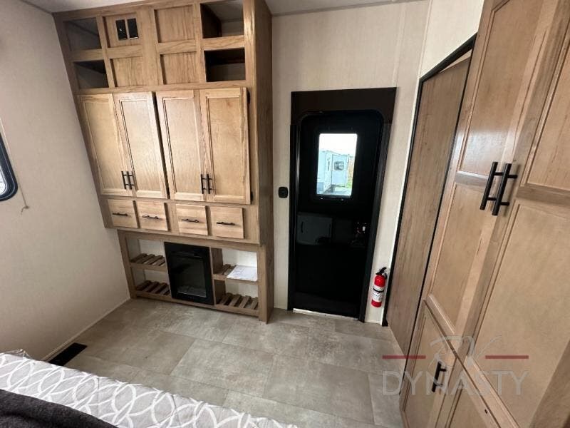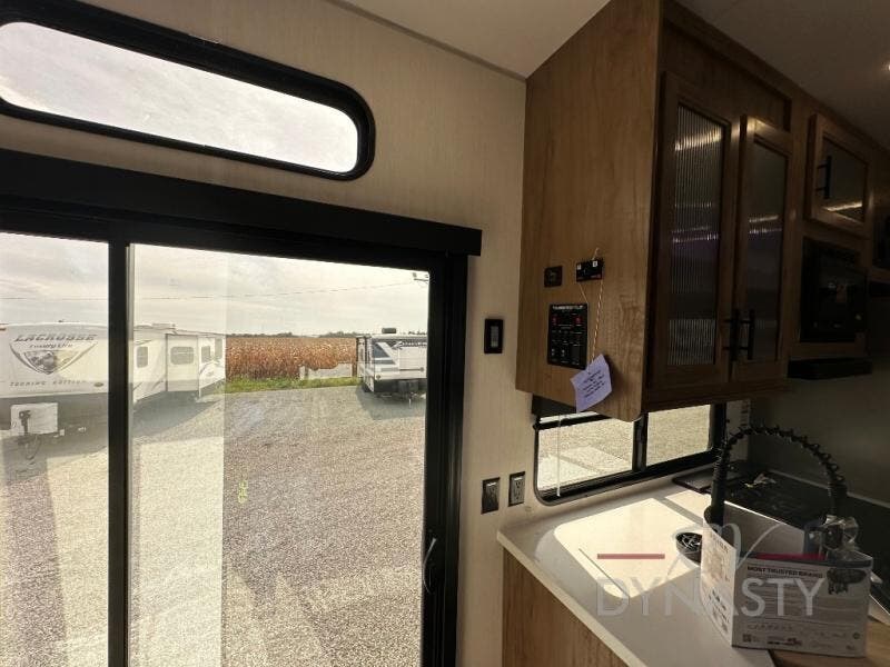 Spacious and comfortable is how you will describe this destination travel trailer featuring triple slides, two full baths, and a spacious combined kitchen and living area thanks to the large slide here featuring a free standing dinette and sofa. The kitchen includes everything you need to comfortably cook while you are away, and allows you to make meals for your family just like at home. There is a large pantry where you can keep plenty of snacks and dry goods for your trip. In the rear of the coach, there is a private bedroom featuring a queen bed slide for added space, comfortable sleeping, as well as ample storage between a dresser and wardrobe for your clothing. In the very back, a master suite bath featuring a vanity with sink, a shower with a seat, and linen storage for your towels and toiletries. This front bedroom also features a king bed slide!