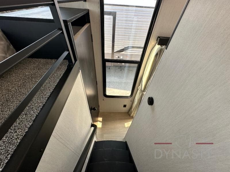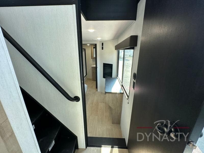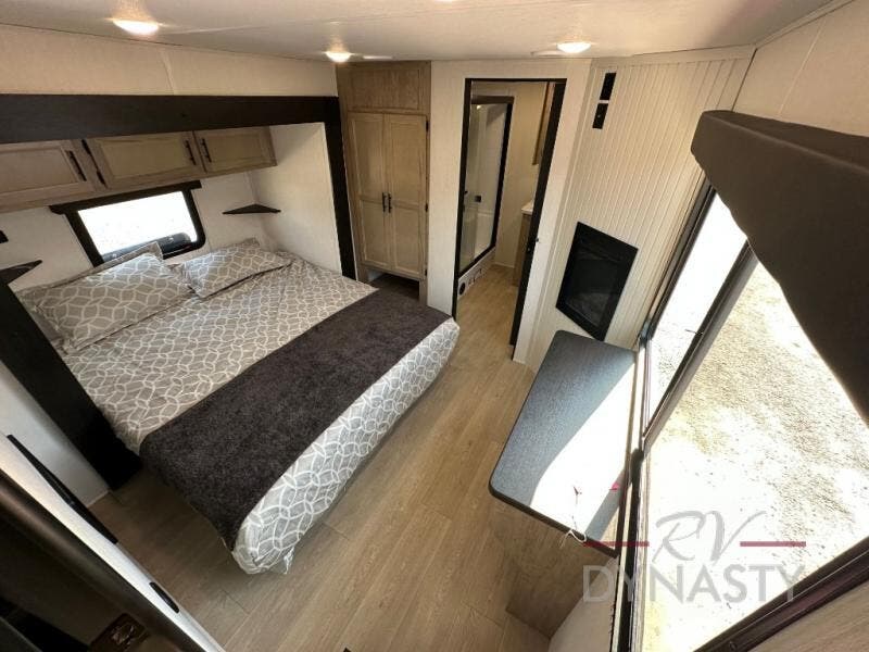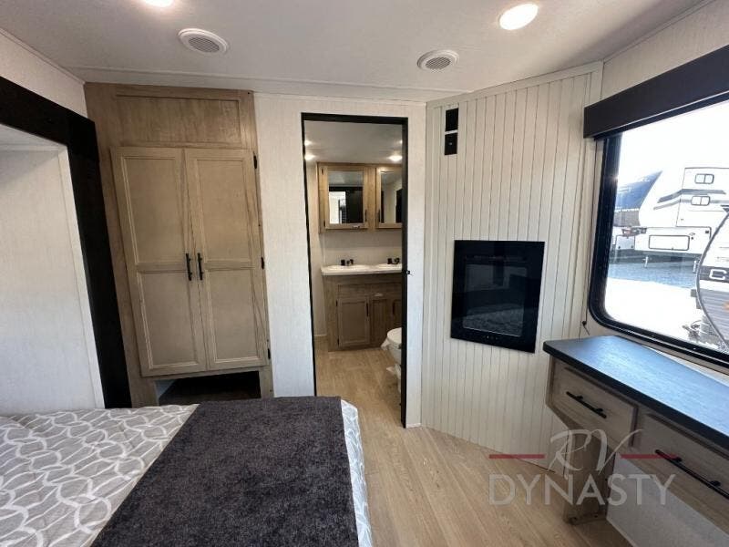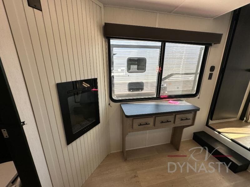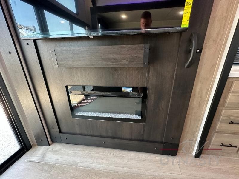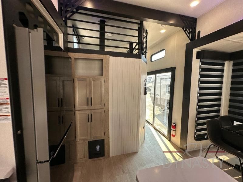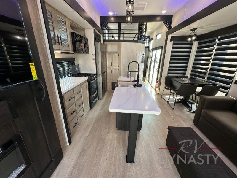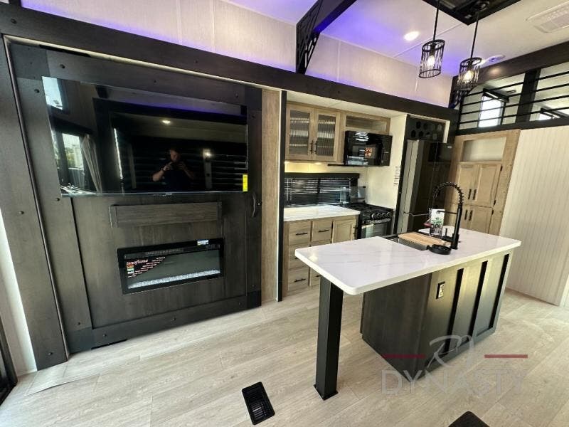 Choosing this destination trailer as your next RV won't be a hard decision! You can enter in through the front bath that includes dual bath sinks, a shower with a seat, and a medicine cabinet for your necessities. The master bedroom is connected to this bath for added convenience, and you're sure to enjoy the bedroom fireplace and king bed slide out. Just outside this room are the stairs that lead to the loft where you'll find two queen-size beds on one side and an open area where the kids can play or to use as storage. A second full bath is found next the stairs on the lower level, and there is a wardrobe with washer/dryer prep if you want to add these appliances. Everyone will love to join together and visit in the combined kitchen and living room. Here, you'll find a free-standing dinette, an L-shaped sofa, a kitchen island with two chairs, plus an entertainment center with a fireplace! The hidden pantry behind the fireplace will let you keep food stocked, and the rear patio doors will let natural light in!