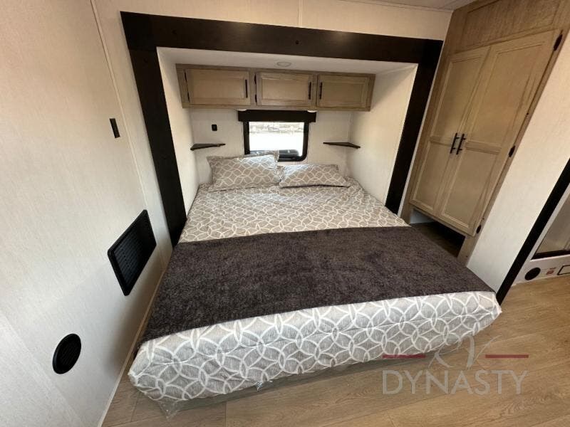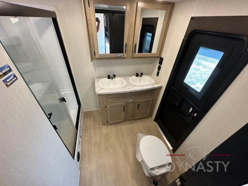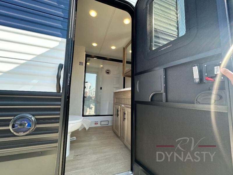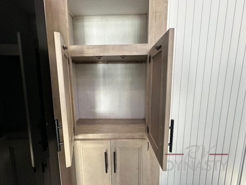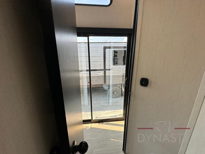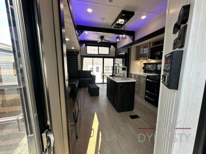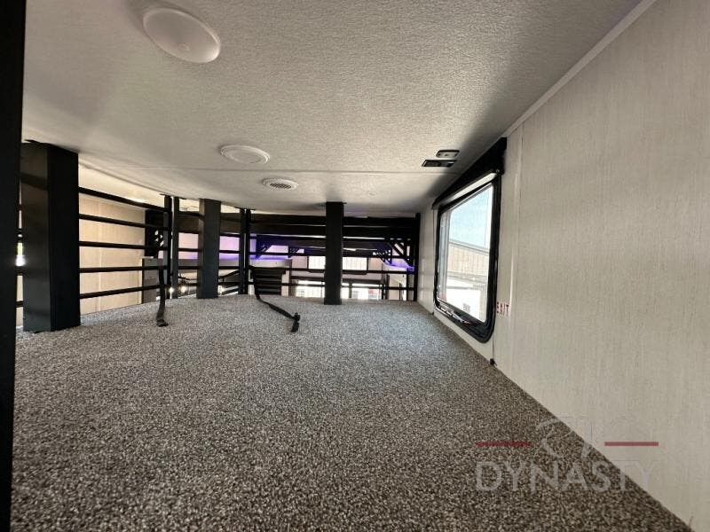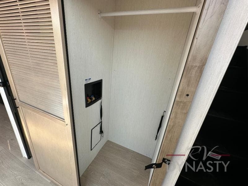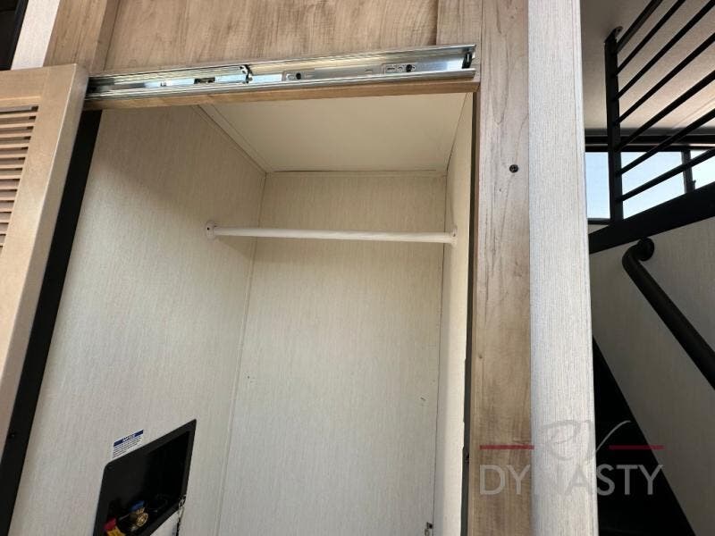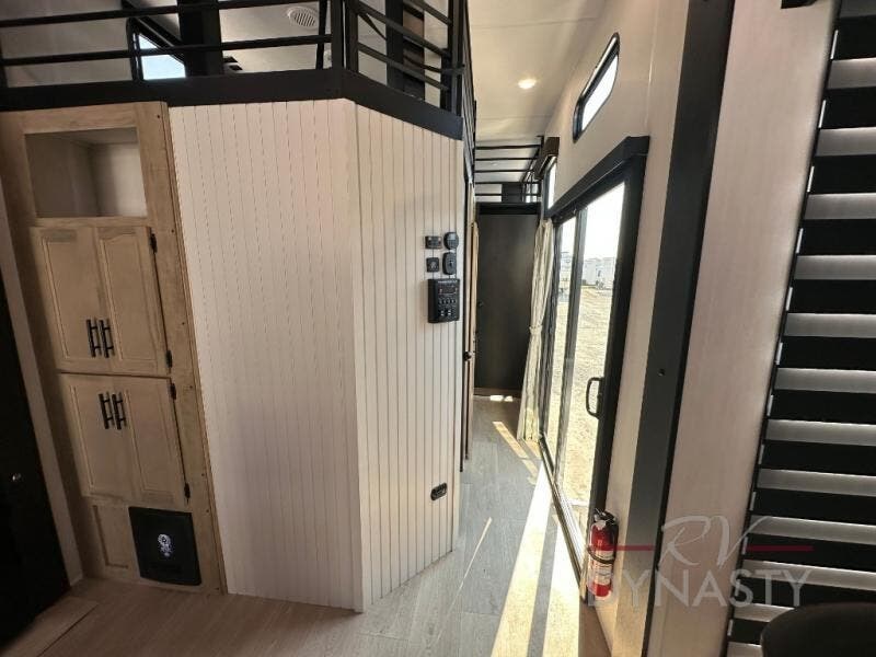 Choosing this destination trailer as your next RV won't be a hard decision! You can enter in through the front bath that includes dual bath sinks, a shower with a seat, and a medicine cabinet for your necessities. The master bedroom is connected to this bath for added convenience, and you're sure to enjoy the bedroom fireplace and king bed slide out. Just outside this room are the stairs that lead to the loft where you'll find two queen-size beds on one side and an open area where the kids can play or to use as storage. A second full bath is found next the stairs on the lower level, and there is a wardrobe with washer/dryer prep if you want to add these appliances. Everyone will love to join together and visit in the combined kitchen and living room. Here, you'll find a free-standing dinette, an L-shaped sofa, a kitchen island with two chairs, plus an entertainment center with a fireplace! The hidden pantry behind the fireplace will let you keep food stocked, and the rear patio doors will let natural light in!