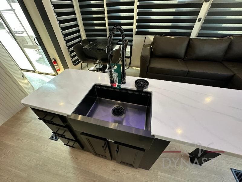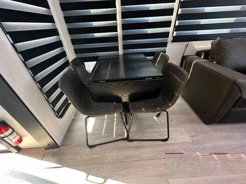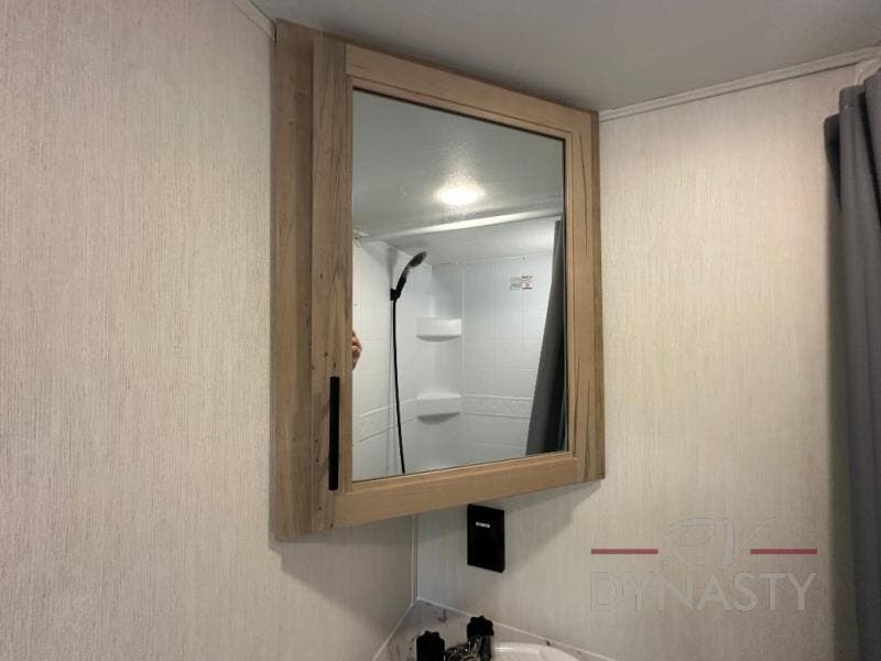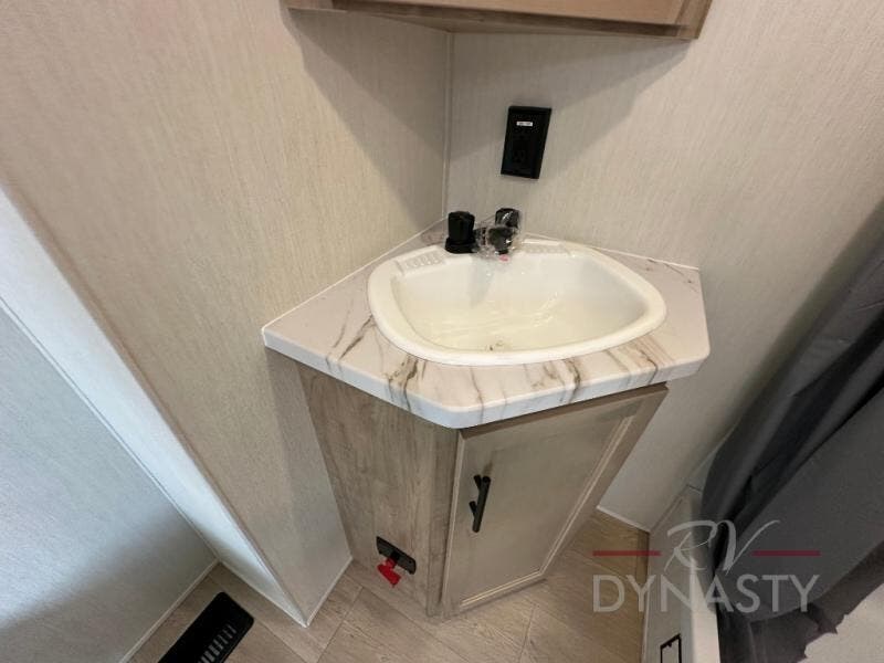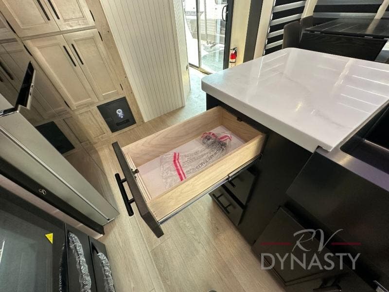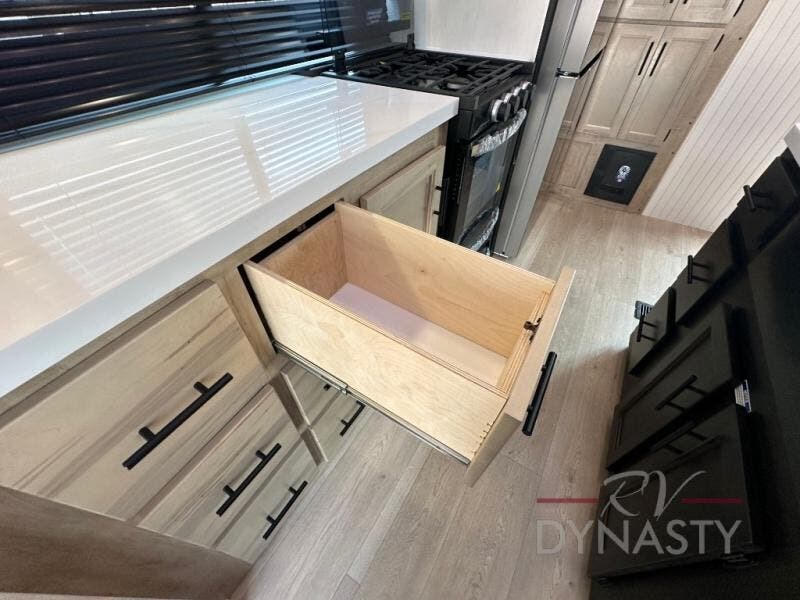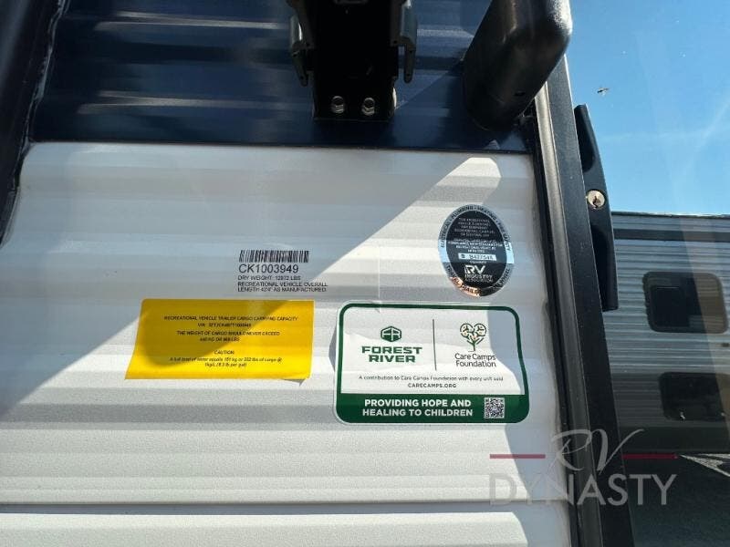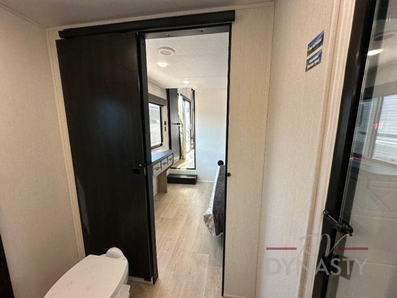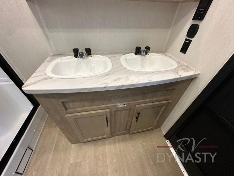 Choosing this destination trailer as your next RV won't be a hard decision! You can enter in through the front bath that includes dual bath sinks, a shower with a seat, and a medicine cabinet for your necessities. The master bedroom is connected to this bath for added convenience, and you're sure to enjoy the bedroom fireplace and king bed slide out. Just outside this room are the stairs that lead to the loft where you'll find two queen-size beds on one side and an open area where the kids can play or to use as storage. A second full bath is found next the stairs on the lower level, and there is a wardrobe with washer/dryer prep if you want to add these appliances. Everyone will love to join together and visit in the combined kitchen and living room. Here, you'll find a free-standing dinette, an L-shaped sofa, a kitchen island with two chairs, plus an entertainment center with a fireplace! The hidden pantry behind the fireplace will let you keep food stocked, and the rear patio doors will let natural light in!