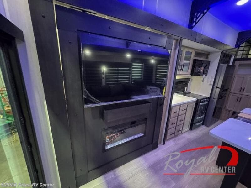 Choosing this destination trailer as your next RV won't be a hard decision! You can enter in through the front bath that includes dual bath sinks, a shower with a seat, and a medicine cabinet for your necessities. The master bedroom is connected to this bath for added convenience, and you're sure to enjoy the bedroom fireplace and king bed slide out. Just outside this room are the stairs that lead to the loft where you'll find two queen-size beds on one side and an open area where the kids can play or to use as storage. A second full bath is found next the stairs on the lower level, and there is a wardrobe with washer/dryer prep if you want to add these appliances. Everyone will love to join together and visit in the combined kitchen and living room. Here, you'll find a free-standing dinette, an L-shaped sofa, a kitchen island with two chairs, plus an entertainment center with a fireplace! The hidden pantry behind the fireplace will let you keep food stocked, and the rear patio doors will let natural light in!
