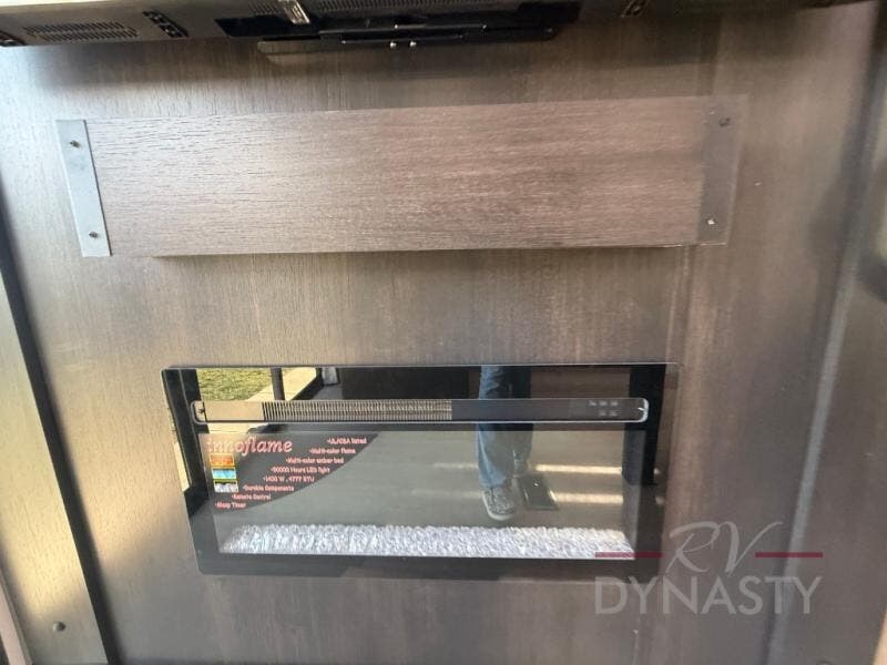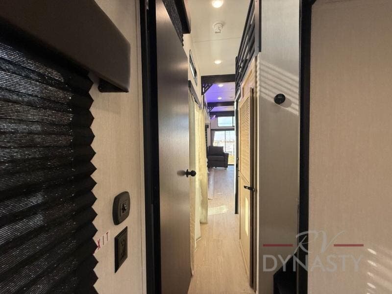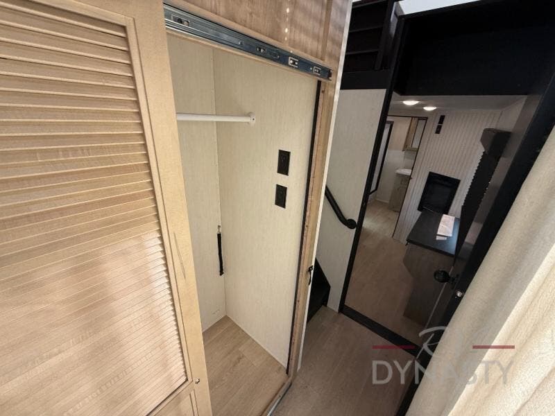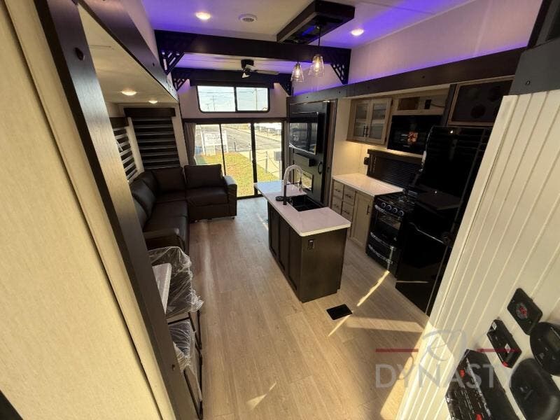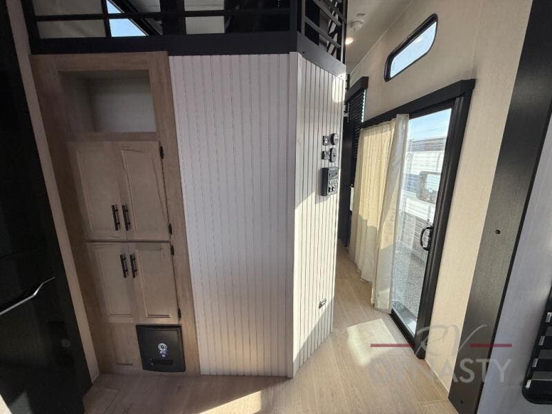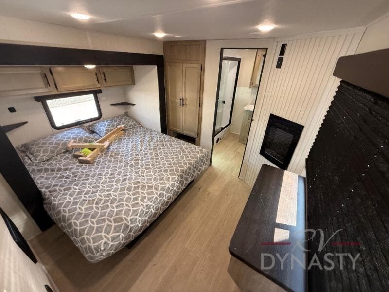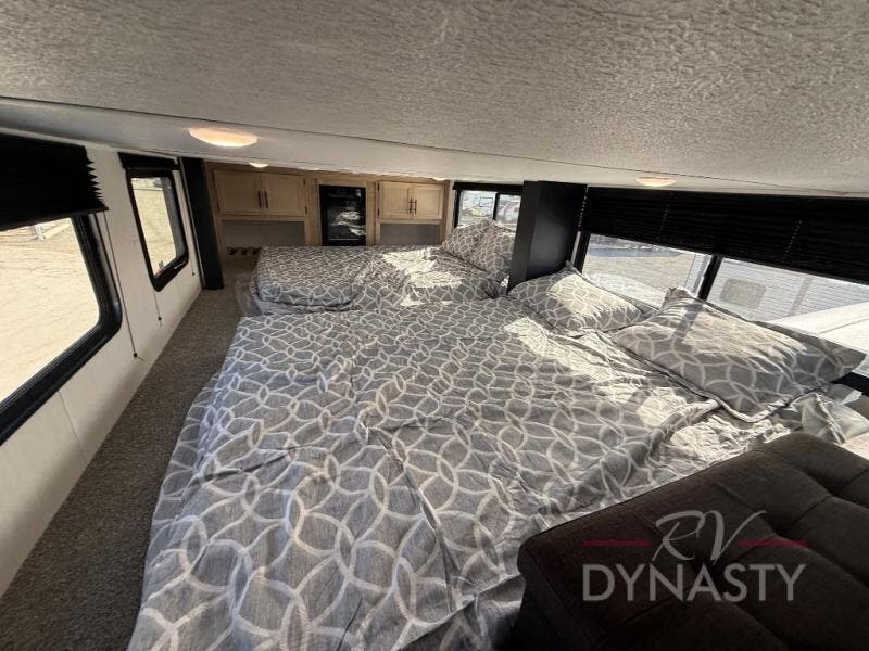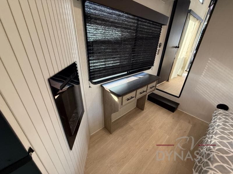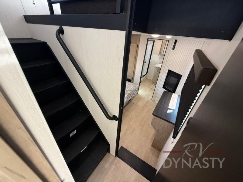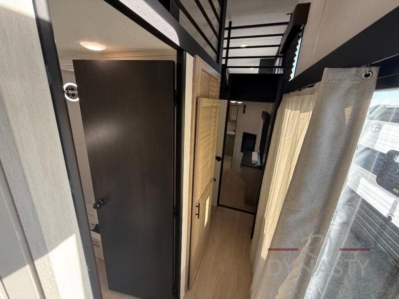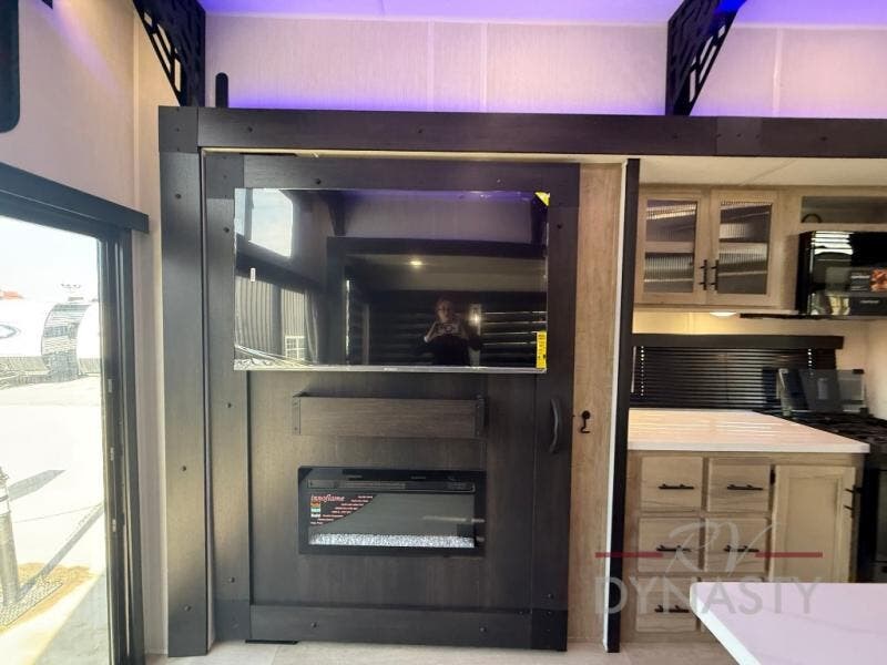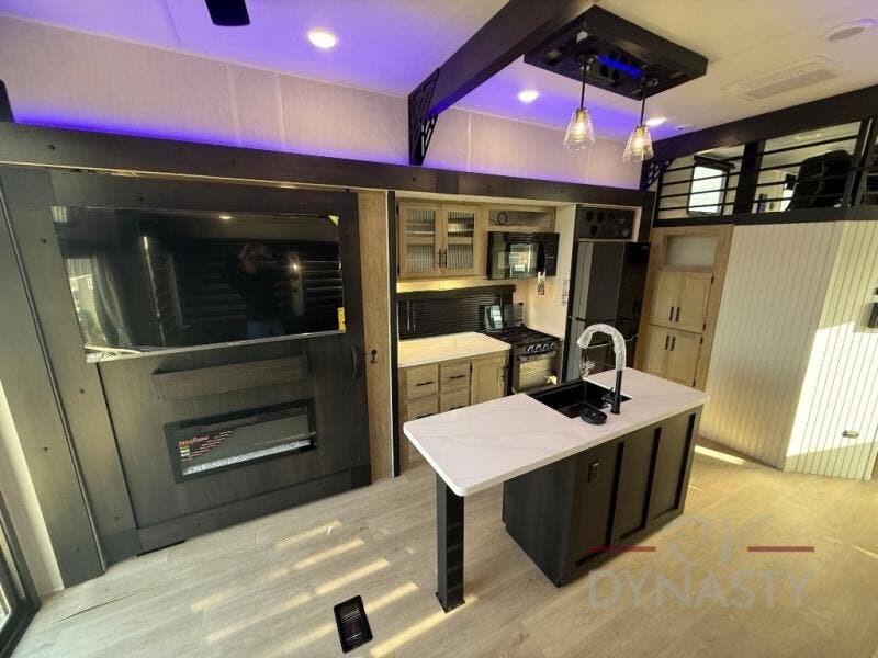 Choosing this destination trailer as your next RV won't be a hard decision! You can enter in through the front bath that includes dual bath sinks, a shower with a seat, and a medicine cabinet for your necessities. The master bedroom is connected to this bath for added convenience, and you're sure to enjoy the bedroom fireplace and king bed slide out. Just outside this room are the stairs that lead to the loft where you'll find two queen-size beds on one side and an open area where the kids can play or to use as storage. A second full bath is found next the stairs on the lower level, and there is a wardrobe with washer/dryer prep if you want to add these appliances. Everyone will love to join together and visit in the combined kitchen and living room. Here, you'll find a free-standing dinette, an L-shaped sofa, a kitchen island with two chairs, plus an entertainment center with a fireplace! The hidden pantry behind the fireplace will let you keep food stocked, and the rear patio doors will let natural light in!