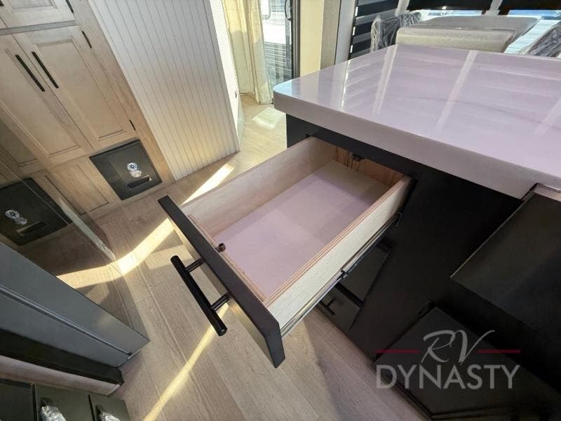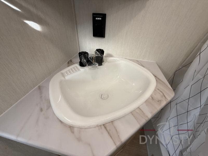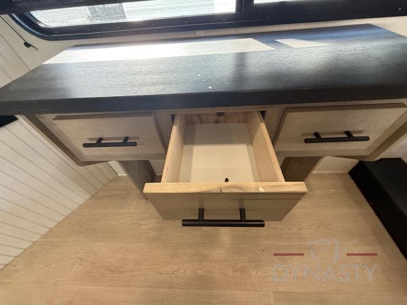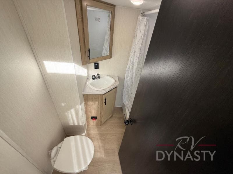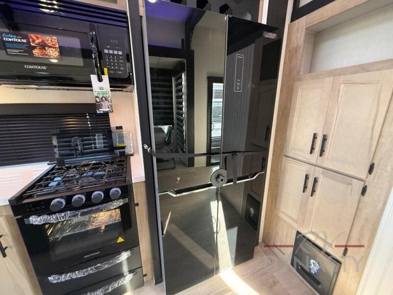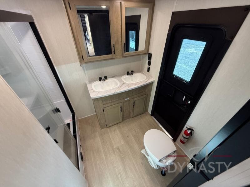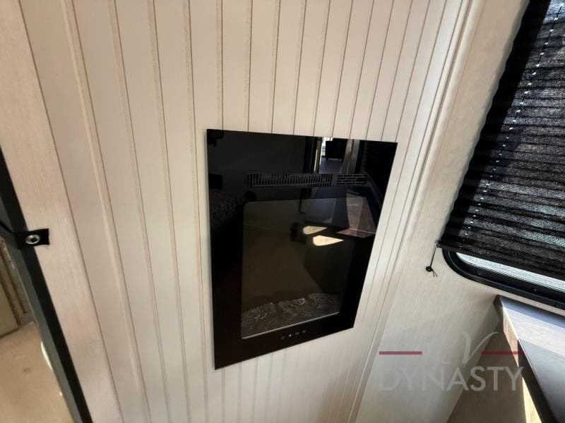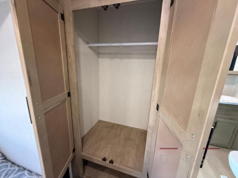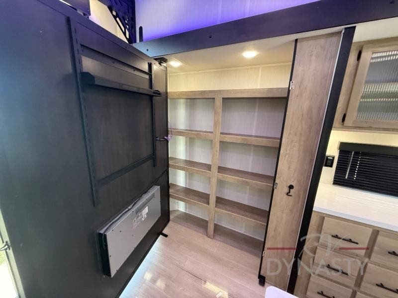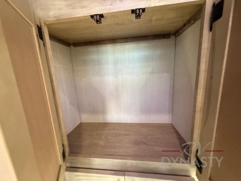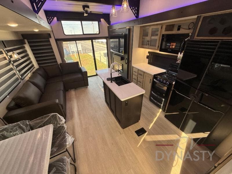 Choosing this destination trailer as your next RV won't be a hard decision! You can enter in through the front bath that includes dual bath sinks, a shower with a seat, and a medicine cabinet for your necessities. The master bedroom is connected to this bath for added convenience, and you're sure to enjoy the bedroom fireplace and king bed slide out. Just outside this room are the stairs that lead to the loft where you'll find two queen-size beds on one side and an open area where the kids can play or to use as storage. A second full bath is found next the stairs on the lower level, and there is a wardrobe with washer/dryer prep if you want to add these appliances. Everyone will love to join together and visit in the combined kitchen and living room. Here, you'll find a free-standing dinette, an L-shaped sofa, a kitchen island with two chairs, plus an entertainment center with a fireplace! The hidden pantry behind the fireplace will let you keep food stocked, and the rear patio doors will let natural light in!