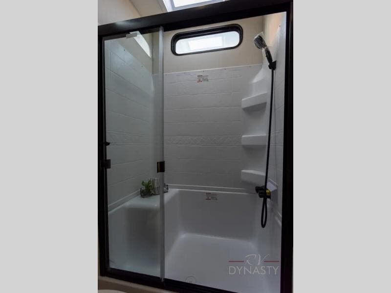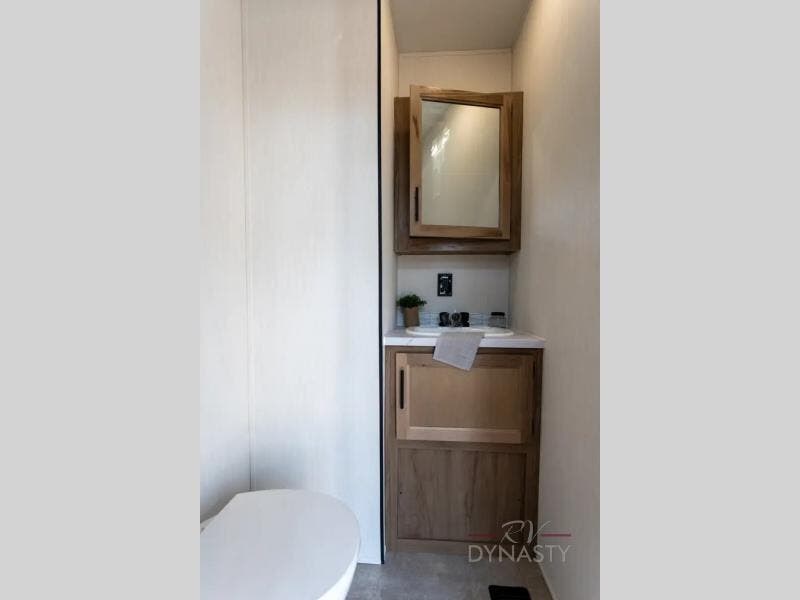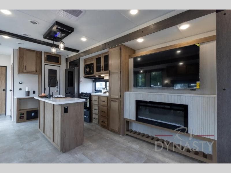 Spacious and comfortable describe this destination travel trailer featuring triple slides with dual opposing slides in the living area which creates a wide open space for a dining table and four chairs, two lounge chairs, an entertainment center with a fireplace, and a hide-a-bed sofa along the very front wall. The roadside slide also houses the kitchen appliances which include a refrigerator, stove and microwave oven. There is a pantry and a hutch adjacent to the slide, and a kitchen island for more food prep space, and this is where your sink is located so you can be facing all of the seating areas in the room while prepping meals and doing the dishes. A centrally located half bath is convenient just inside the main patio door entry. Towards the rear of the coach, a private bedroom featuring a king bed slide along with storage space for your clothing. In the very back, a master suite bath featuring a vanity with dual sinks, a shower with a seat, linen storage, and a wardrobe that has been prepped for a washer and dryer if you choose to add. You will love the outside TV mount and 21' covered awning space to create a nice size outdoor living area to enjoy on sunny days or pleasant evenings.