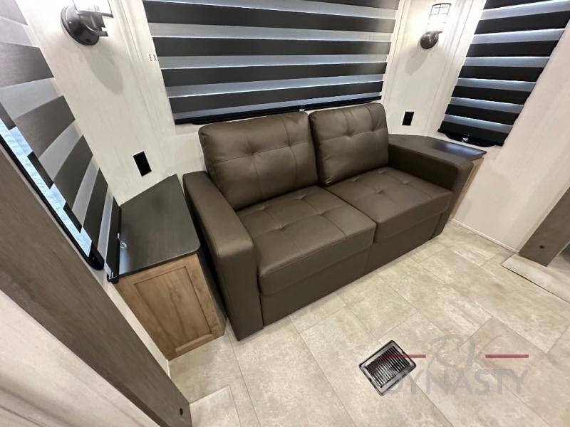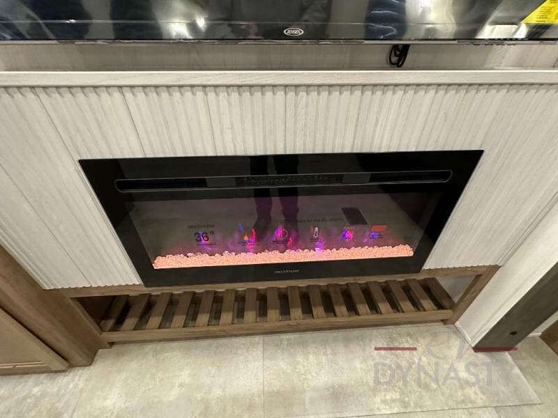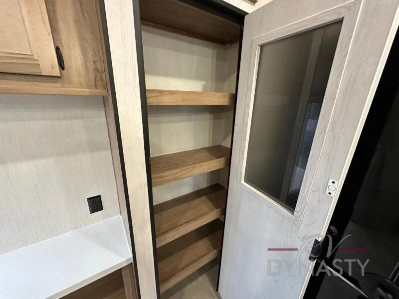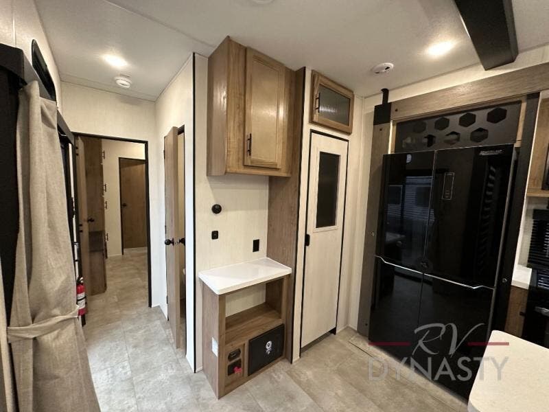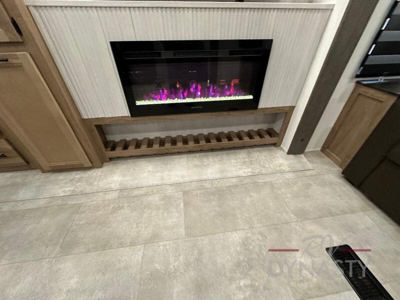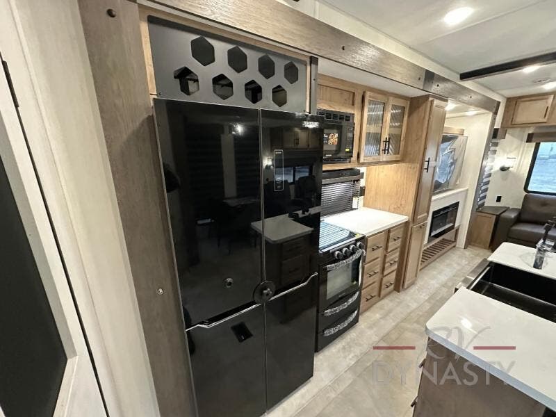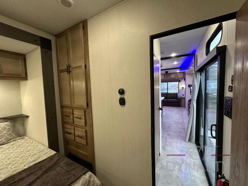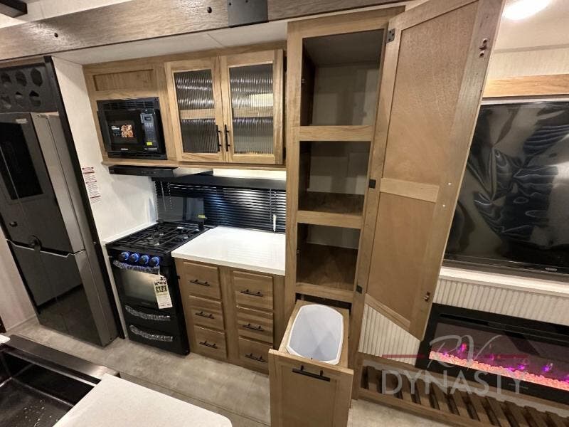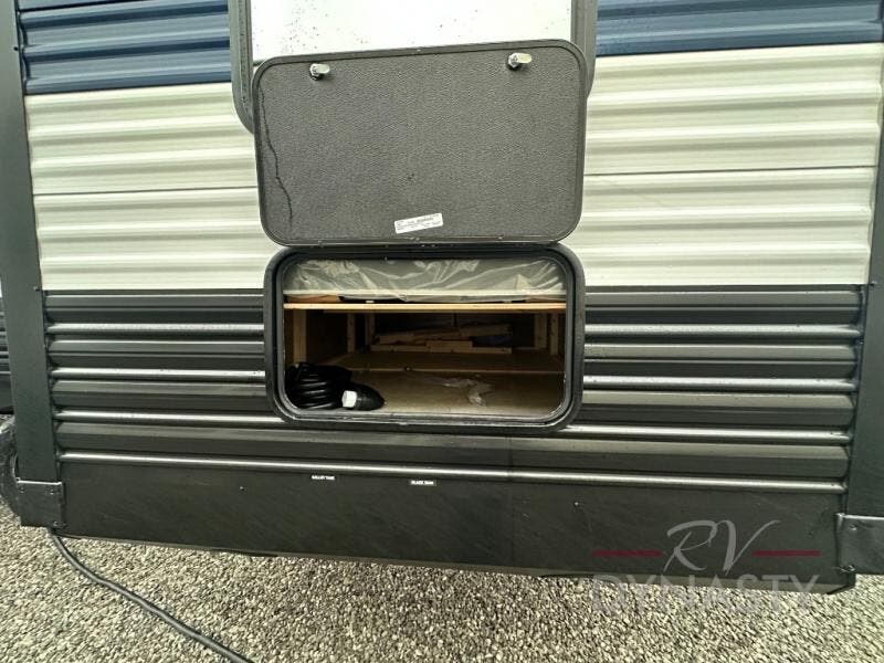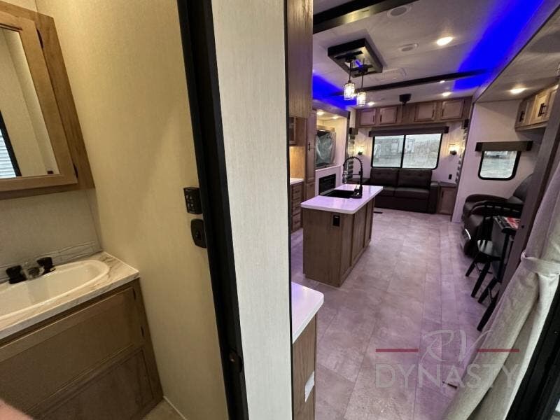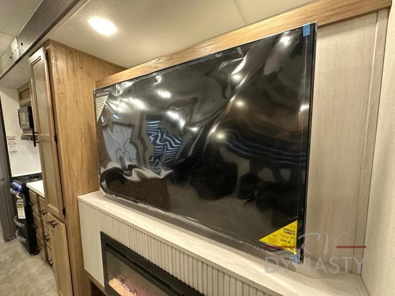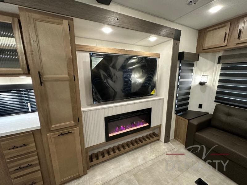 Spacious and comfortable describe this destination travel trailer featuring triple slides with dual opposing slides in the living area which creates a wide open space for a dining table and four chairs, two lounge chairs, an entertainment center with a fireplace, and a hide-a-bed sofa along the very front wall. The roadside slide also houses the kitchen appliances which include a refrigerator, stove and microwave oven. There is a pantry and a hutch adjacent to the slide, and a kitchen island for more food prep space, and this is where your sink is located so you can be facing all of the seating areas in the room while prepping meals and doing the dishes. A centrally located half bath is convenient just inside the main patio door entry. Towards the rear of the coach, a private bedroom featuring a king bed slide along with storage space for your clothing. In the very back, a master suite bath featuring a vanity with dual sinks, a shower with a seat, linen storage, and a wardrobe that has been prepped for a washer and dryer if you choose to add. You will love the outside TV mount and 21' covered awning space to create a nice size outdoor living area to enjoy on sunny days or pleasant evenings.