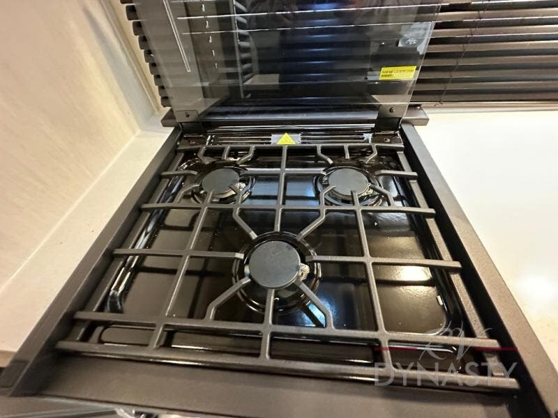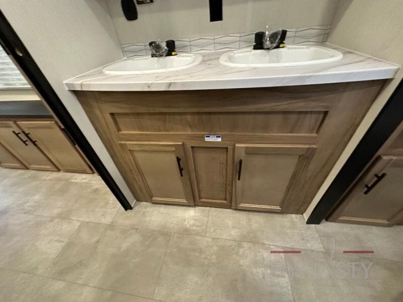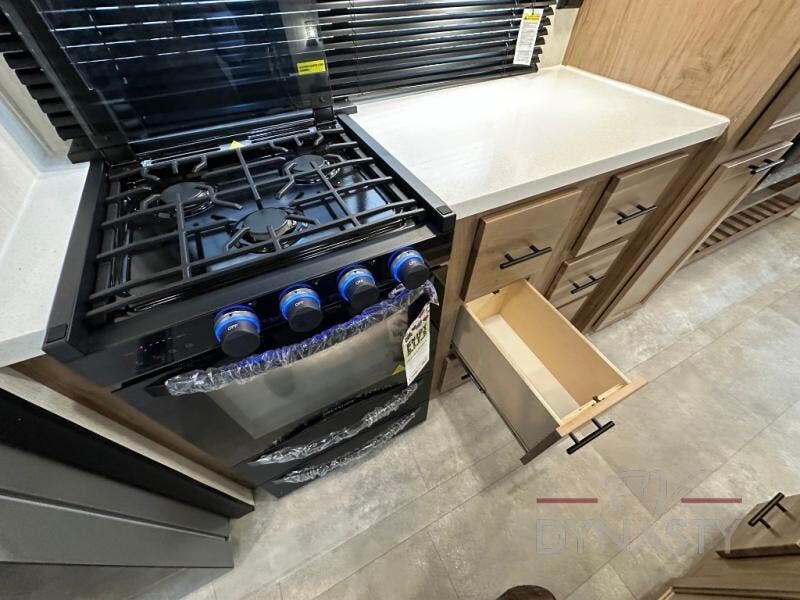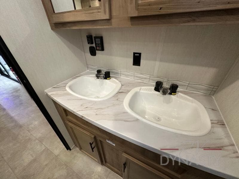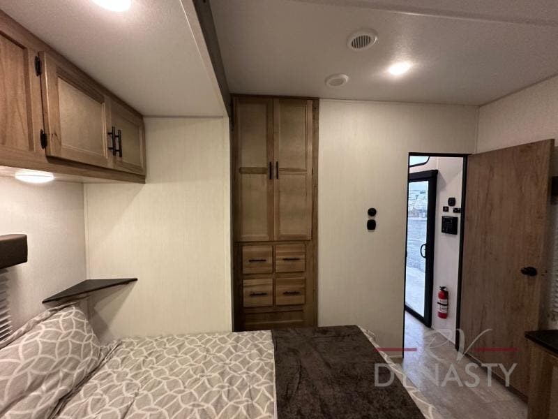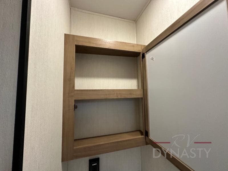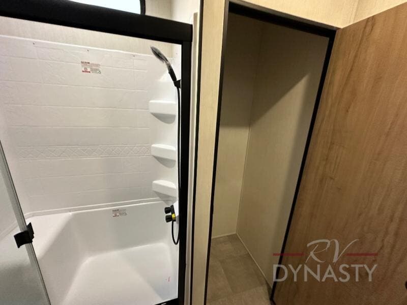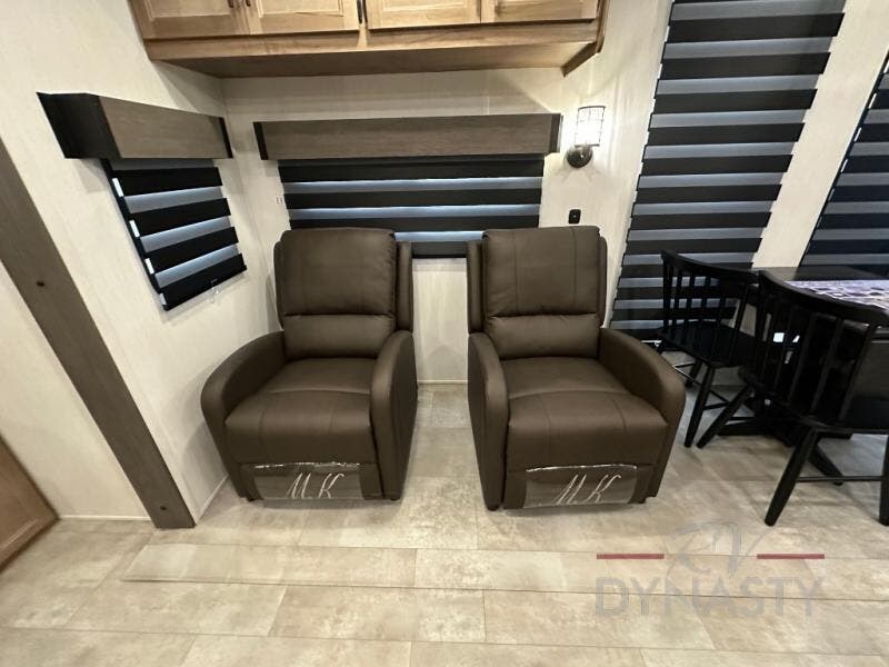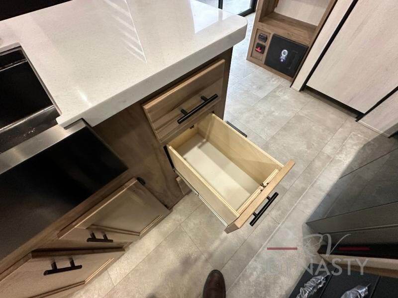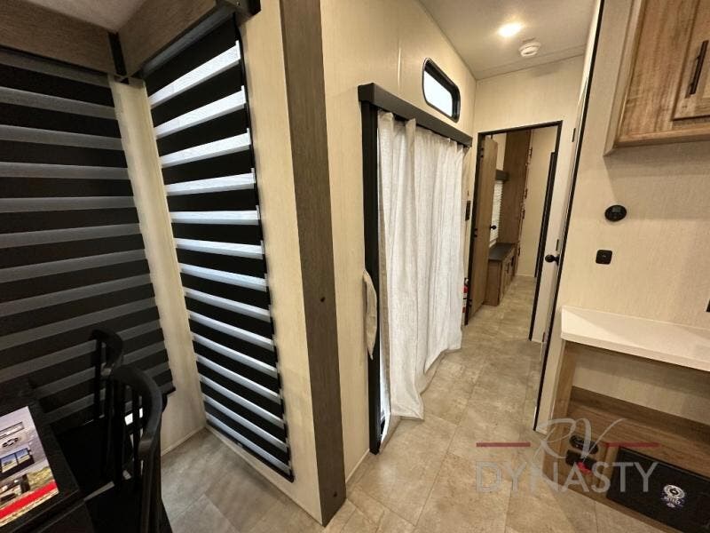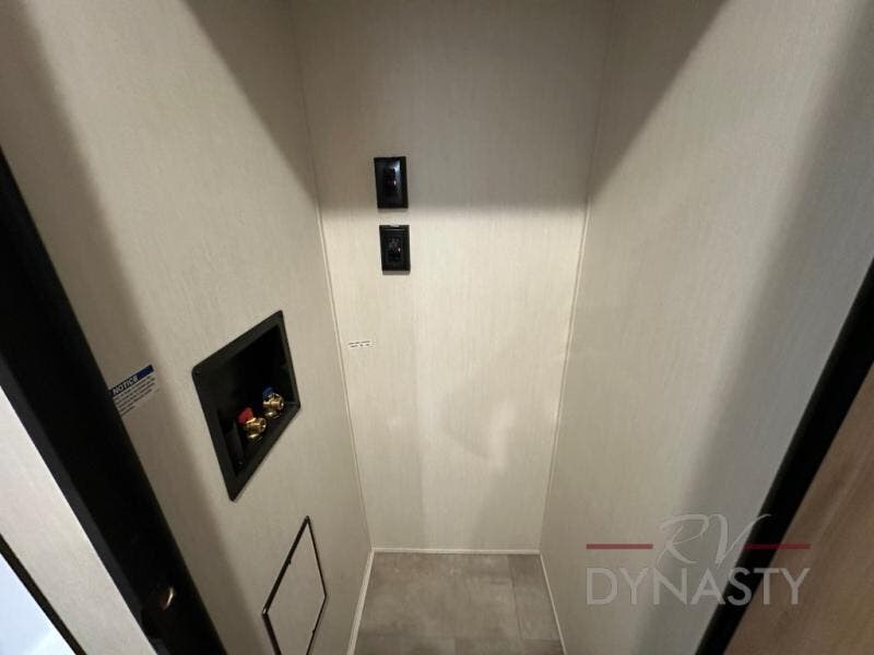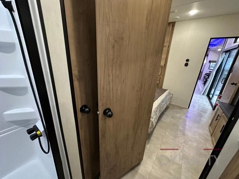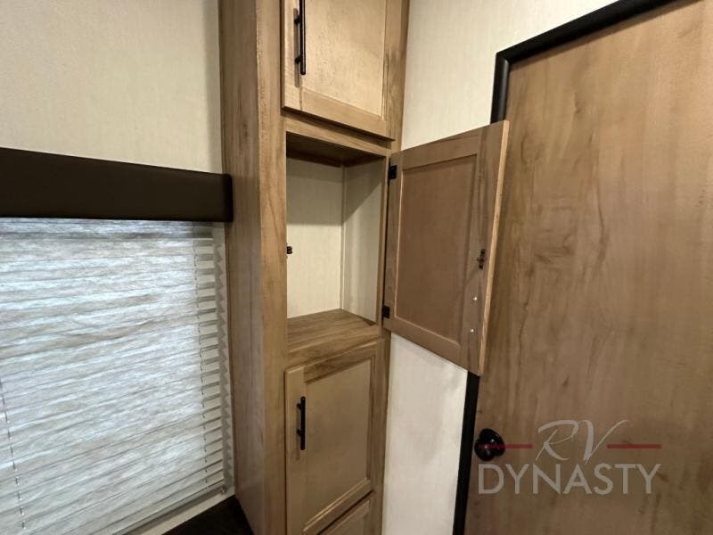 Spacious and comfortable describe this destination travel trailer featuring triple slides with dual opposing slides in the living area which creates a wide open space for a dining table and four chairs, two lounge chairs, an entertainment center with a fireplace, and a hide-a-bed sofa along the very front wall. The roadside slide also houses the kitchen appliances which include a refrigerator, stove and microwave oven. There is a pantry and a hutch adjacent to the slide, and a kitchen island for more food prep space, and this is where your sink is located so you can be facing all of the seating areas in the room while prepping meals and doing the dishes. A centrally located half bath is convenient just inside the main patio door entry. Towards the rear of the coach, a private bedroom featuring a king bed slide along with storage space for your clothing. In the very back, a master suite bath featuring a vanity with dual sinks, a shower with a seat, linen storage, and a wardrobe that has been prepped for a washer and dryer if you choose to add. You will love the outside TV mount and 21' covered awning space to create a nice size outdoor living area to enjoy on sunny days or pleasant evenings.
