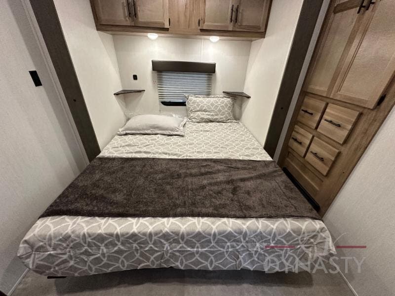 Enjoy comforts of home wherever you decide to roam in a Timberwolf destination trailer by Forest River. The seamless roofing membrane with heat reflectivity and power gear frame technology provide a durable foundation to your RV. You will also appreciate the exclusive solar thermo controlled reflective tinted safety glass windows, tire pressure monitors, and an on-demand tankless water heater to make extended stays easier than ever. Inside, the night shades will provide your crew with privacy, while the LED lights illuminate your space. There are also seamless countertops, along with a premium bedding ensemble and comforter, USB charging stations, a supersized central A/C unit, and many more comforts!