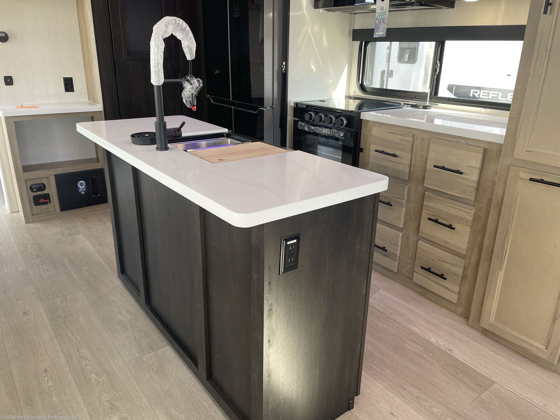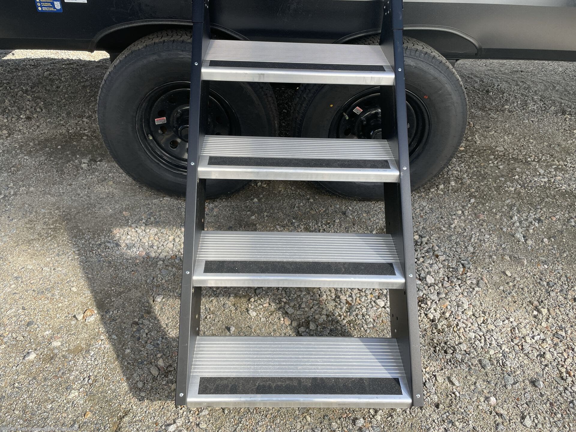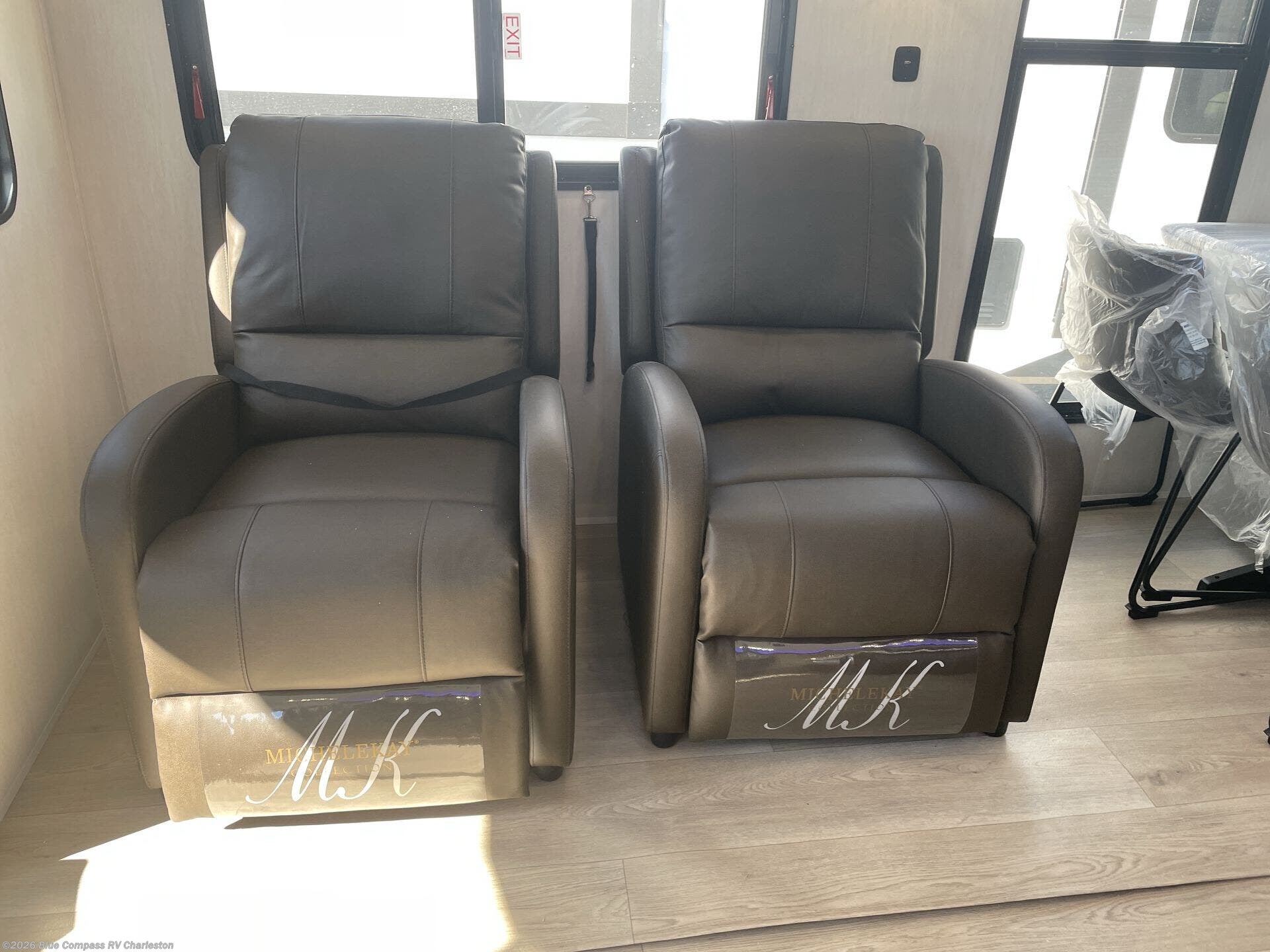 Spacious and comfortable describe this destination trailer perfectly! There are triple slides with dual opposing slides in the living area which create a wide open space for a dining table and four chairs, two lounge chairs, an entertainment center with a fireplace, and a hide-a-bed sofa along the very front wall. The roadside slide also houses the kitchen appliances which include a refrigerator, stove and microwave oven. There is a pantry and a hutch adjacent to the slide, and a kitchen island for more food prep space, and this is where your sink is located so you can be facing all of the seating areas in the room while prepping meals and doing the dishes. A centrally located half bath is convenient just inside the main patio door entry. Towards the rear of the coach, a private bedroom featuring a king bed slide along with storage space for your clothing. In the very back, a master suite bath featuring a vanity with dual sinks, a shower with a seat, linen storage, and a wardrobe that has been prepped for a washer and dryer if you choose to add. You will love the outside TV mount and 21' covered awning space to create a nice size outdoor living area to enjoy on sunny days or pleasant evenings.