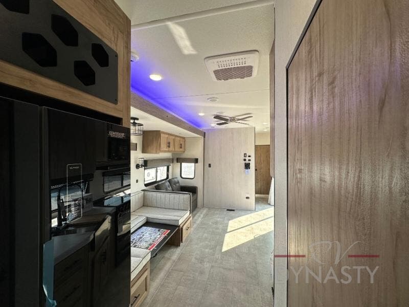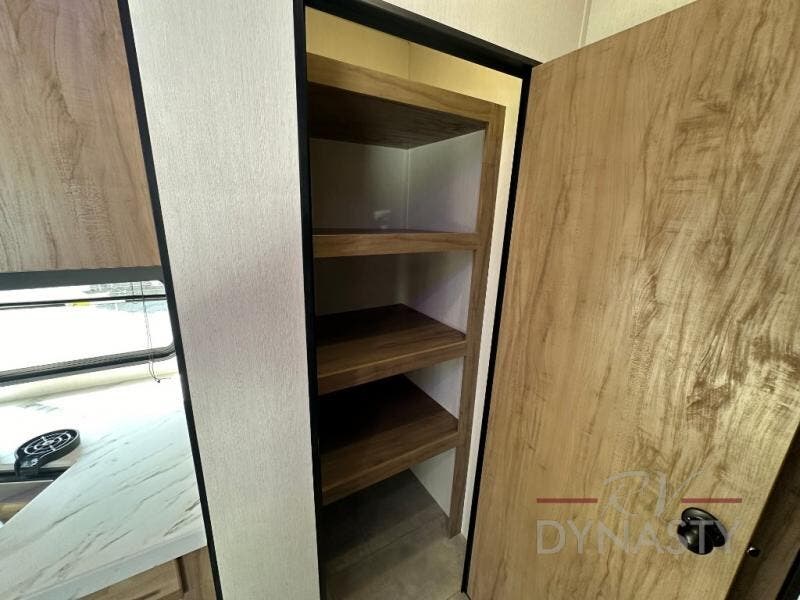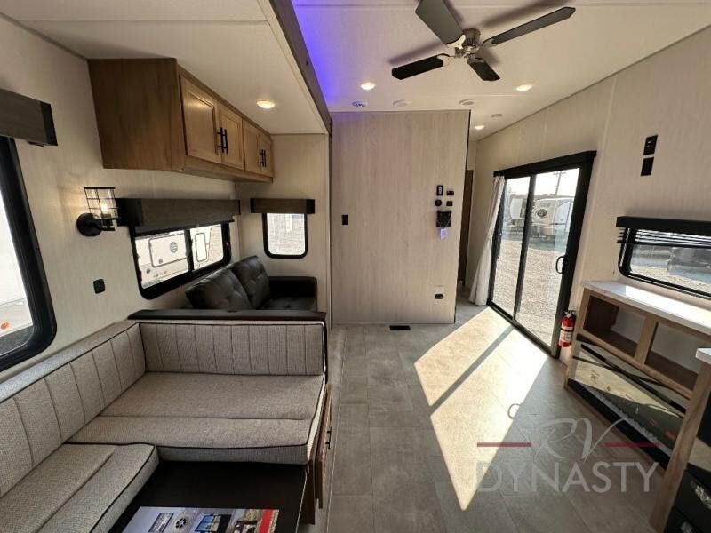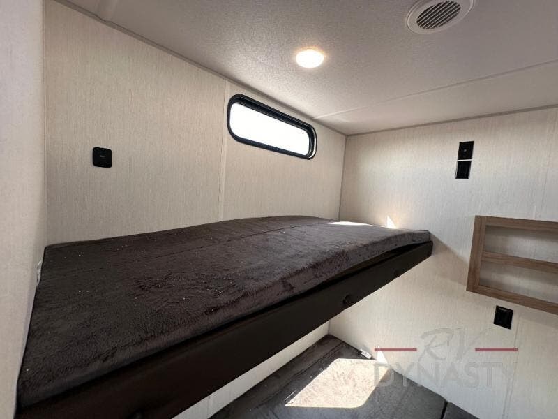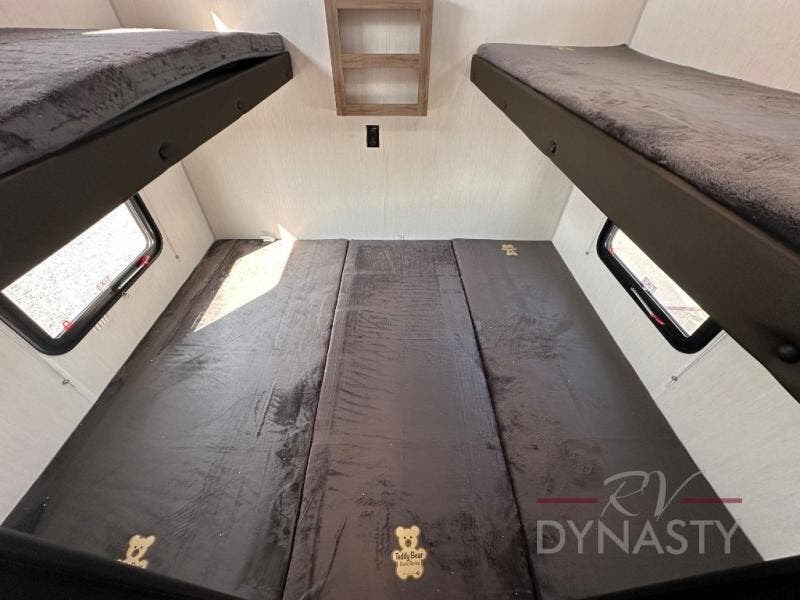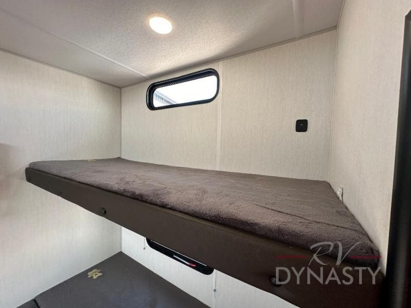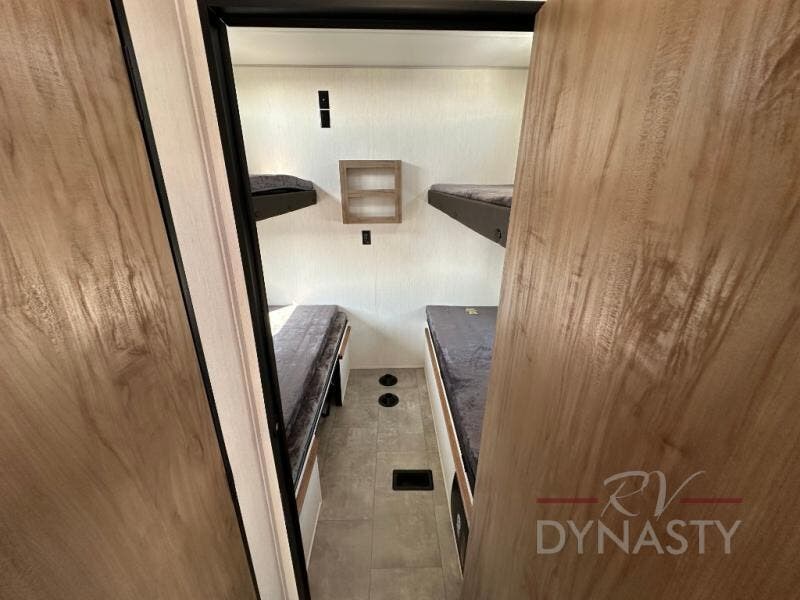 Ten can easily sleep in this destination travel trailer featuring a bunkhouse, large slide in the living area which creates a wide open space for a U-shaped dinette and sofa where you can enjoy the entertainment center with a fireplace. The kitchen is fully equipped with everything needed to create meals and snacks for your whole crew, and the walk-in pantry is great for storing all of your non-perishables. This space also features optional washer/dryer prep. In the very back, the bunkhouse features comfortable sleeping with double bunks on one side and double bunks with a hinged platform along the opposite side that the kids are sure to love. Up front, a side aisle bath featuring a shower with a seat, a vanity with medicine cabinet, and a toilet. You will also love the outside TV mount and 18' power awning space to create a nice size outdoor living area to enjoy on sunny days or pleasant evenings.