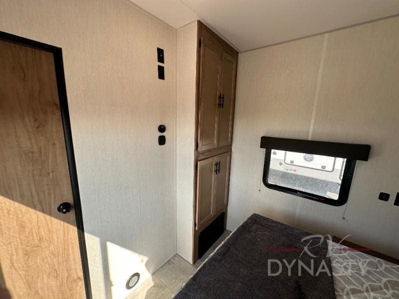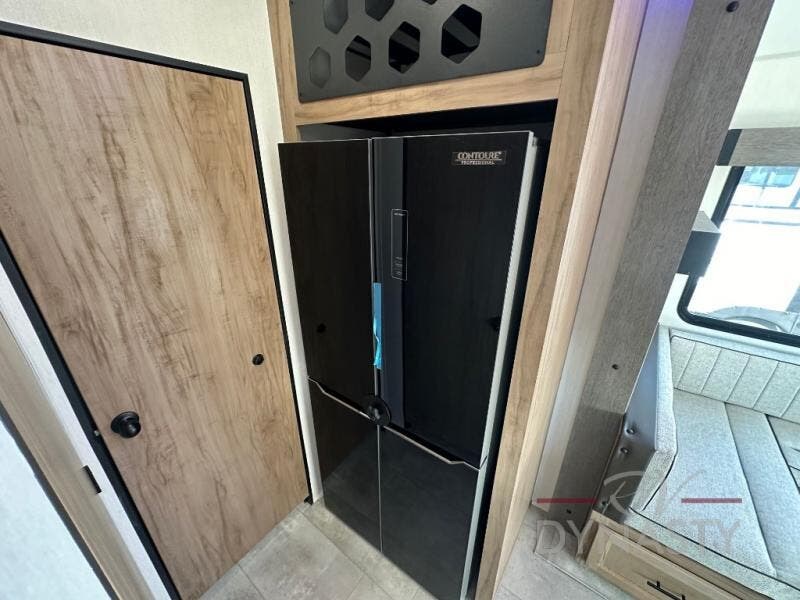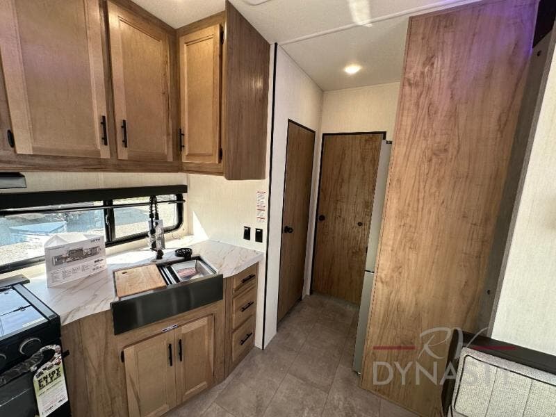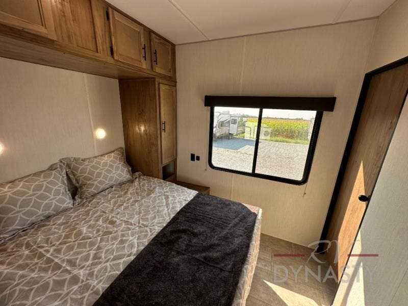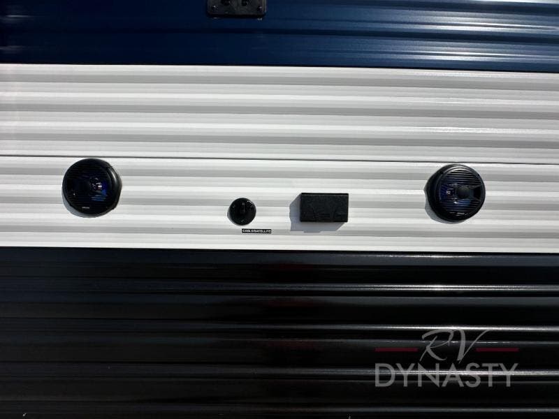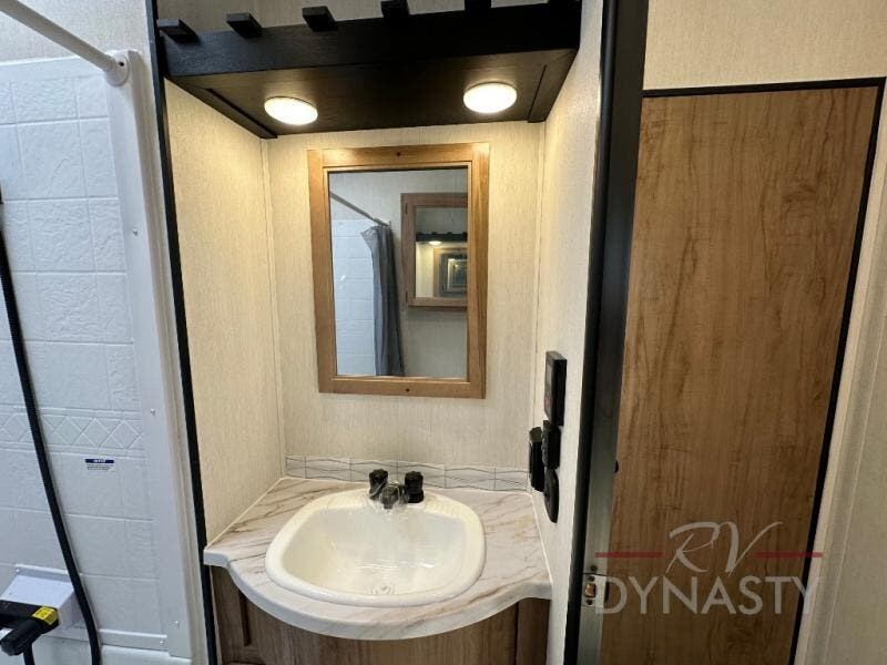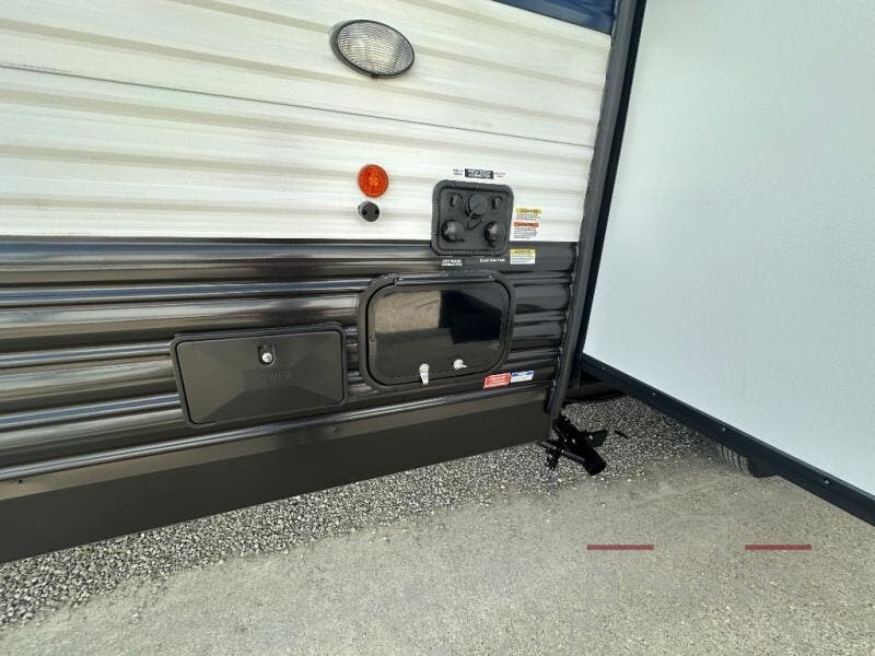 Ten can easily sleep in this destination travel trailer featuring a bunkhouse, large slide in the living area which creates a wide open space for a U-shaped dinette and sofa where you can enjoy the entertainment center with a fireplace. The kitchen is fully equipped with everything needed to create meals and snacks for your whole crew, and the walk-in pantry is great for storing all of your non-perishables. This space also features optional washer/dryer prep. In the very back, the bunkhouse features comfortable sleeping with double bunks on one side and double bunks with a hinged platform along the opposite side that the kids are sure to love. Up front, a side aisle bath featuring a shower with a seat, a vanity with medicine cabinet, and a toilet. You will also love the outside TV mount and 18' power awning space to create a nice size outdoor living area to enjoy on sunny days or pleasant evenings.
