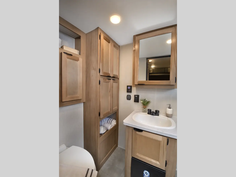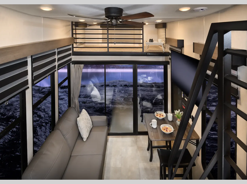 You will fall in love with this destination trailer that will feel more like a tiny home. There are steps leading up to the loft with a queen bed, cabinets, and even a fireplace! The kitchen includes a cooktop and a microwave oven to prepare meals, plus a refrigerator to keep perishables fresh. You'll enjoy relaxing on the hide-a-bed sofa, dining at the high top table, or reading a book on the lounge chair. There is also a rear deck with patio doors where you can spend your evenings together, and there is even a second loft above the deck for added sleeping or storage space!
