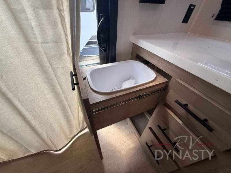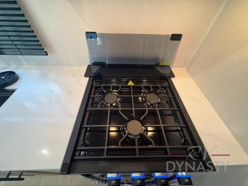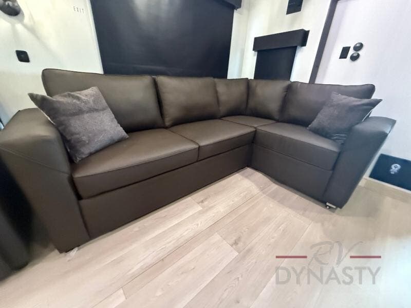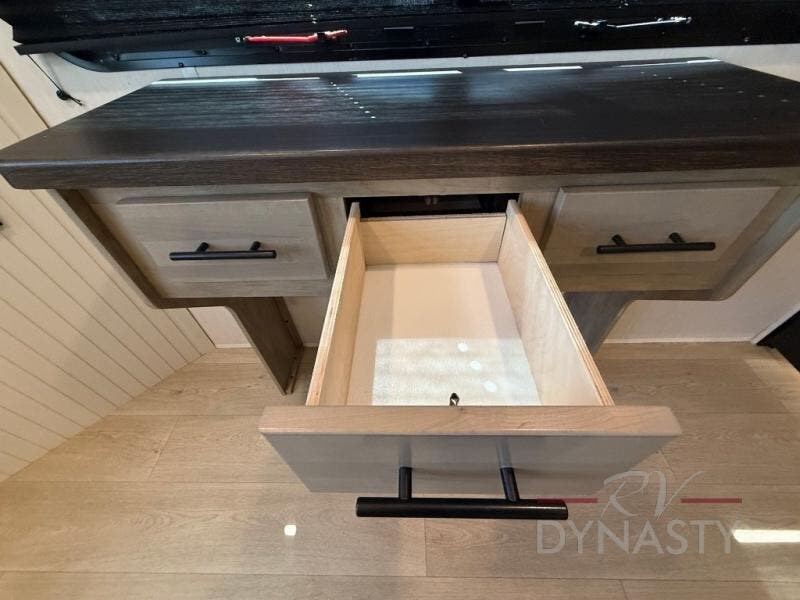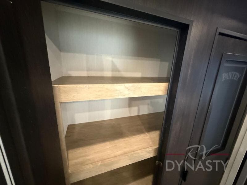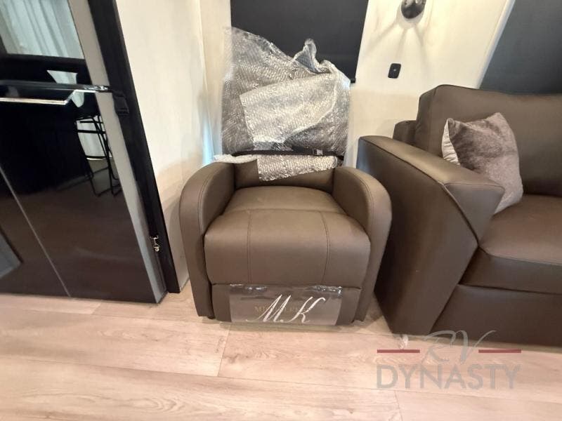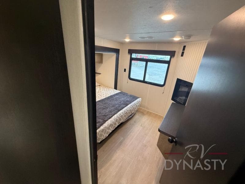 Time spent in this destination trailer will be time well spent! You will appreciate dual entry doors for maximum convenience, plus a spacious full bath that is close by the front private bedroom! Your crew can relax in the middle living area on the L-shaped hide-a-bed sofa or on the two lounge chairs. The rear kitchen will be any chef's dream with its island with six stools and all the appliances to create meals each day. This model also features triple slides so you can enjoy more space to relax. The front bedroom includes a king bed slide out, a desk with drawers, and a bedroom fireplace. And above this room is where you'll find the spacious loft with two bunk mats, storage, and space for the little ones to play!