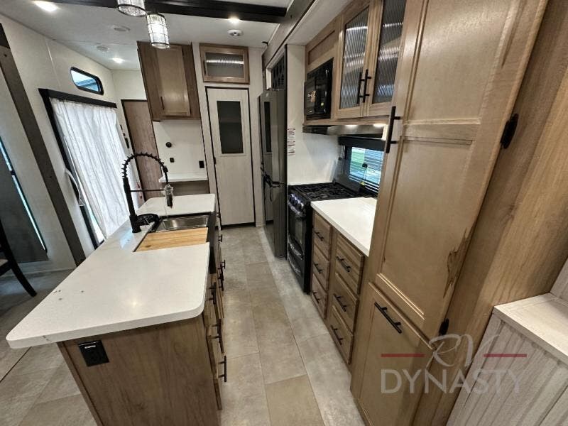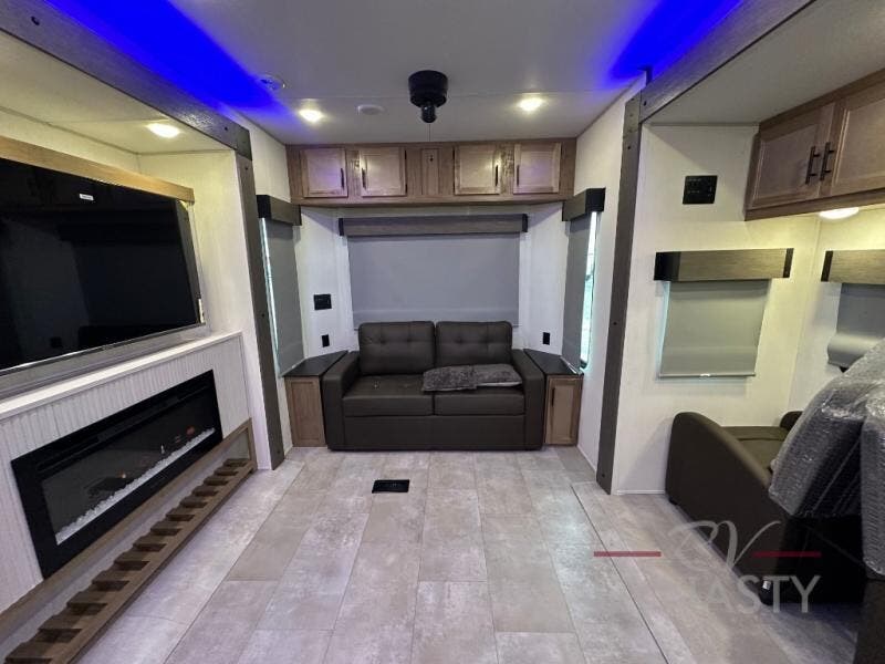Spacious and comfortable describe this destination travel trailer featuring triple slides with dual opposing slides in the living area which creates a wide open space for a dinette with chairs, two lounge chairs, an entertainment center with a fireplace, and a hide-a-bed sofa along the very front wall. The roadside slide also houses the kitchen appliances which include a refrigerator, stove and microwave oven. There is a pantry and a hutch adjacent to the slide, and a kitchen island for more food prep space. A centrally located half bath is convenient just inside the main patio door entry. Towards the rear of the coach, a private bedroom featuring comfortable sleeping along with storage space for your clothing. In the very back, a master suite bath featuring a vanity with dual sinks, a shower with a seat, linen storage, and a wardrobe with washer and dryer prep.