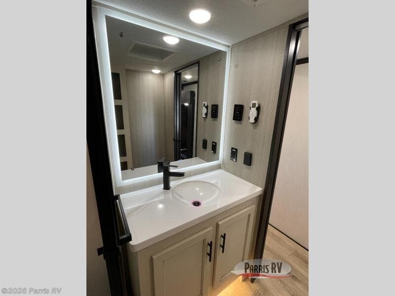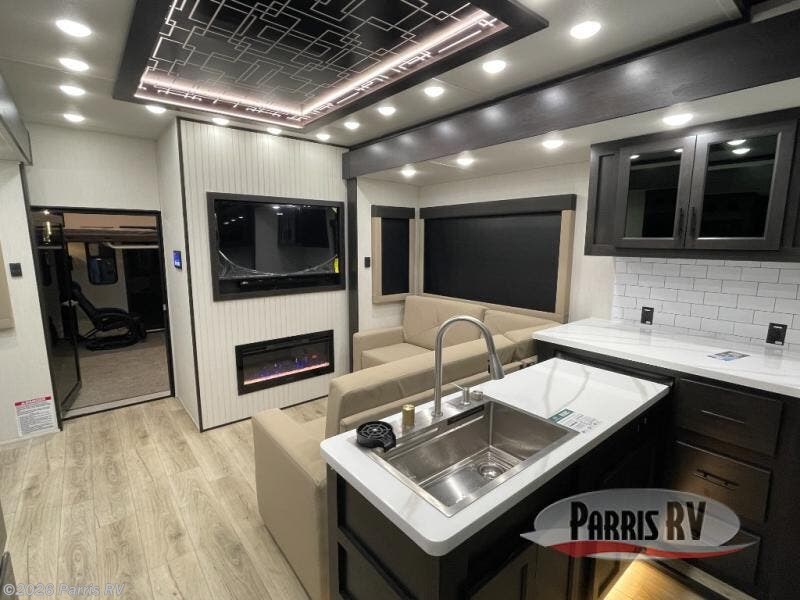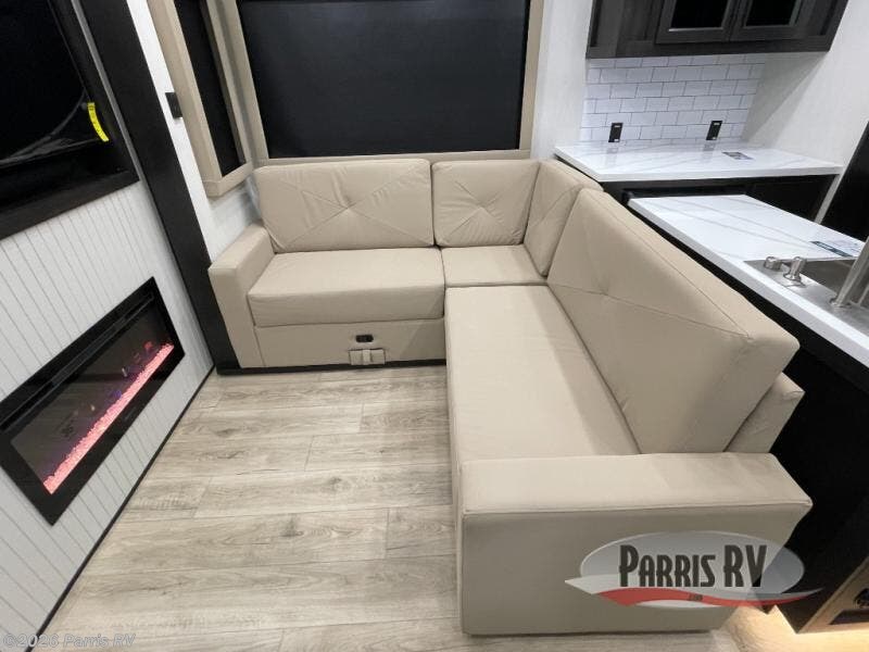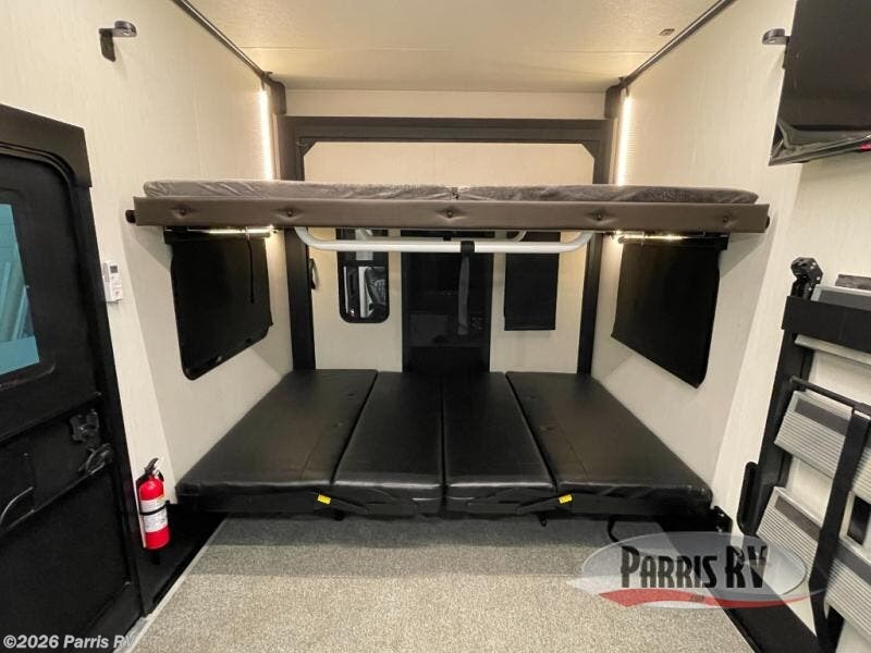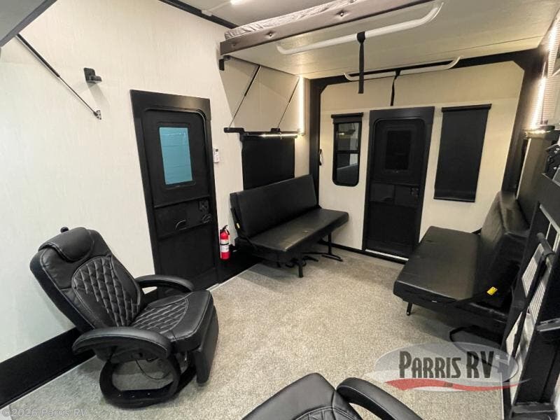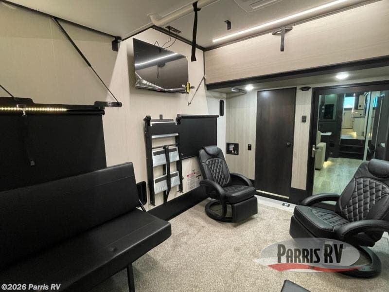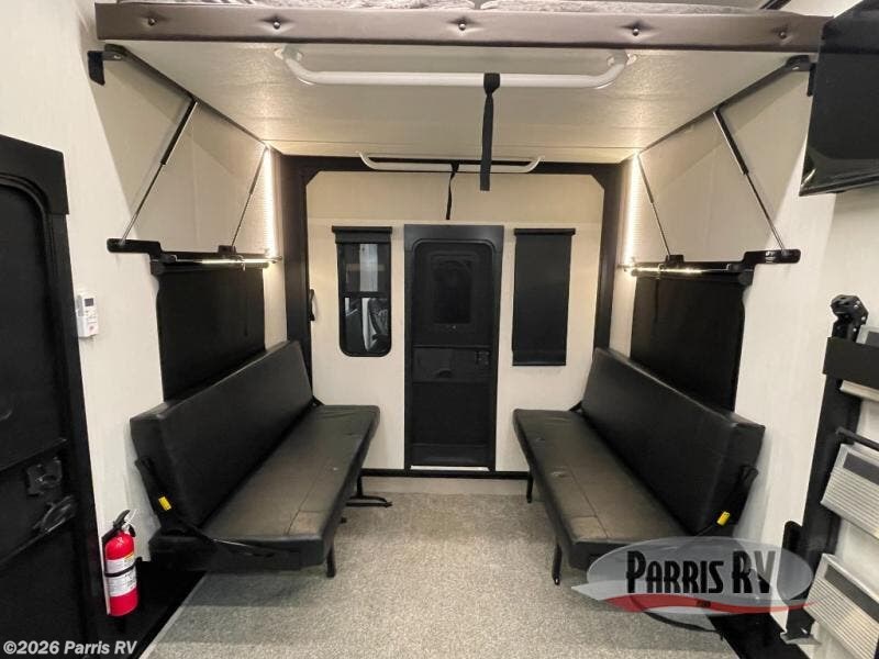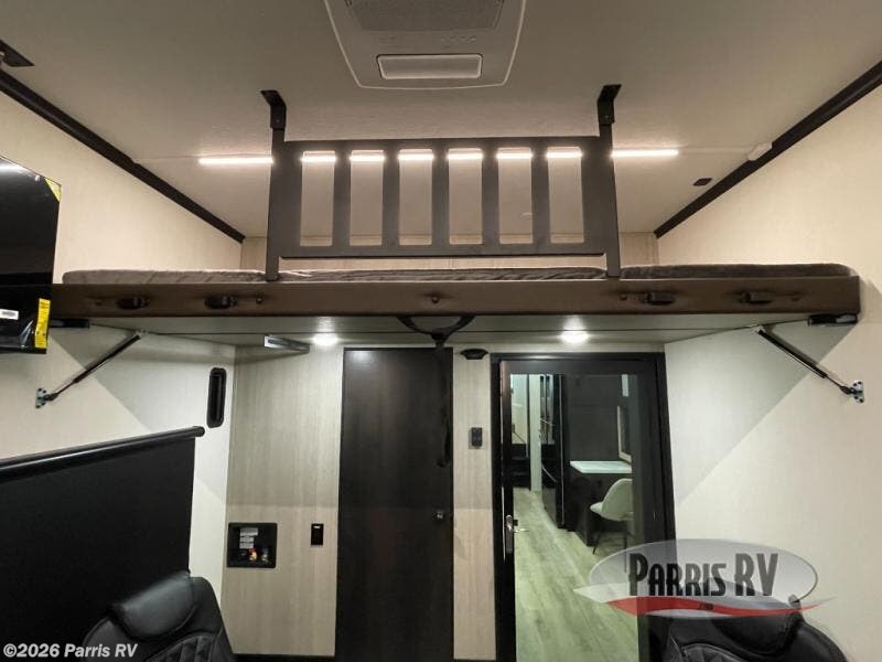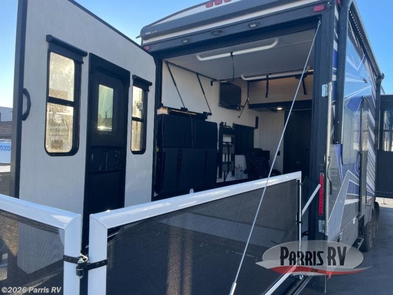 Make each adventure count in this spacious toy hauler for eight! Once you've unloaded the toys from the 13' separate garage, you can utilize the two flip-up sofas with a queen bed above. There is also a half bath here and a ladder leading to the loft! The main living area includes an L-shaped sofa across from the LED flatscreen TV and fireplace, allowing you to have movie nights, and the full kitchen includes ample counter space to set out snacks. A residential style four-burner range and residential size microwave will let you make meals for your crew every day, and there is a pantry plus 12V refrigerator for food storage. You're sure to appreciate the dual bath sinks in the full bath, and you'll feel right at home in the front private bedroom with a king bed slide, dresser, and front wardrobe.